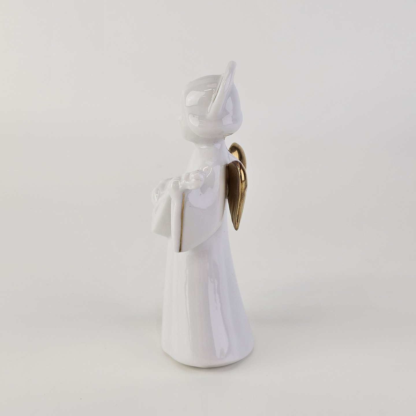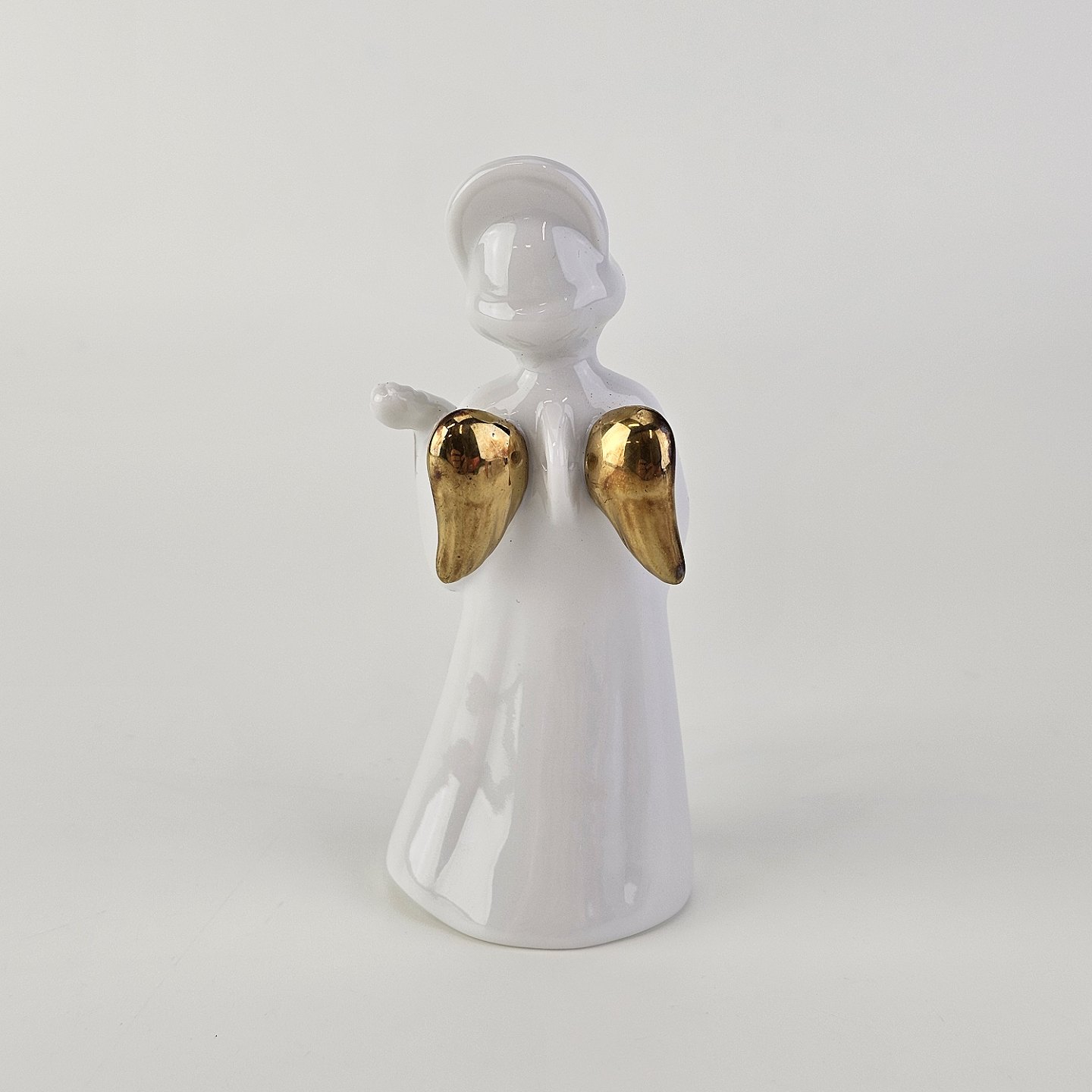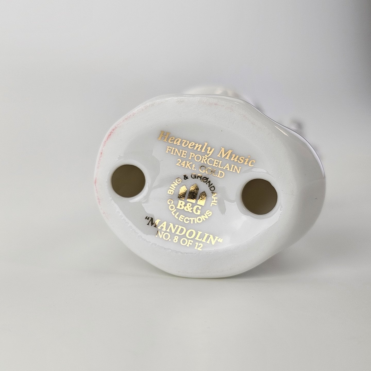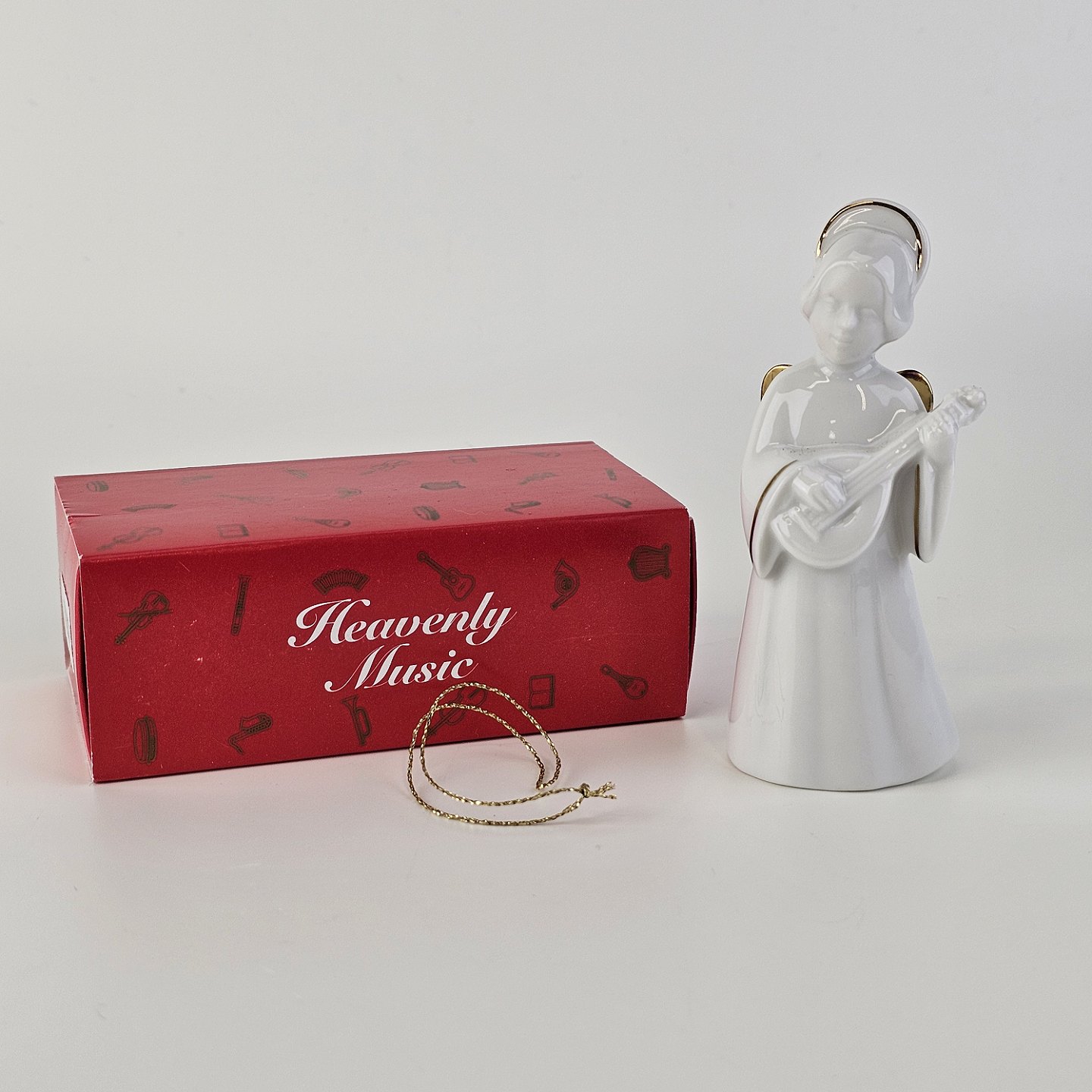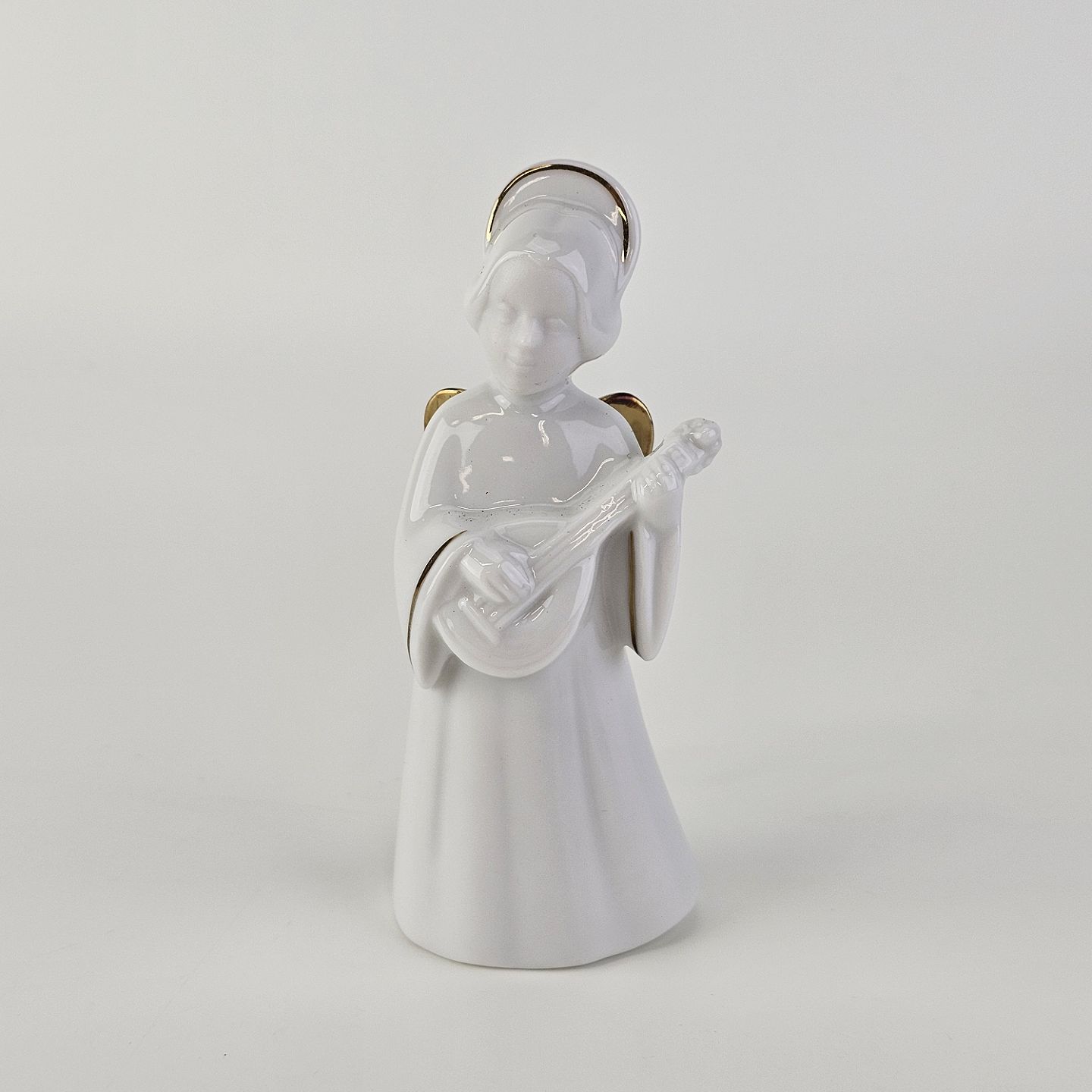 Figur med motiv af en engel som spiller på mandolin. Figuren er i hvidt porcelæn med forgyldte vinger og detaljer i 24 karat guld. 12 af 12 i serien Heavenly Music med titlen Mandolin