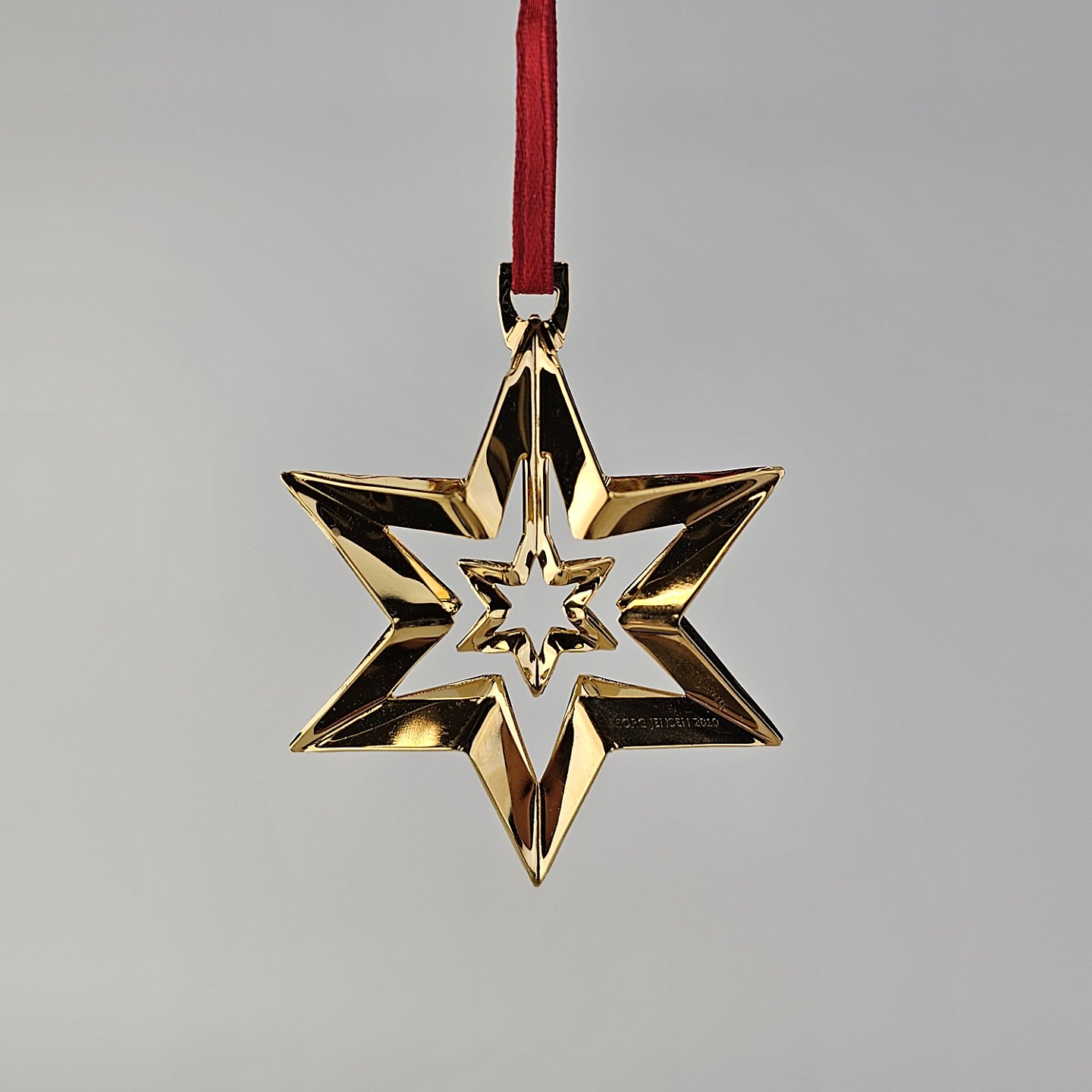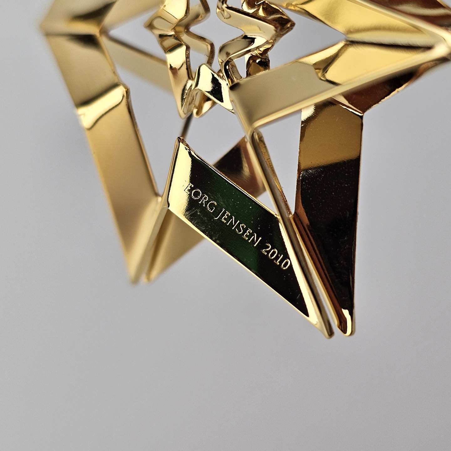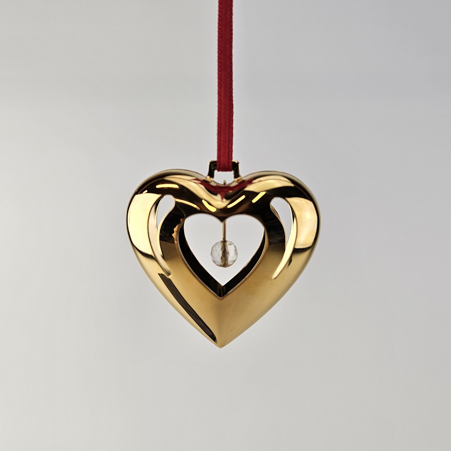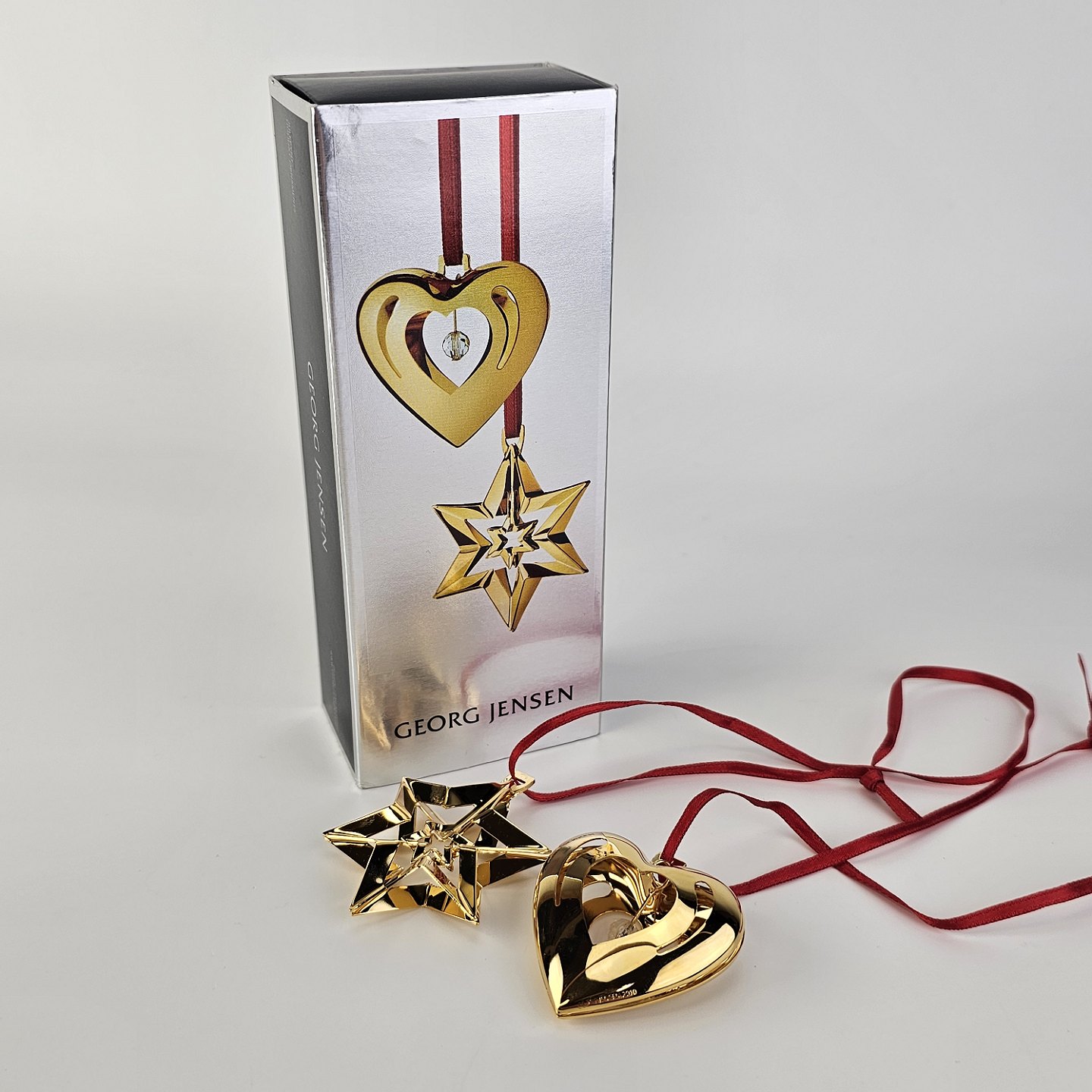 To juleornamenter til ophæng med form af et hjerte og en stjerne i messing forgyldt med 24 karat guldÅrets julepynt 2010, kommer i original kasse