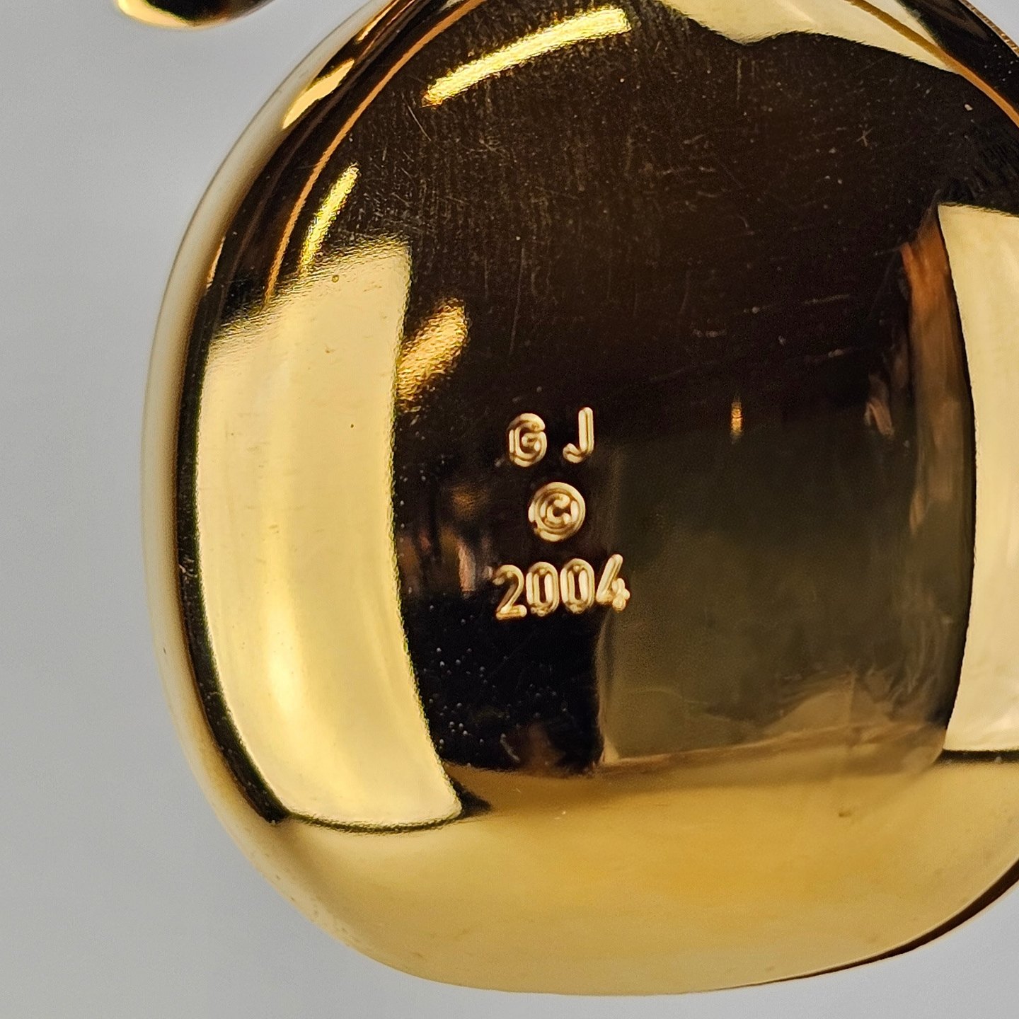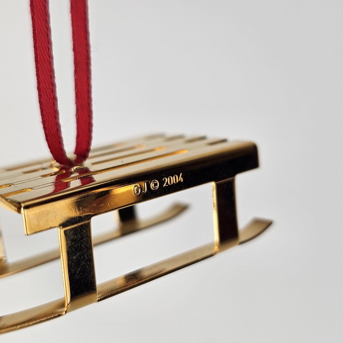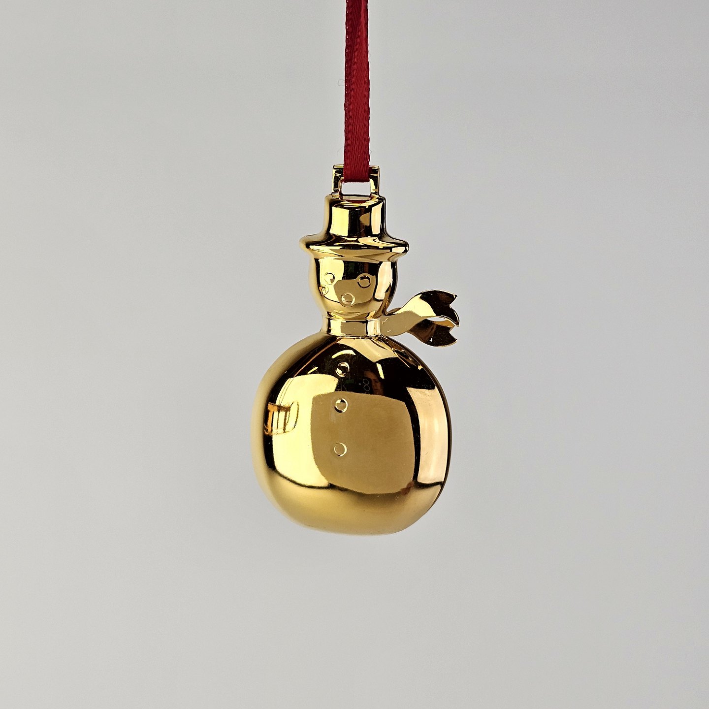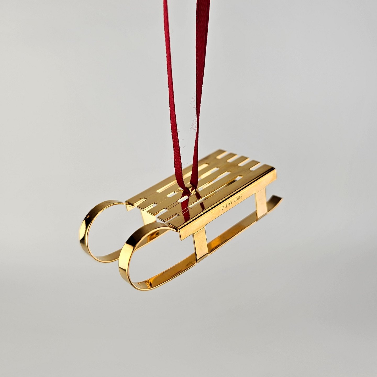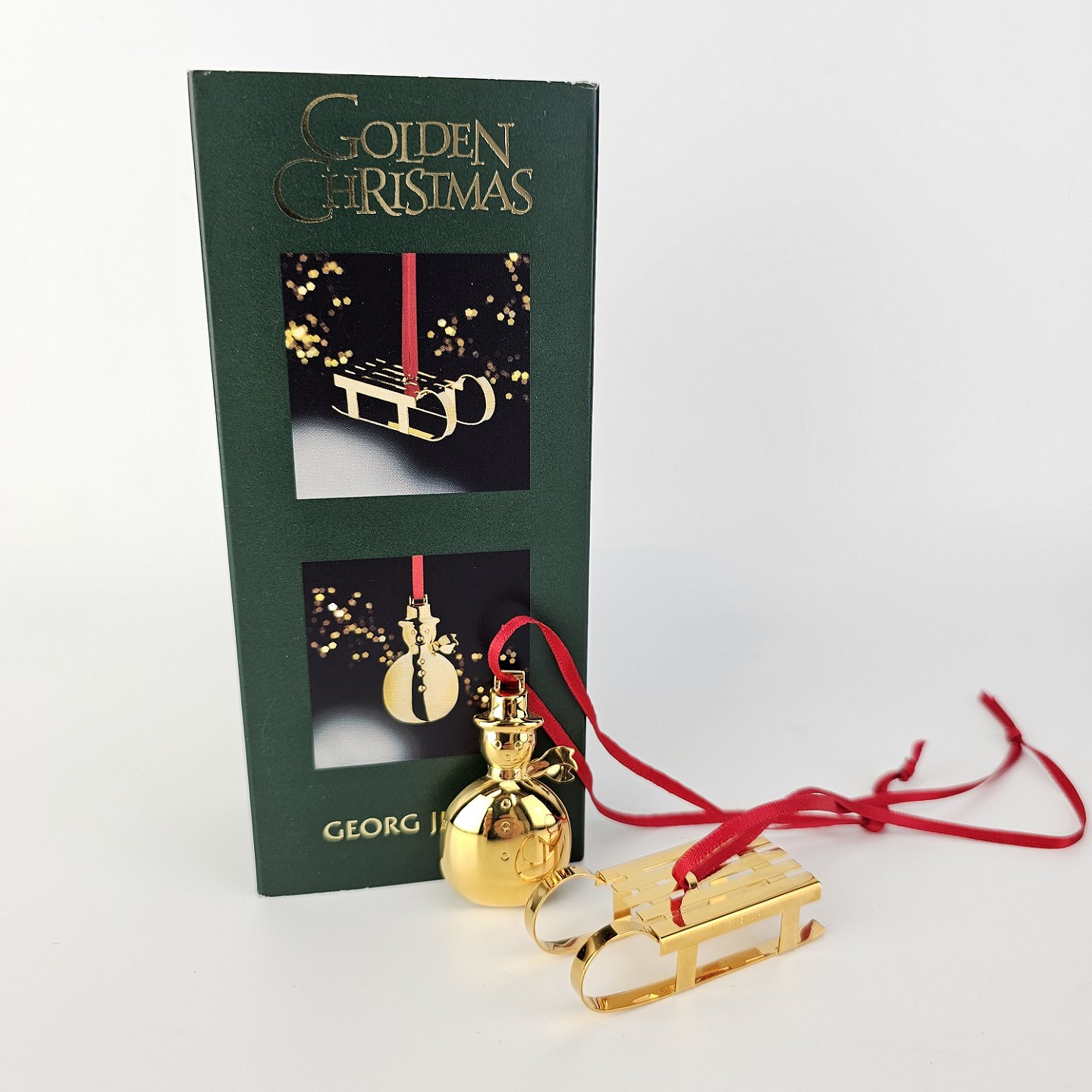 To juleornamenter til ophæng med form af en snemand og en kælk i messing forgyldt med 24 karat guldÅrets julepynt 2004, kommer i original kasse