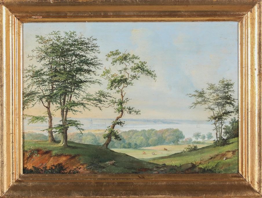 Holm, Peter (1798–1875) Dänemark: Sommerlandschaft mit Blick auf die Bucht von Aarhus und die Stadt. Blick von Frederikshøk, Højbjerg. Öl auf Metallplatten. Signiert: PH 1846. 18 × 25 cm.Gerahmt: 22 x 30 cm. Gerahmt in einem modernen, vergoldeten Rahmen.