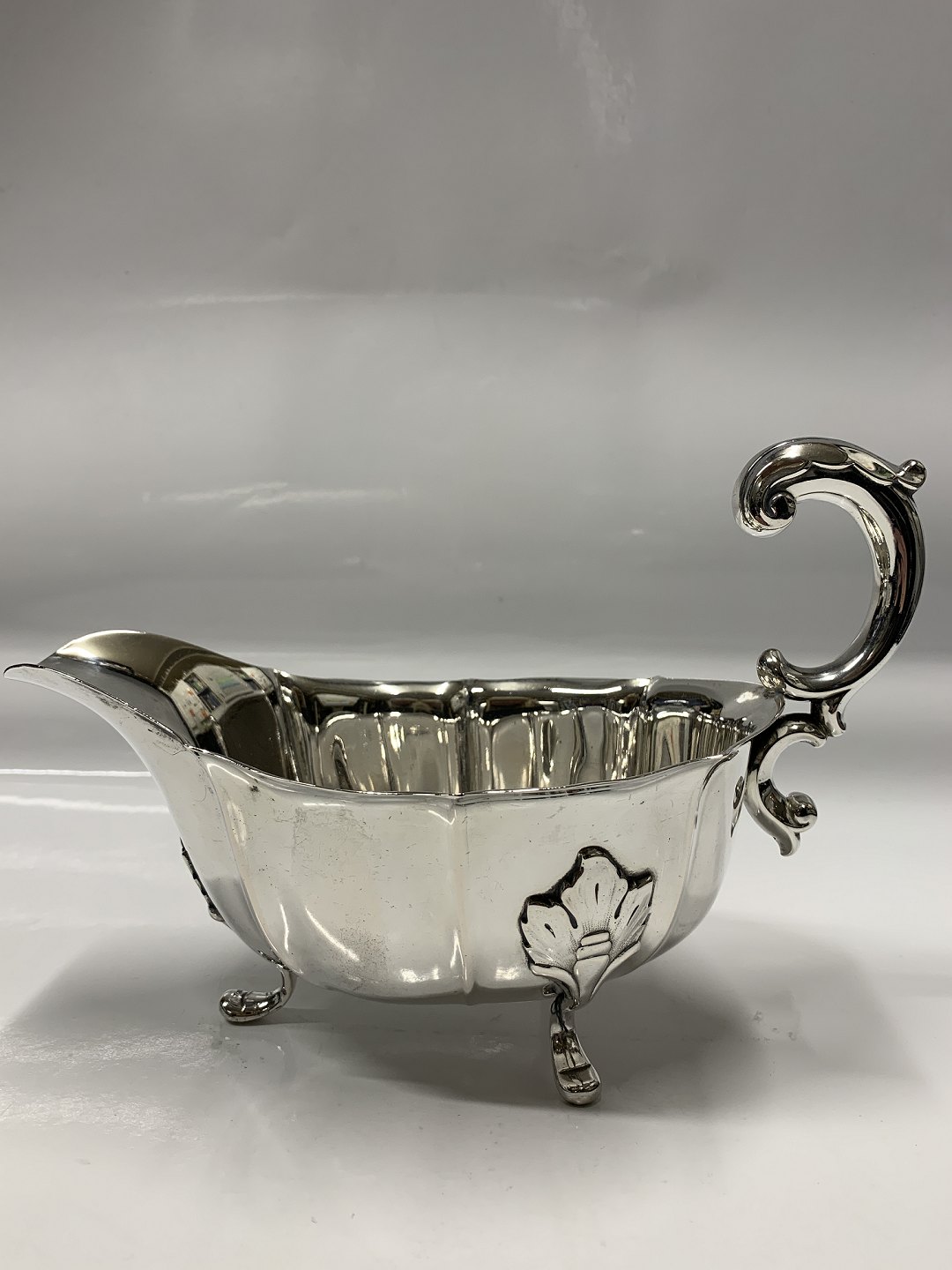 Sølv sovseskål på tre fødder .Carl M. Cohr.Længde 20,5 cm.
