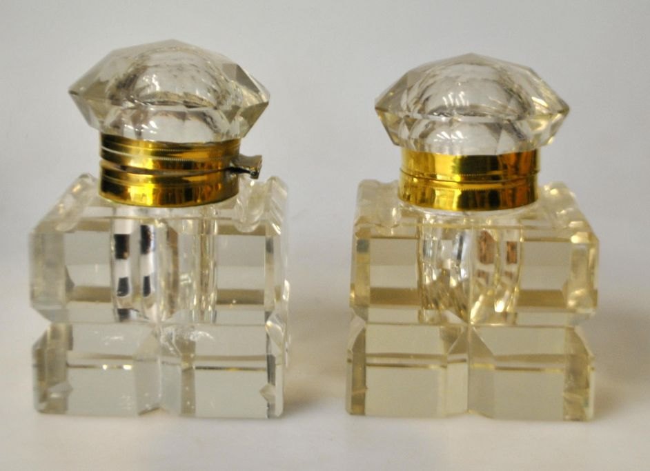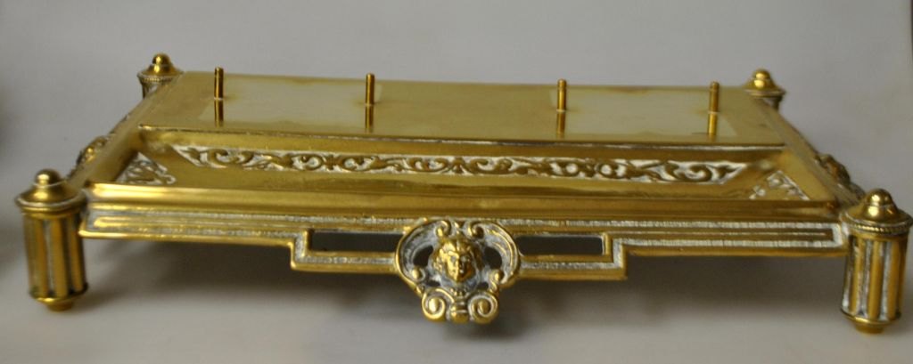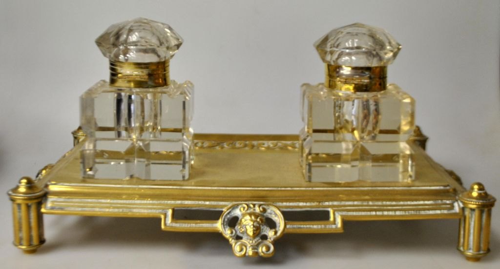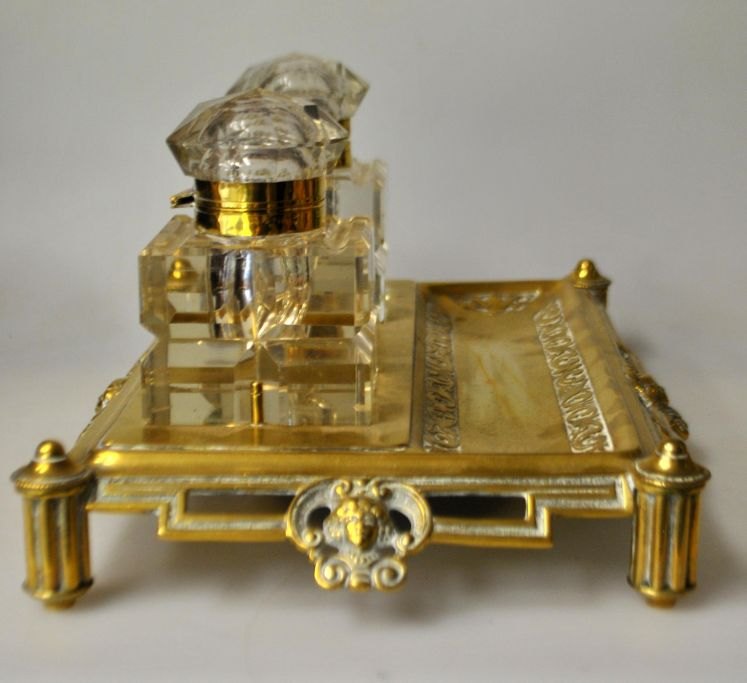 Antikes Schreibset aus Messing mit Kristallbehältern, Deutschland, 19. Jahrhundert. Schale mit Engelsköpfen verziert. L.: 29 cm. B.: 23 cm. H.: 15 cm.Bestellnummer: 28347