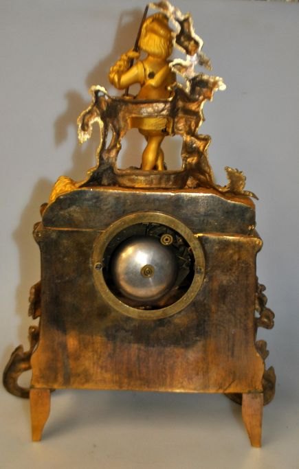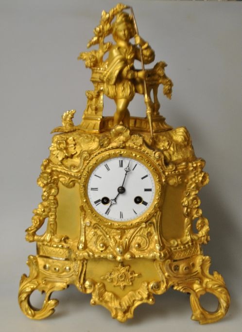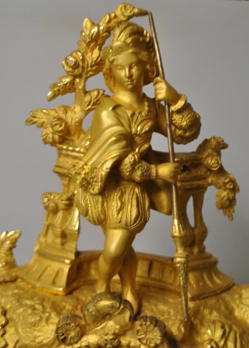 Französische vergoldete Kaminuhr, frühes 19. Jahrhundert. Uhrengehäuse mit Verzierungen. Obere Figur in Form eines stehenden Soldaten mit einem Speer. Emailzifferblatt mit römischen Ziffern. H.: 35 cm. B.: 25 cm. T: 7 cm.Super Zustand!