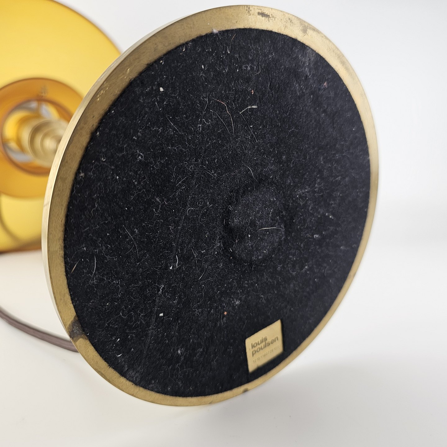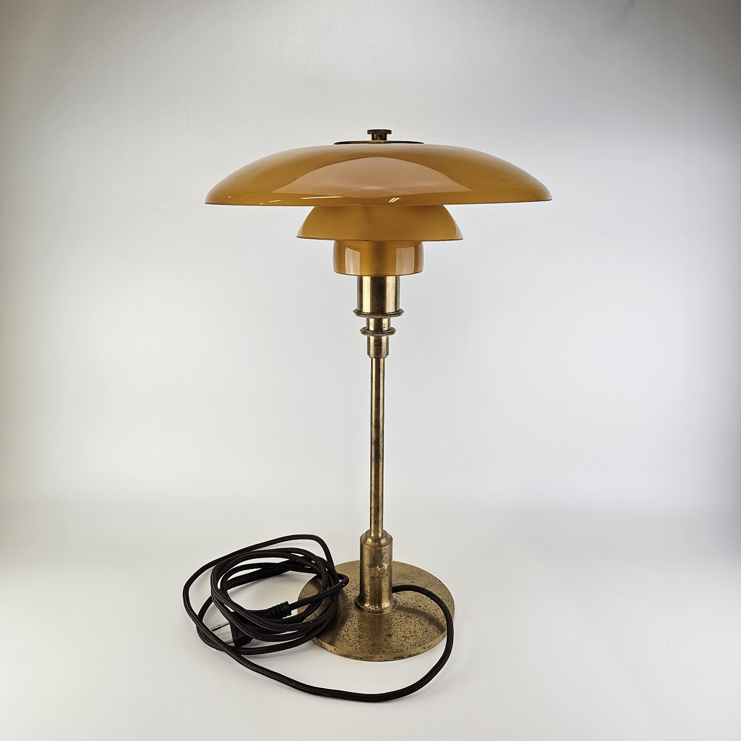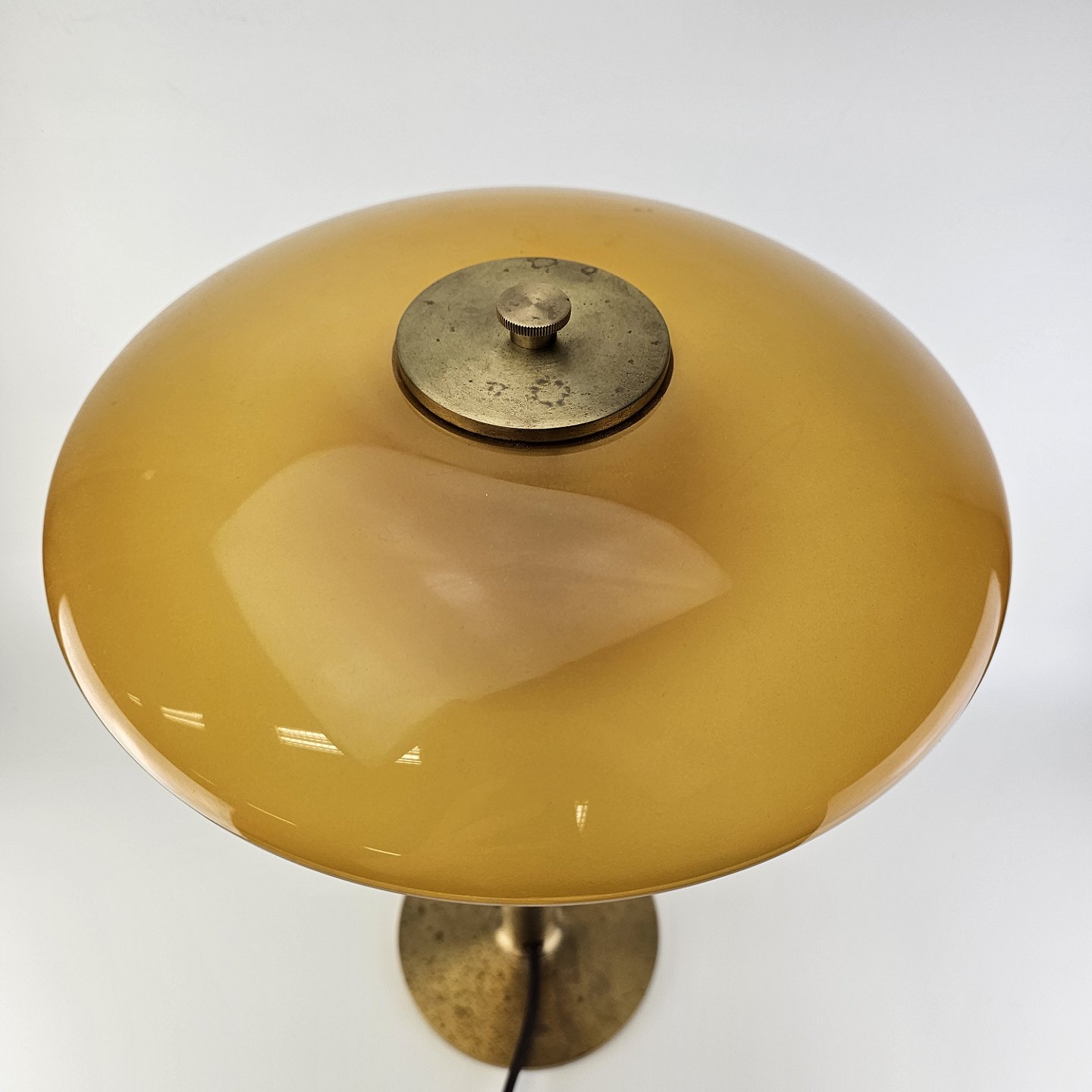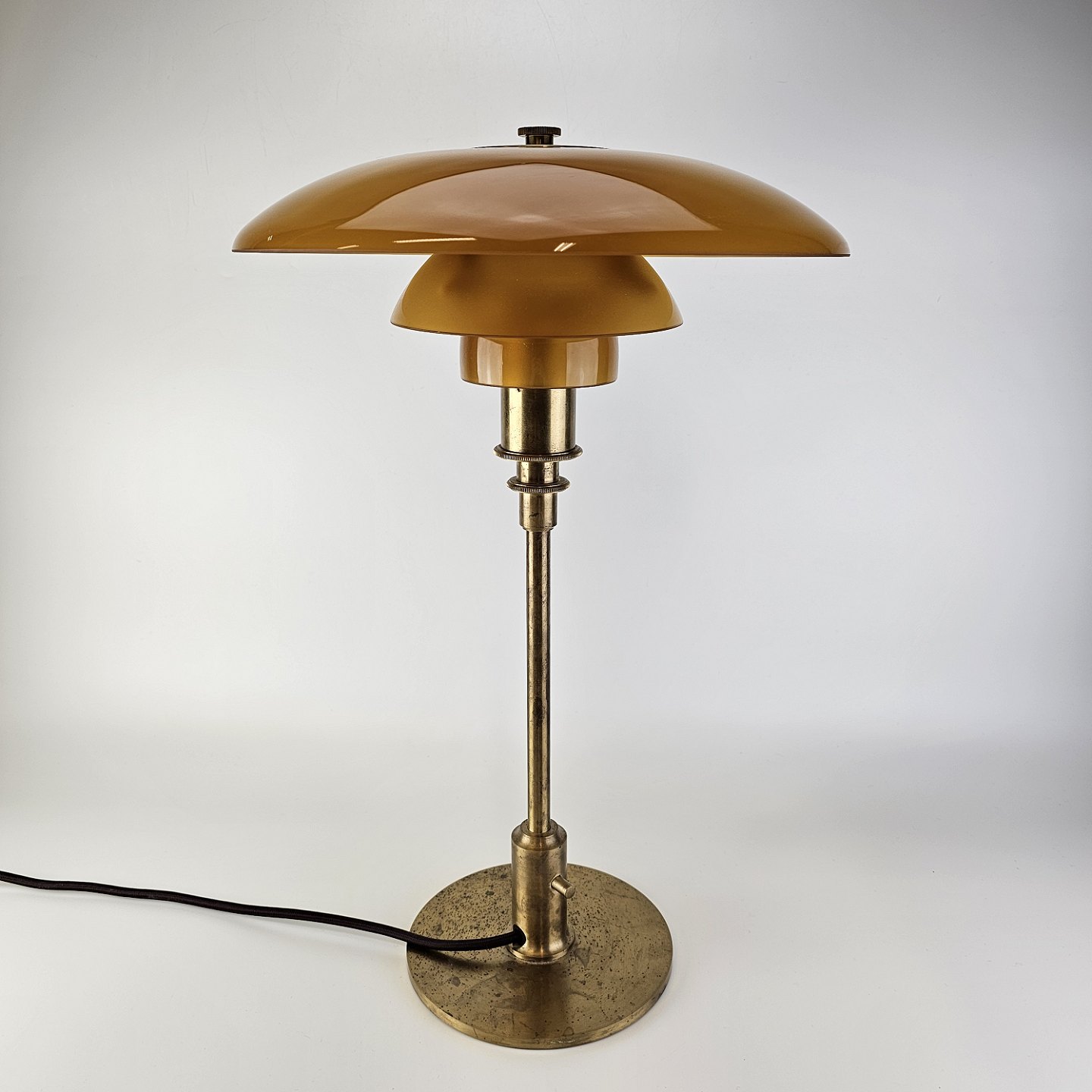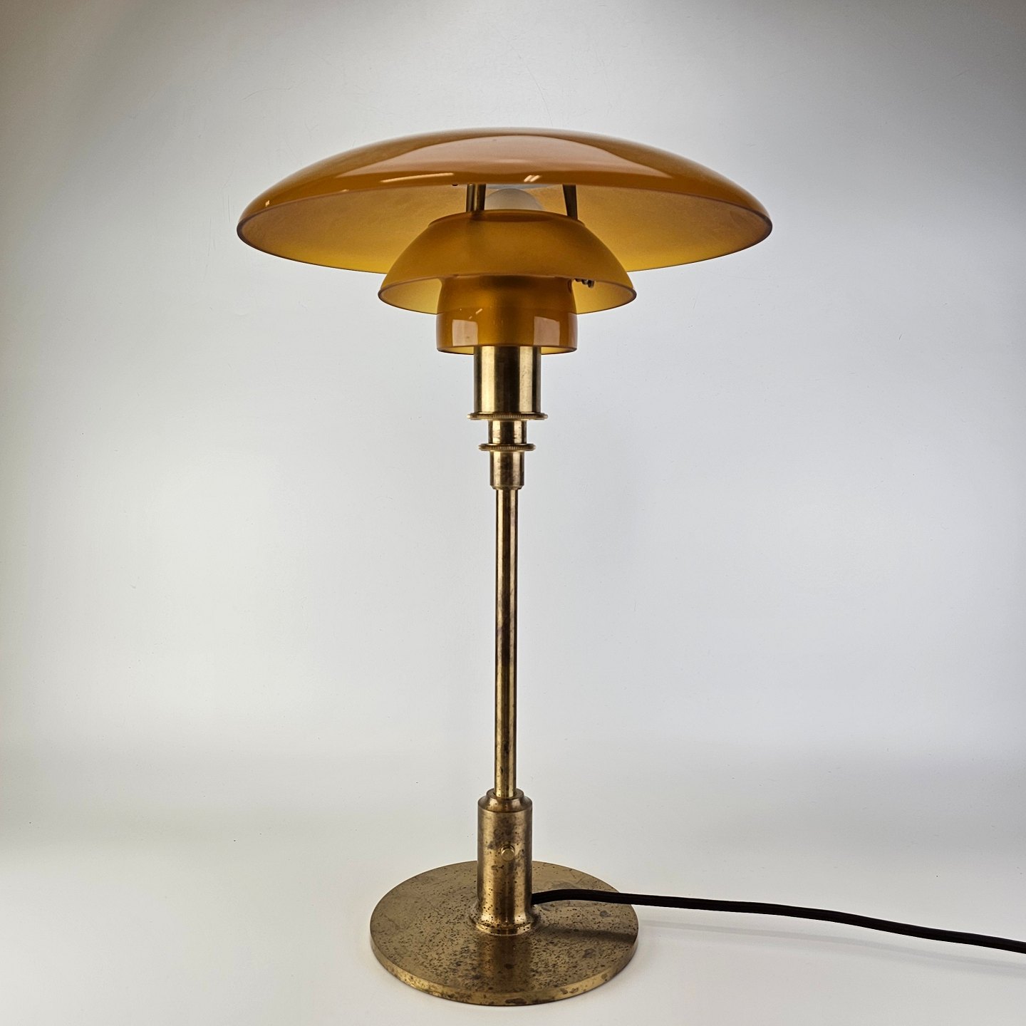 Bordlampe med skærm af mundblæst ravfarvet etlagsglas og fod af strøgslebet messing Limited edition udført efteråret 2018PH 3/2