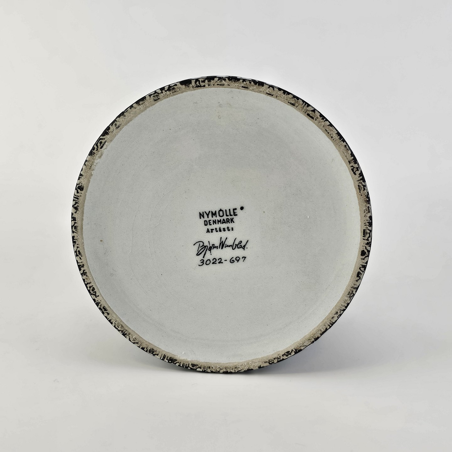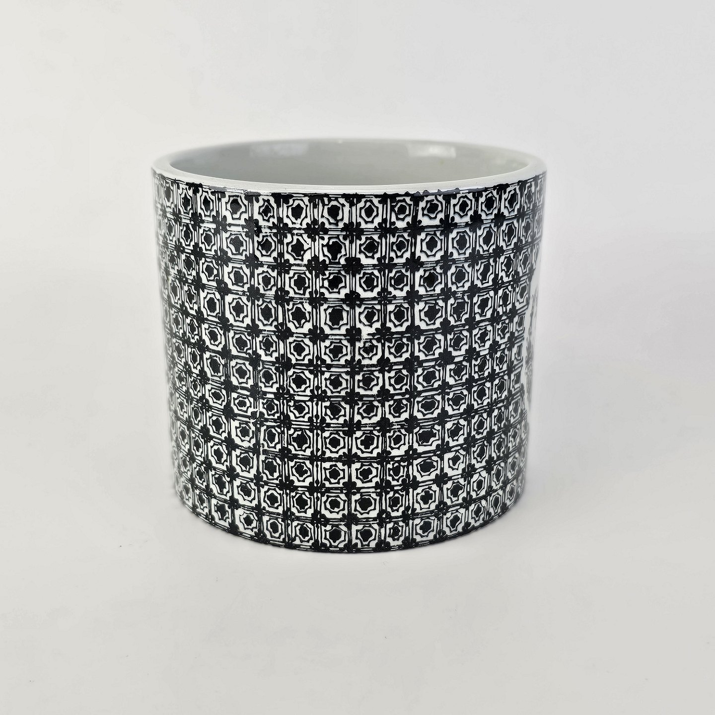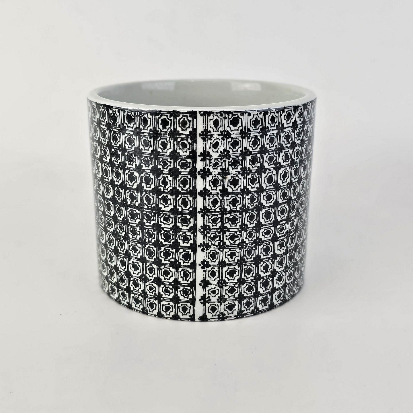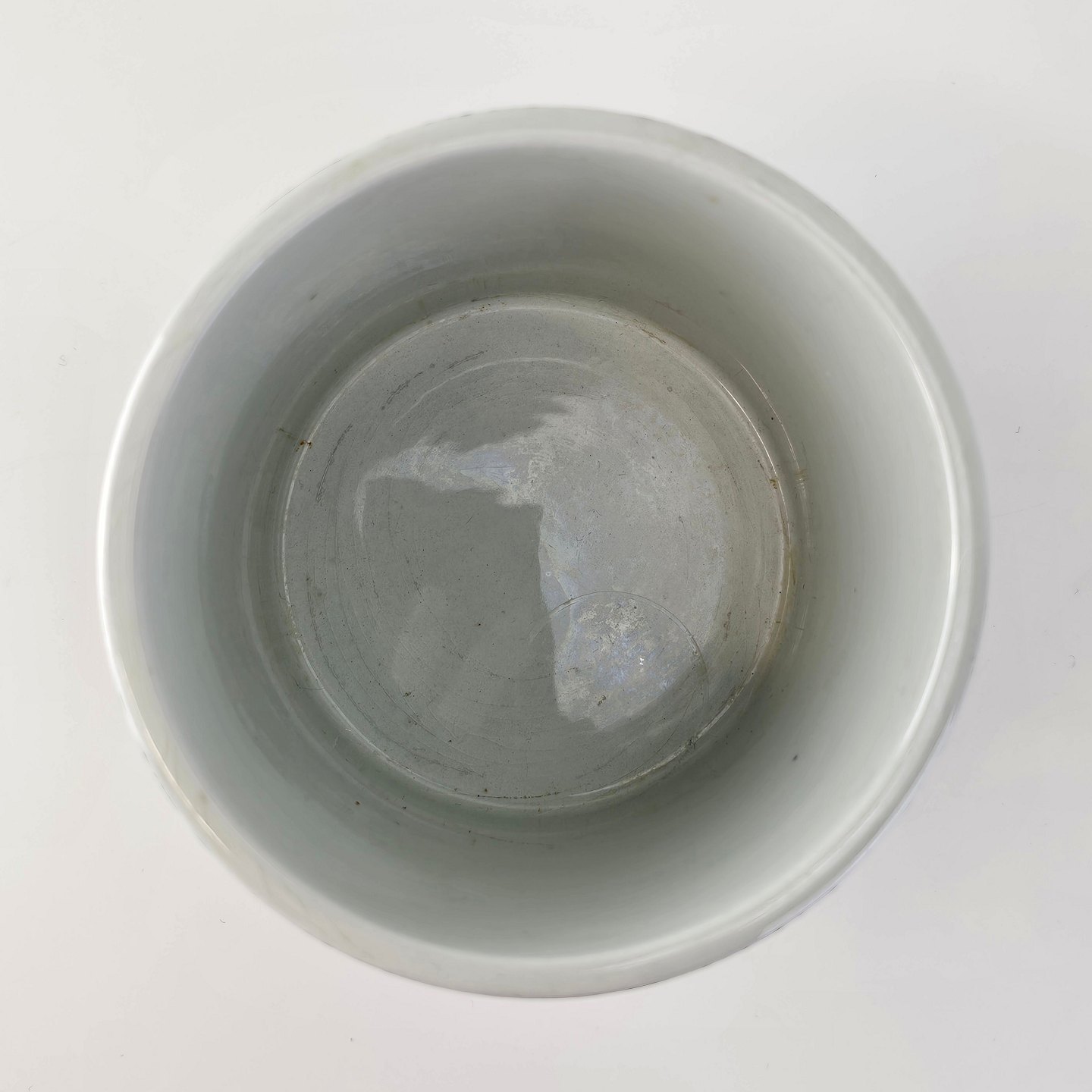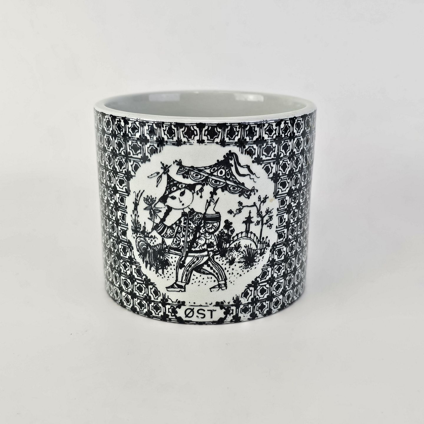 Urtepotteskjuler i porcelæn med motiv i sort streg af kineser samt titlen Øst. Nr. 3022-697Formgiver Bjørn Wiinblad