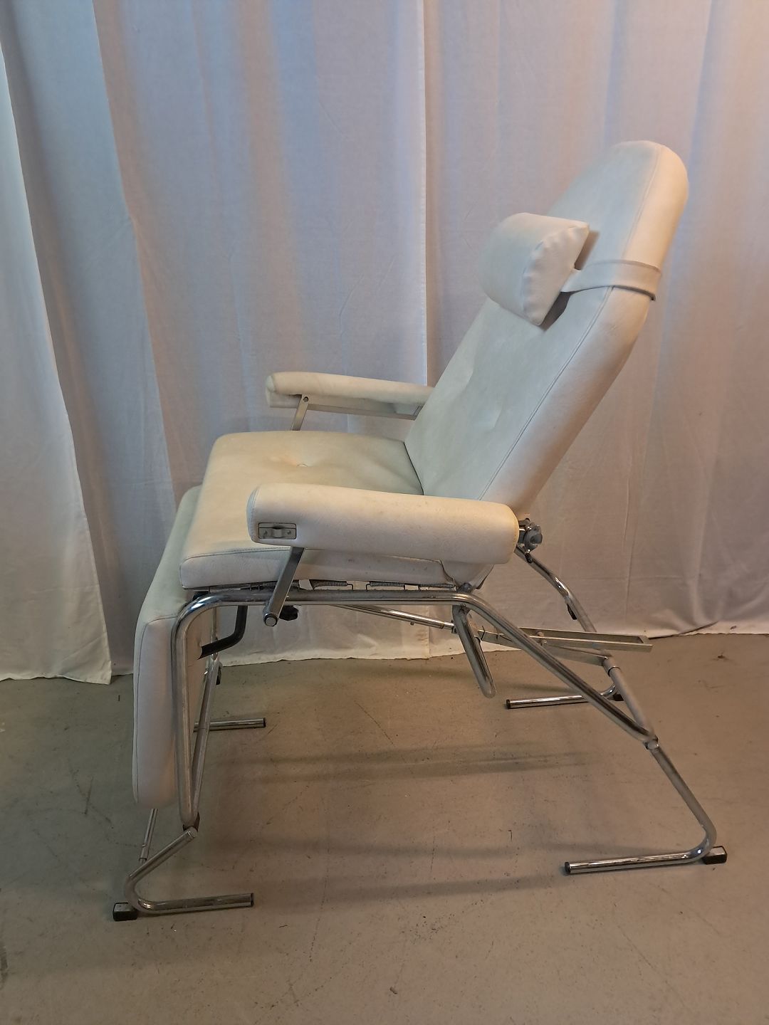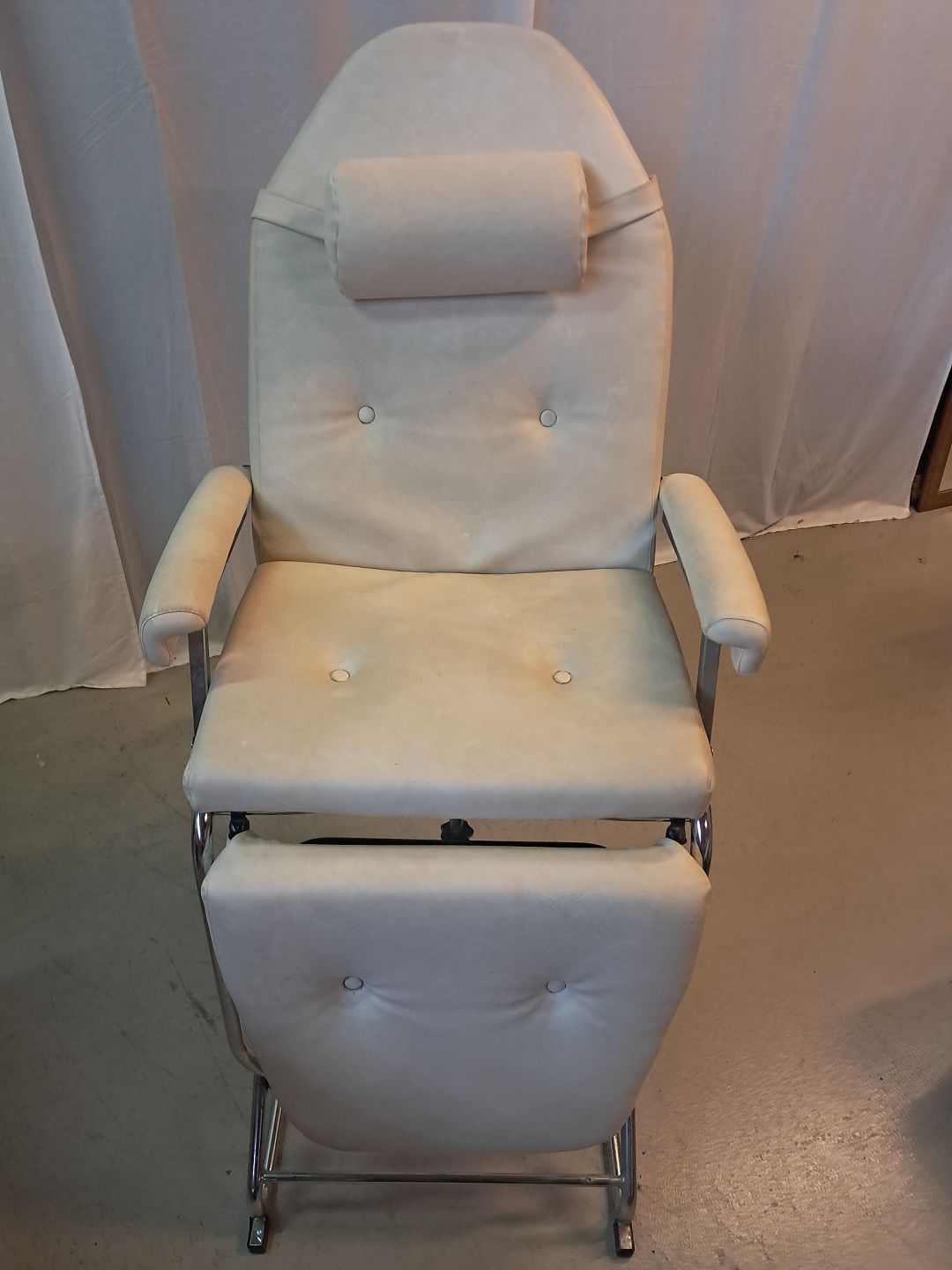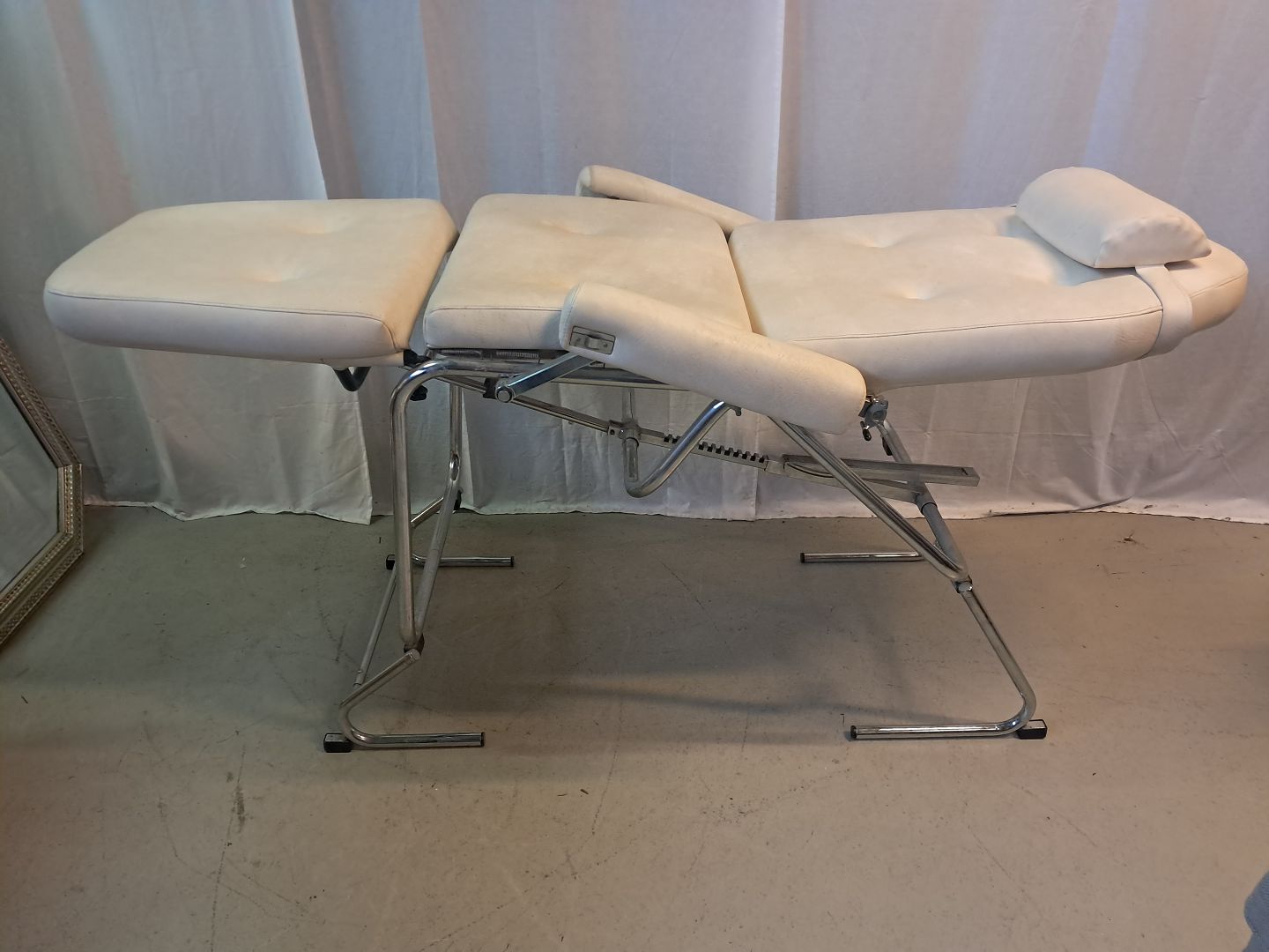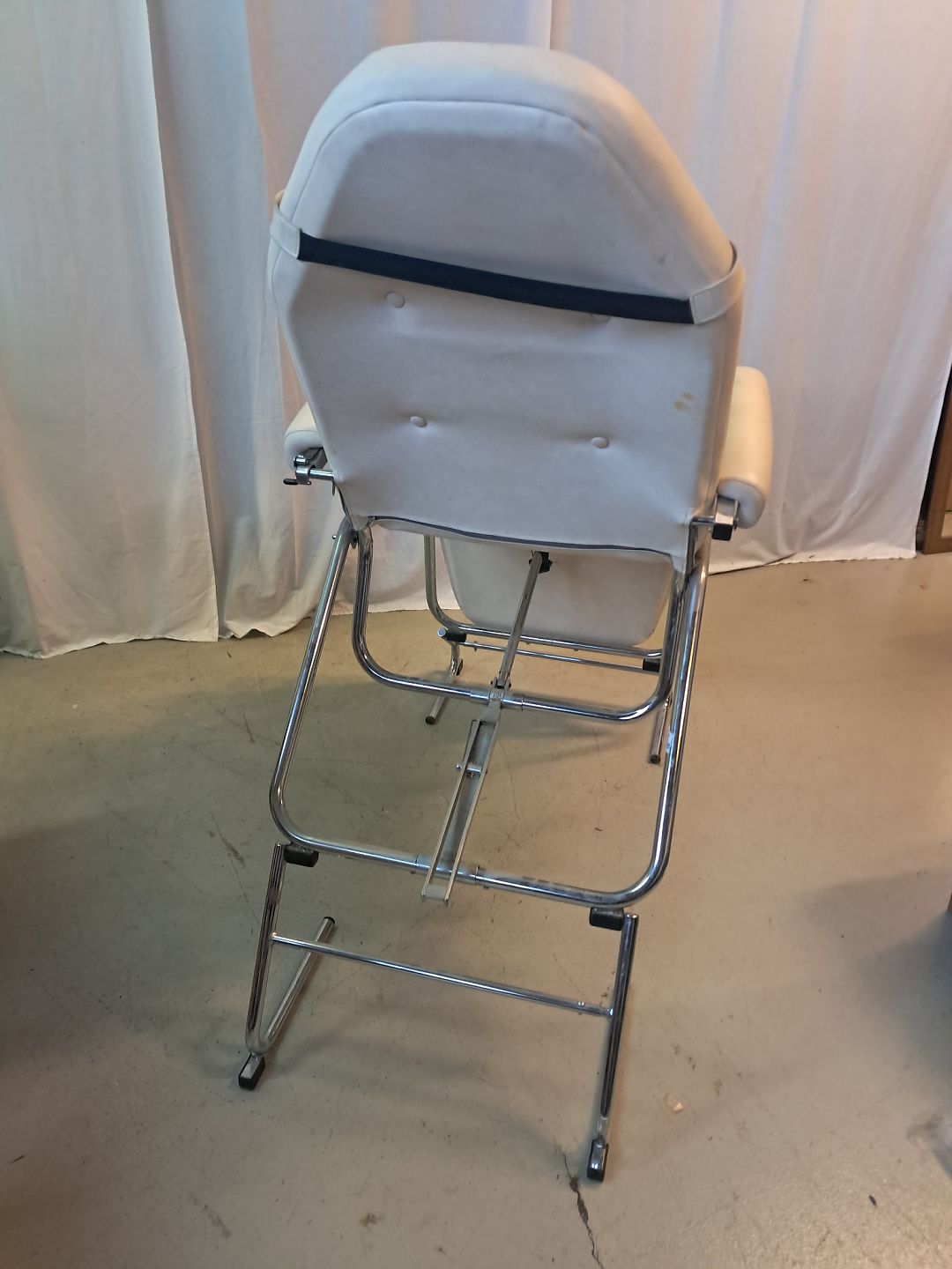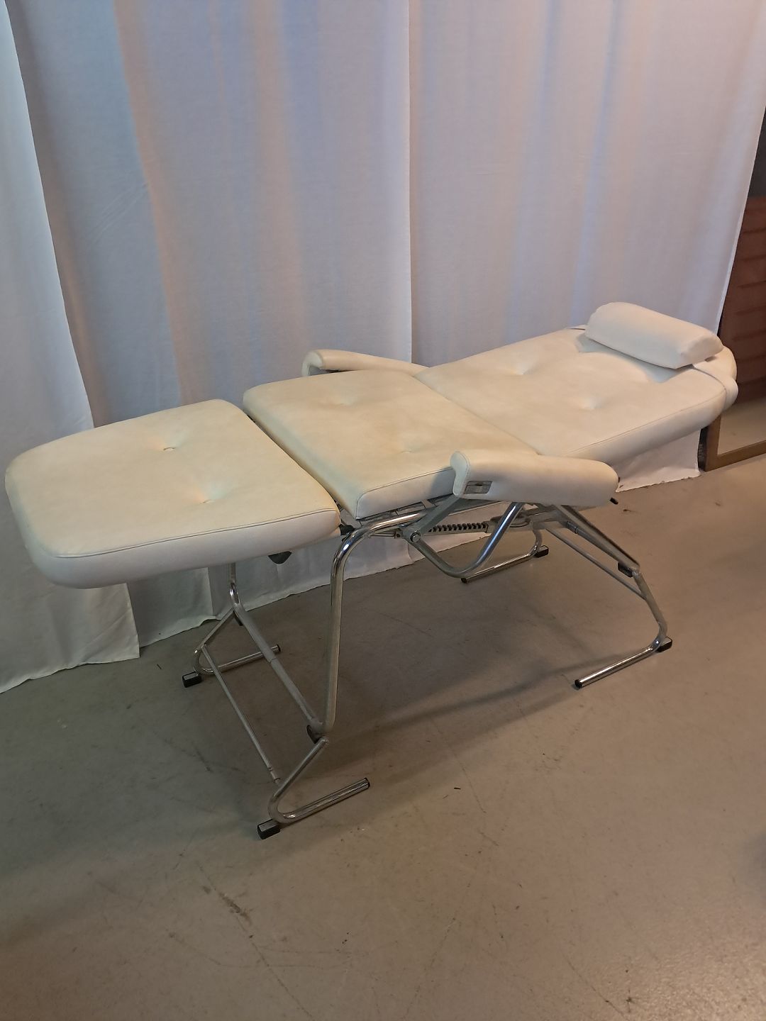 Massagse-stol og briks i metal og kunstlæder, fra 1990erne.Den har brugsspor.
