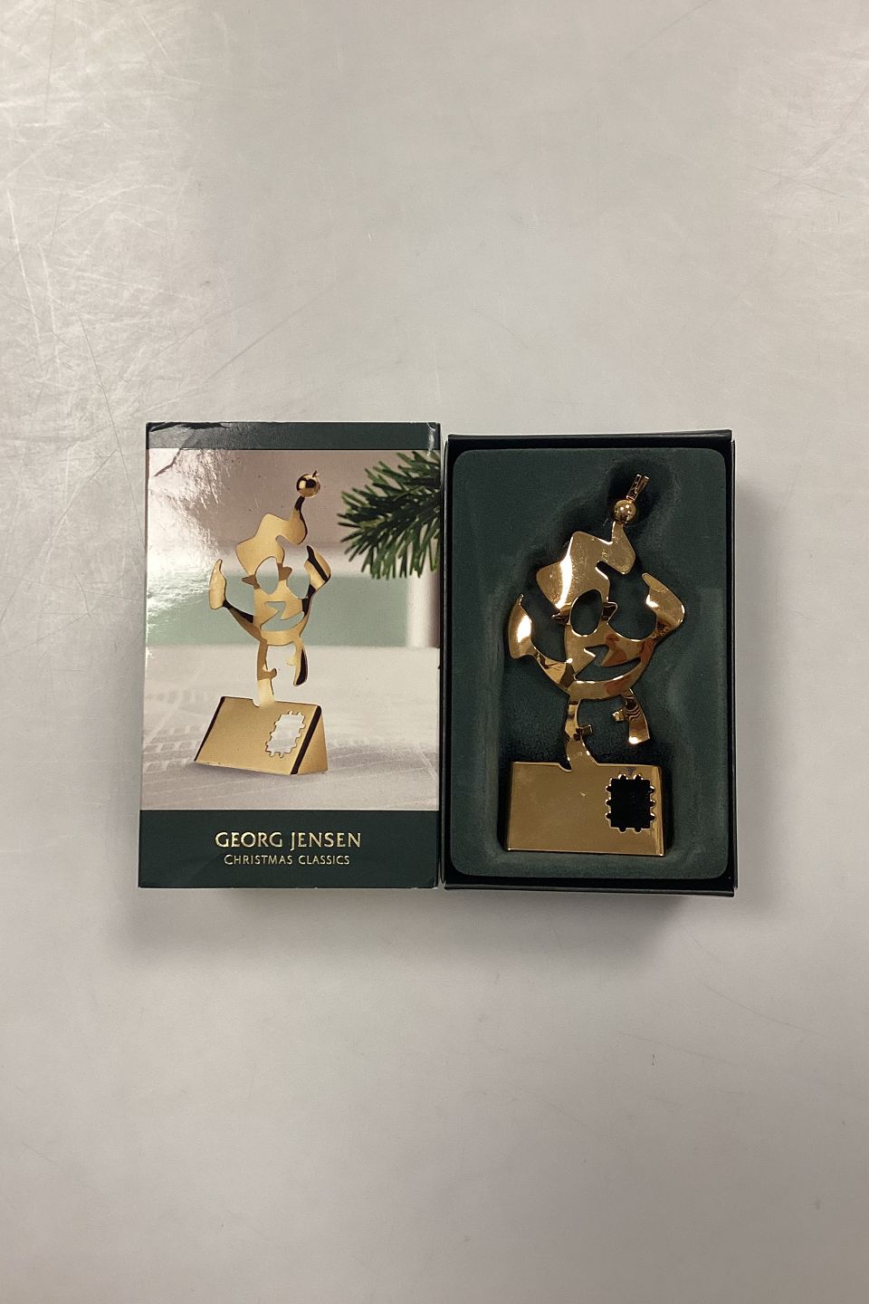 Georg Jensen Christmas Classics Julepynt - Nisse på Julekort. Designet af Leo Griffin. Stål forgyldt med 24-karat guld.Måler 10 cm / 3,93 in.