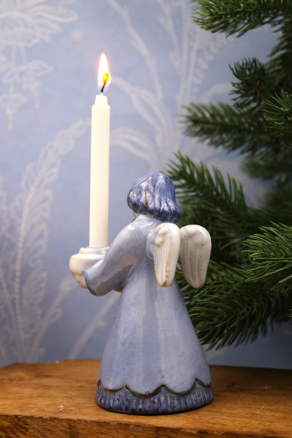 L. Hjorth keramik stor engel med blå glasurder holder et lille stearinlys.