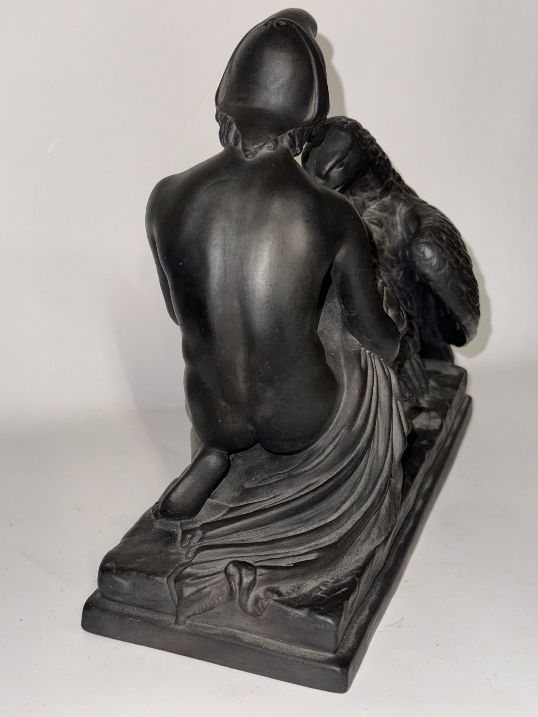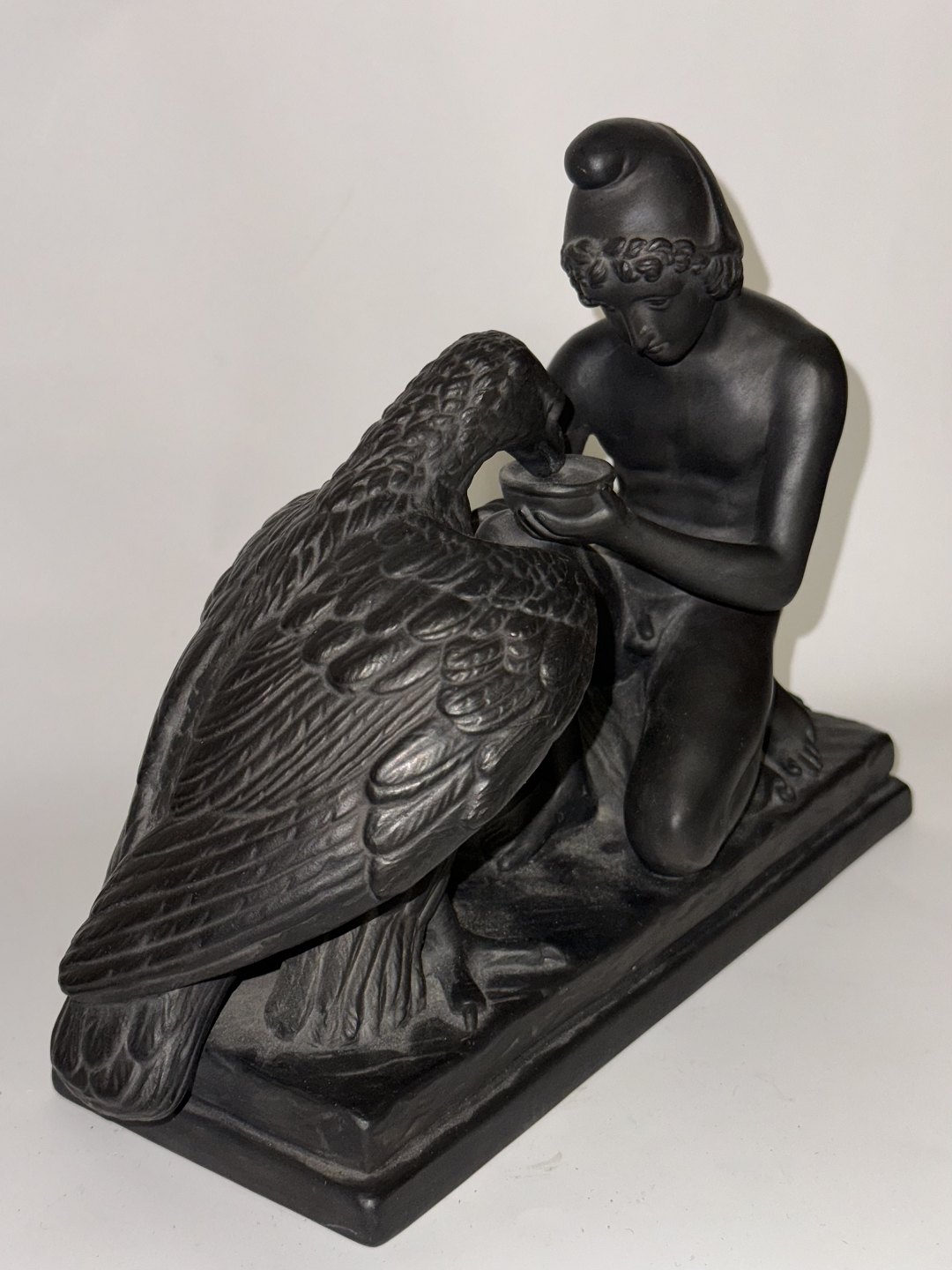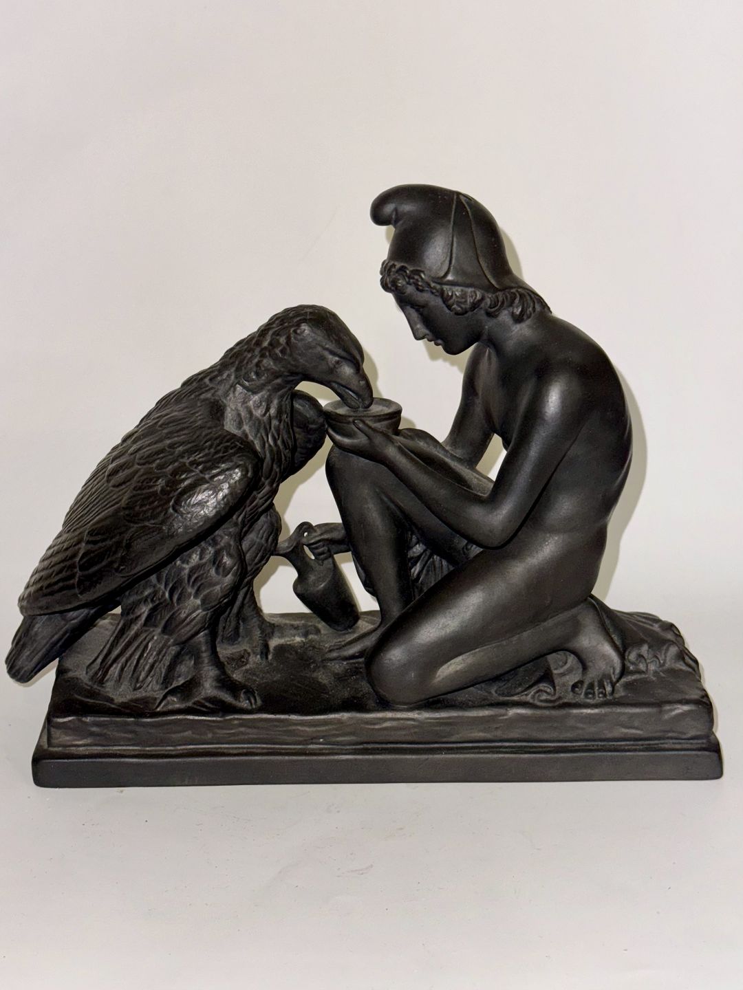 Figur i keramik (sort basalt) forestillende Ganymedes med Jupiters ørn af Bertel Thorvaldsen (1770-1844) Formgivet i Rom 1817-18. Denne kopi fra den københavnske lervarefabrik Peter Ipsen, er fremstillet omkring 1900. Ifølge den græske mytologi bortfører Jupiters ørn Ganymedes for at for at gøre ham til gudernes mundskænk (tjener). Fabriksmærket på bunden med P. Ipsen, KJØBENHAVN ENERET samt model nummer 349. Mål: H. 19 cm. Basen måler 9 x 22,5 cm