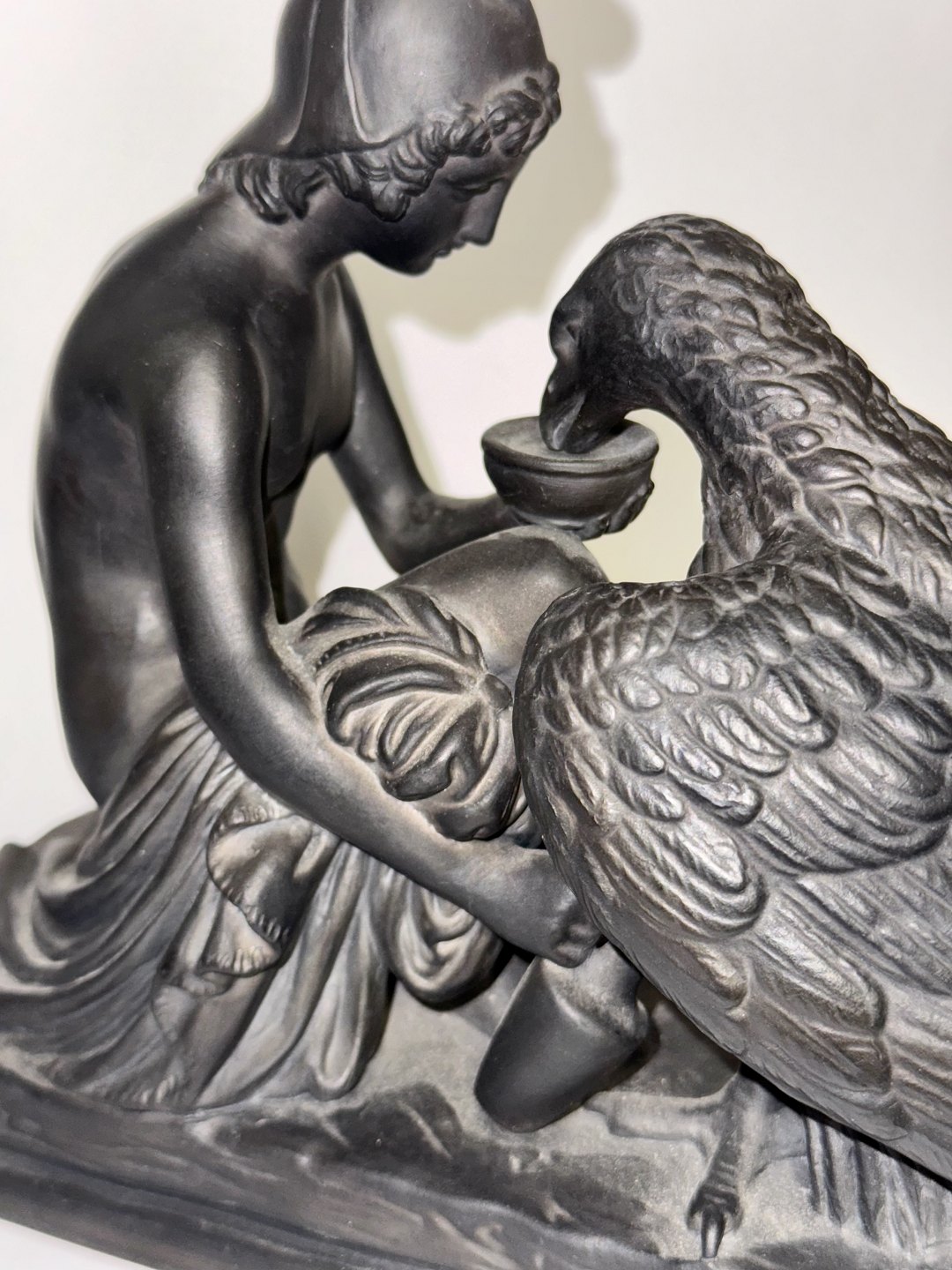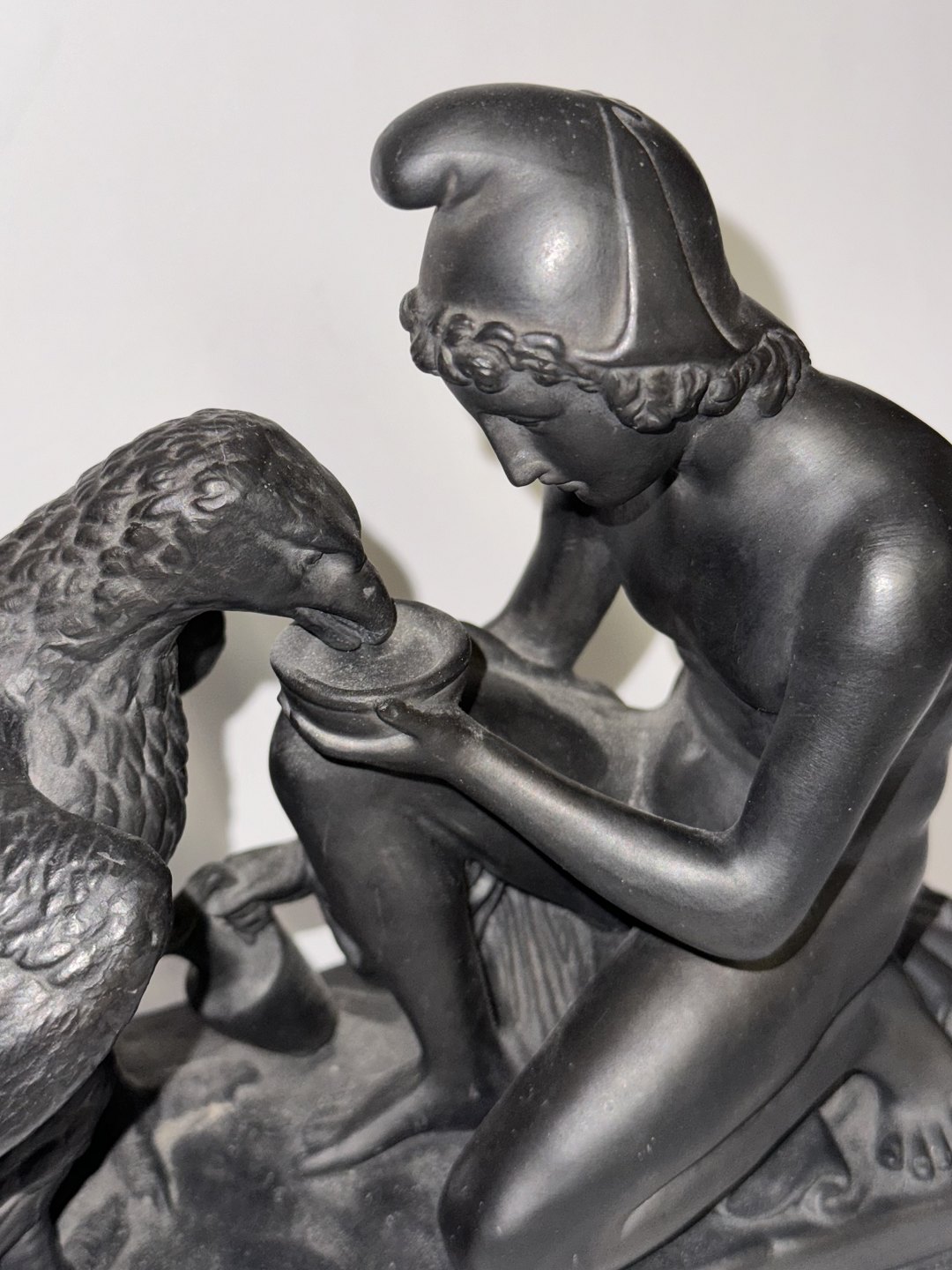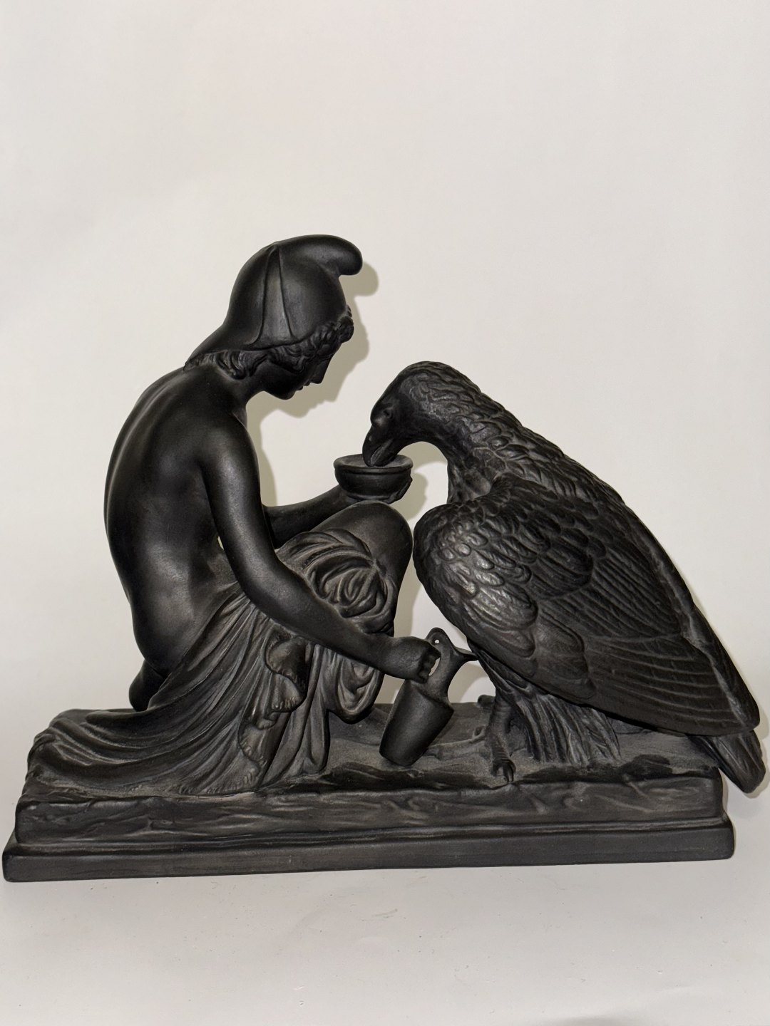 Figur i keramik (sort basalt) forestillende Ganymedes med Jupiters ørn af Bertel Thorvaldsen (1770-1844) Formgivet i Rom 1817-18. Denne kopi fra den københavnske lervarefabrik Peter Ipsen, er fremstillet omkring 1900. Ifølge den græske mytologi bortfører Jupiters ørn Ganymedes for at for at gøre ham til gudernes mundskænk (tjener). Fabriksmærket på bunden med P. Ipsen, KJØBENHAVN ENERET samt model nummer 349. Mål: H. 19 cm. Basen måler 9 x 22,5 cm