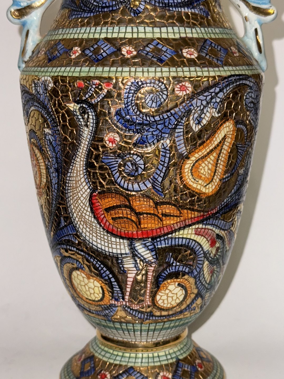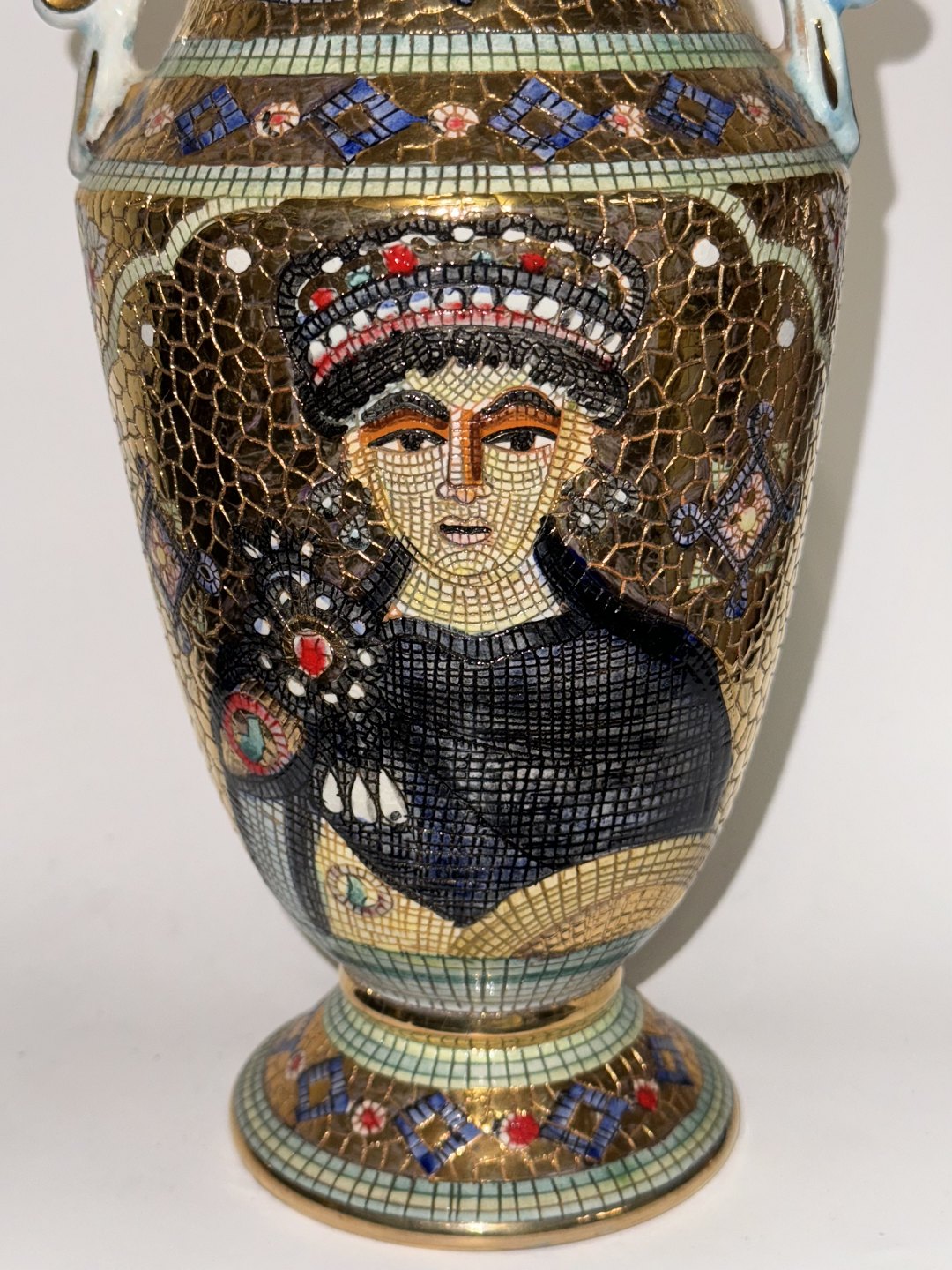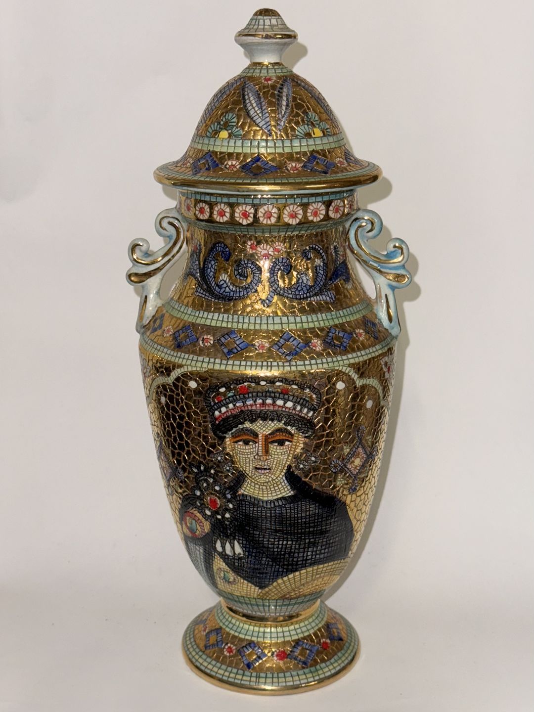 Deruta mosaik krukke med hanke og låg i majolika fremstillet i Umbrien i Italien. Motiv med afbildning af kejserinde Theodora, kejser Justinians byzantinske hustru fra det sjette århundrede, senere kanoniseret af den østlige ortodokse kirke som Saint Theodora. På bagsiden motiv med påfugl. Mosaik-designet er indgraveret med hånden, direkte på vasen, i stedet for små påsatte stykker. Emnet har et meget farvestærkt udtryk med metallisk overflade. Fremstår i god stand. Fabrikamærket på bunden. H. 33,5 cm inklusiv låg.