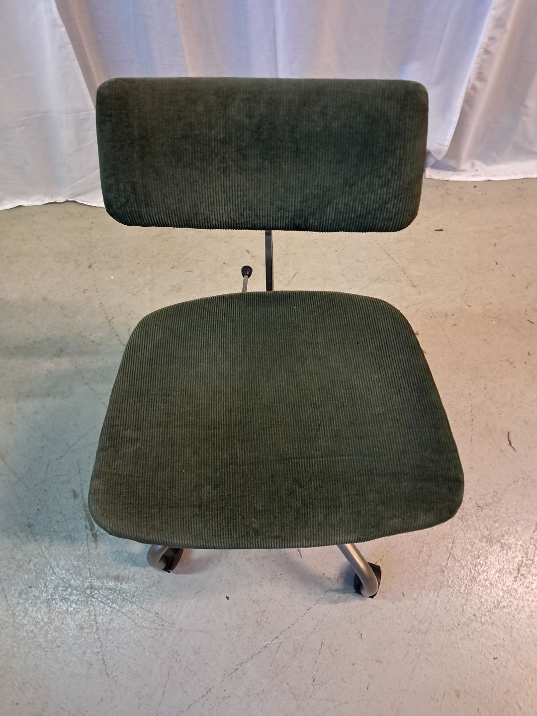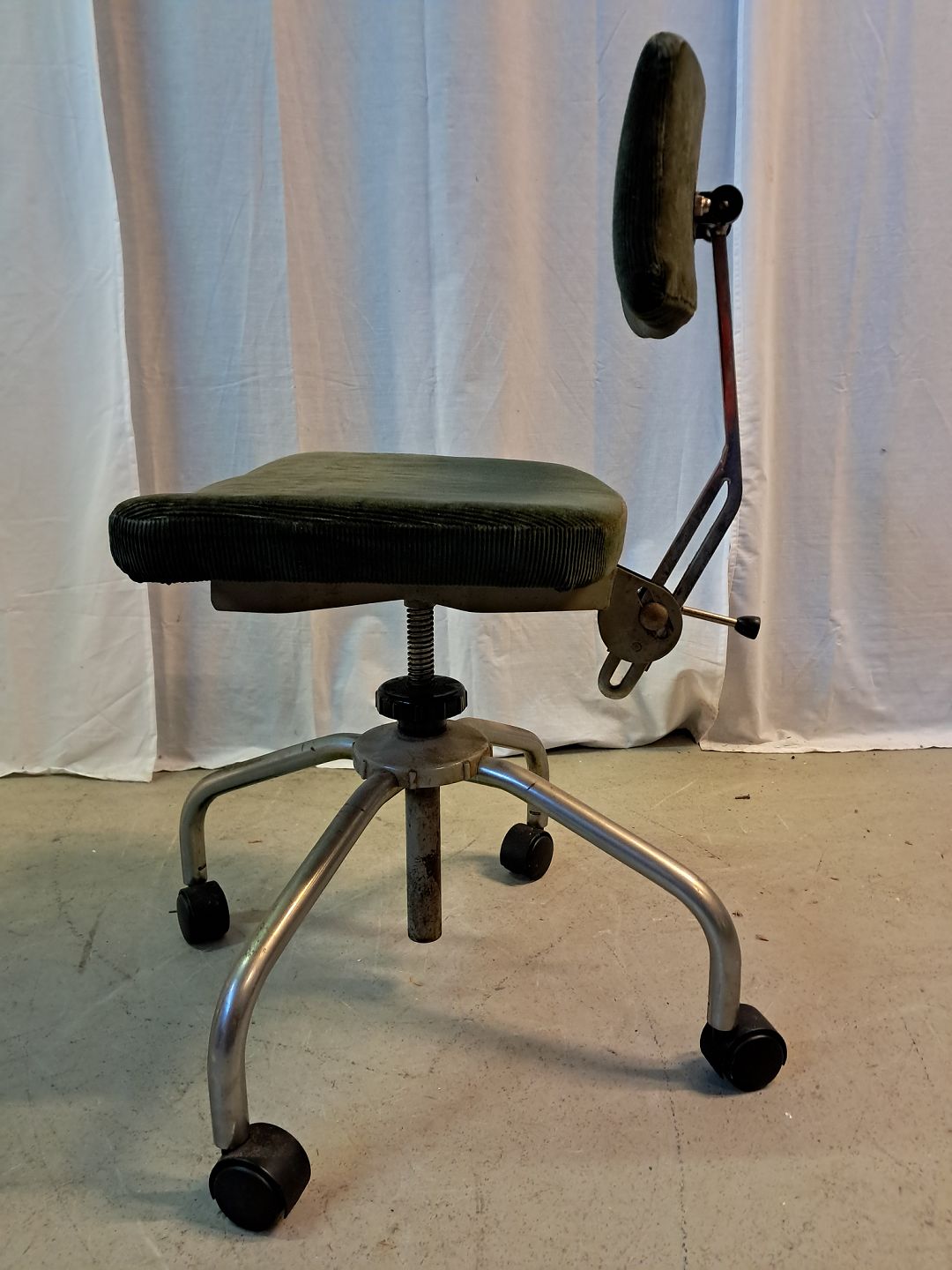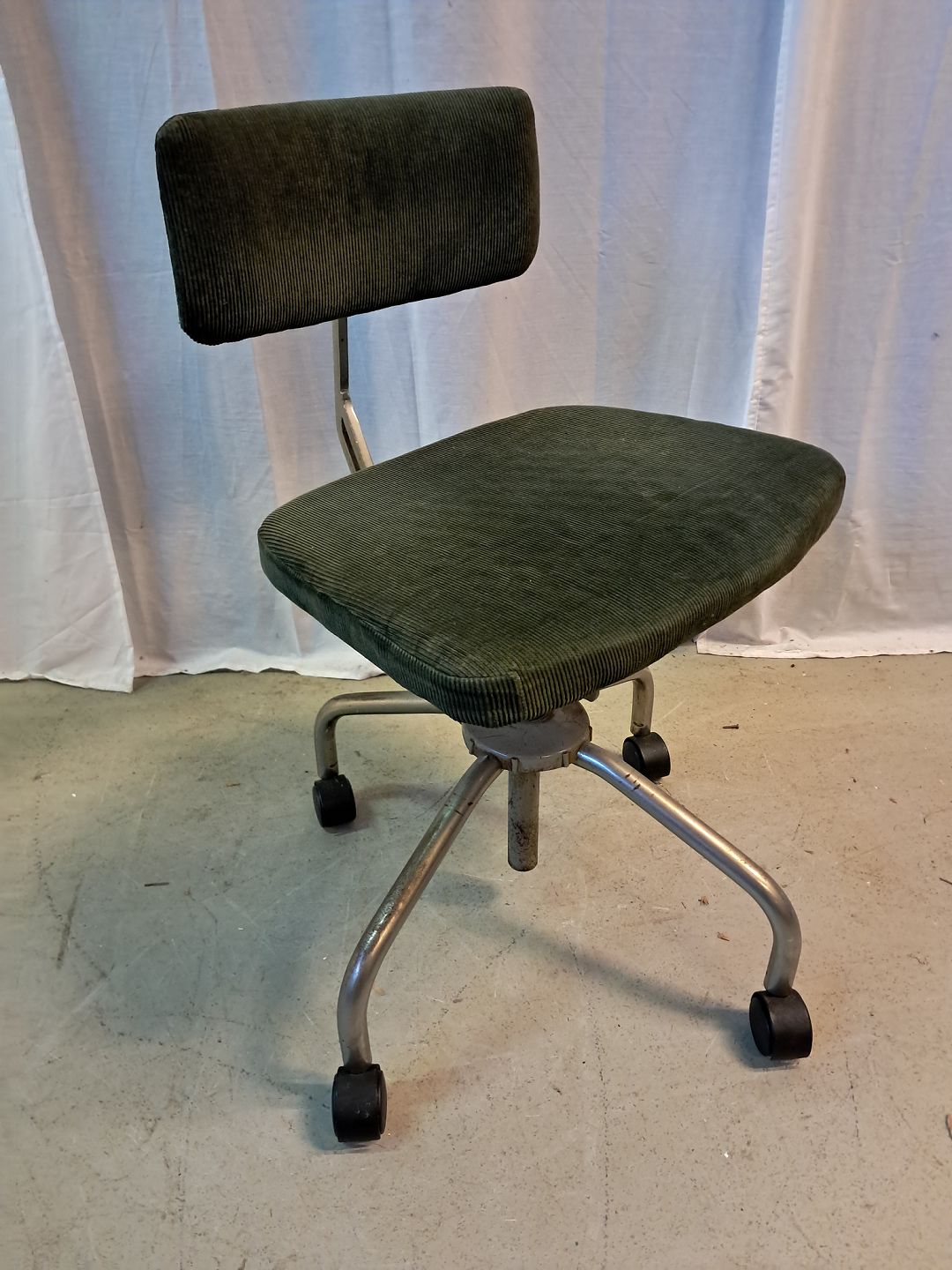 Kontorstol i metal med velourbetræk, fra 1960erne.Den har brugsspor.