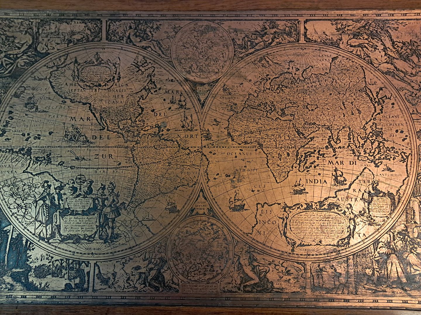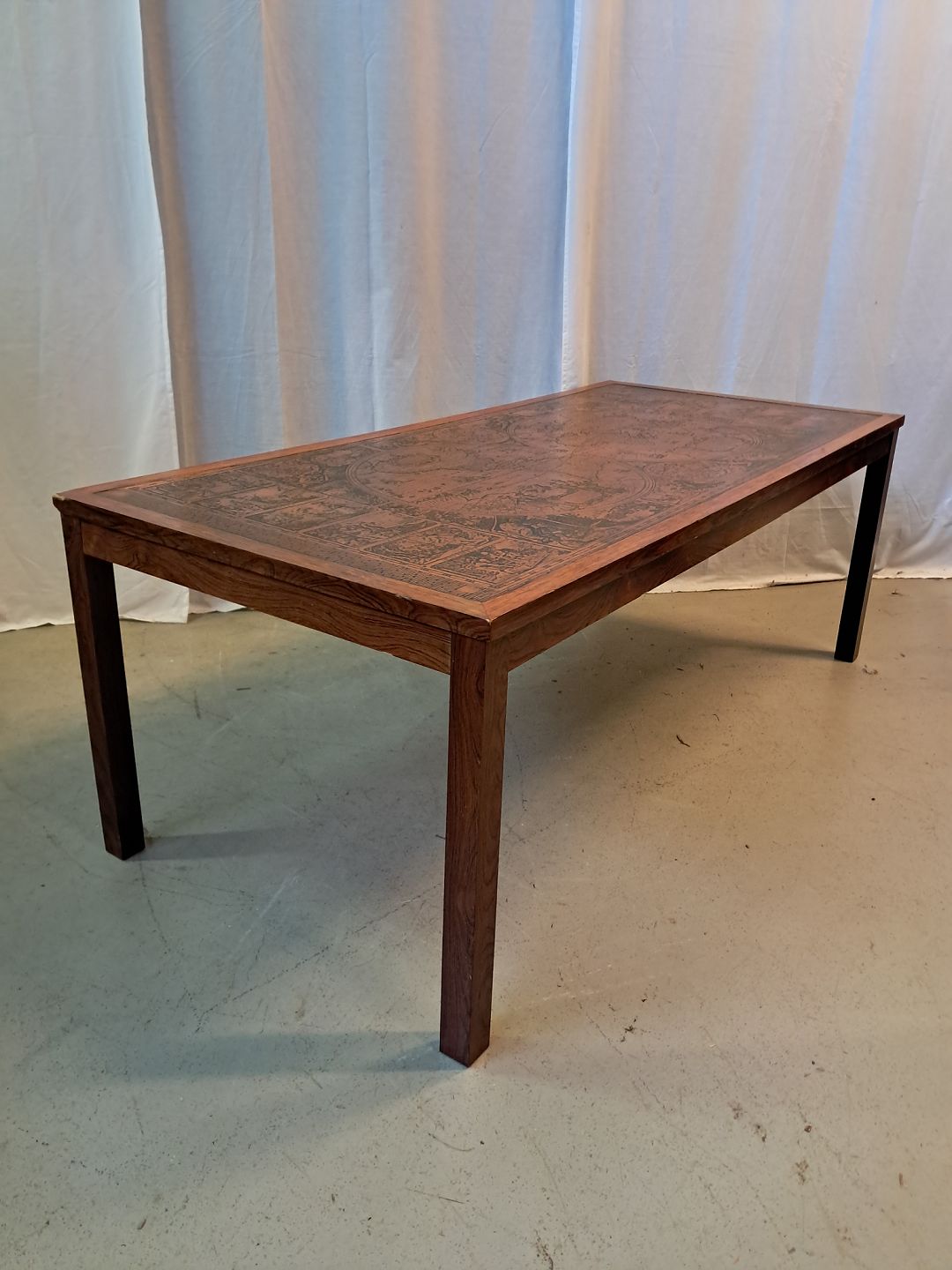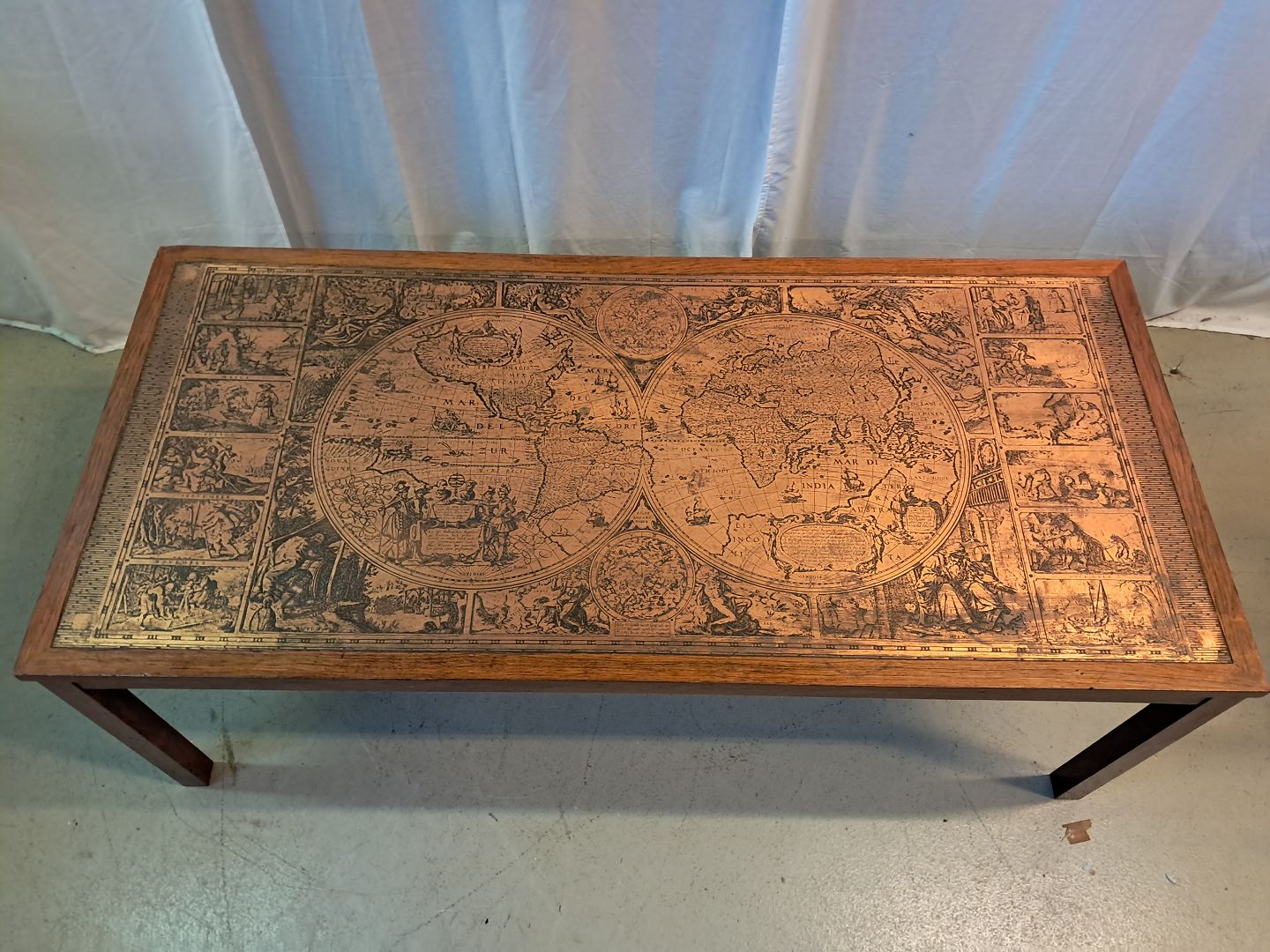 Sofabord i fineret palisander med verdenskort på metalplade, fra 1970erne.Det har brugsspor og en defekt på hjørnet.(se foto)
