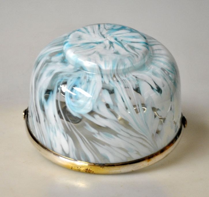 Zuckerschale, um 1900. Klares und hellblaues Glas. Auf kleinem Fuß. Mit versilbertem Rand und Henkel. H.: 8,5 cm. Höhe mit Henkel: 13,5 cm. Durchmesser: 12 cm.Perfekter Zustand!