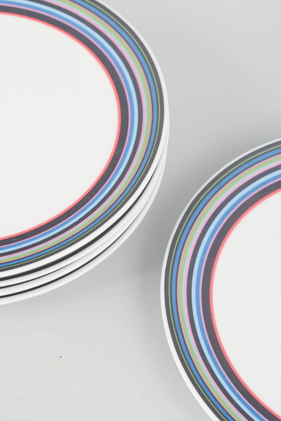 Sæt med fem tallerkener i porcelæn med det karakteristiske flerfarvede stribemønster designet af Alfredo Häberli for Iittala. Serien forener funktionalitet med legende farver og tidløst formsprog, der har gjort den til en moderne klassiker i nordisk design.