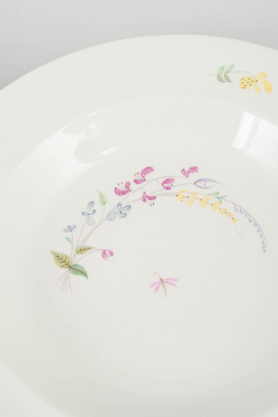 Sæt bestående af seks dybe tallerkener i hvid fajance med håndmalet blomsterdekoration i bløde pastelfarver, designet af Stig Lindberg for Gustavsberg. Serien udviser Lindbergs karakteristiske legende formsprog og delikate ornamentik, der forener funktionalitet med kunstnerisk udtryk.