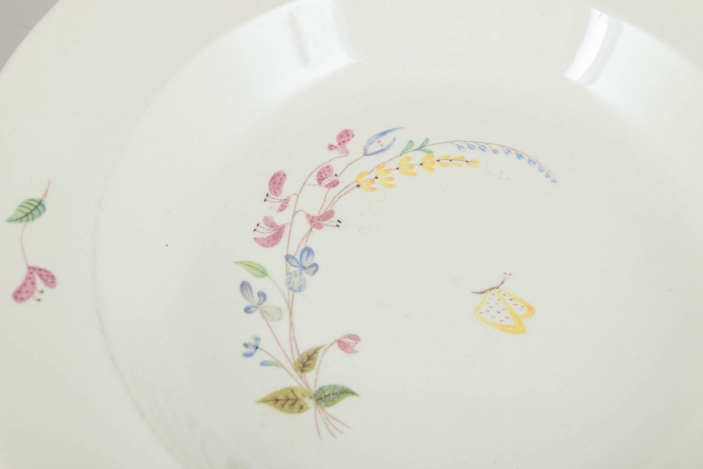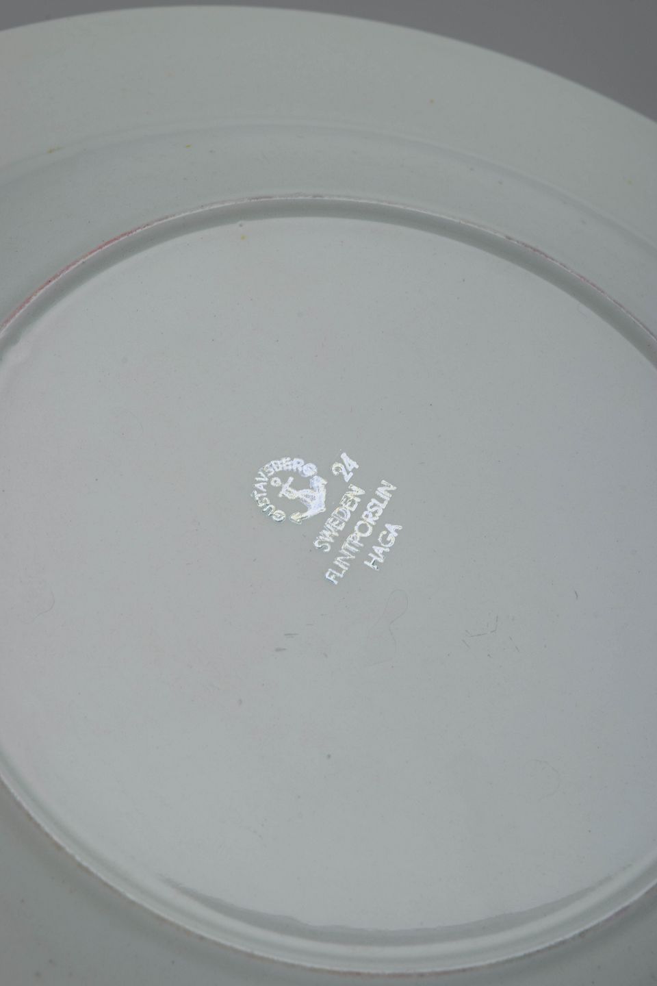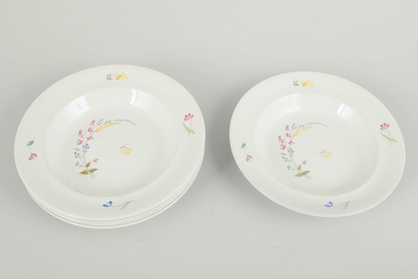 Sæt bestående af fem dybe tallerkener i hvid fajance med håndmalet blomsterdekoration i bløde pastelfarver, designet af Stig Lindberg for Gustavsberg. Serien udviser Lindbergs karakteristiske legende formsprog og delikate ornamentik, der forener funktionalitet med kunstnerisk udtryk.