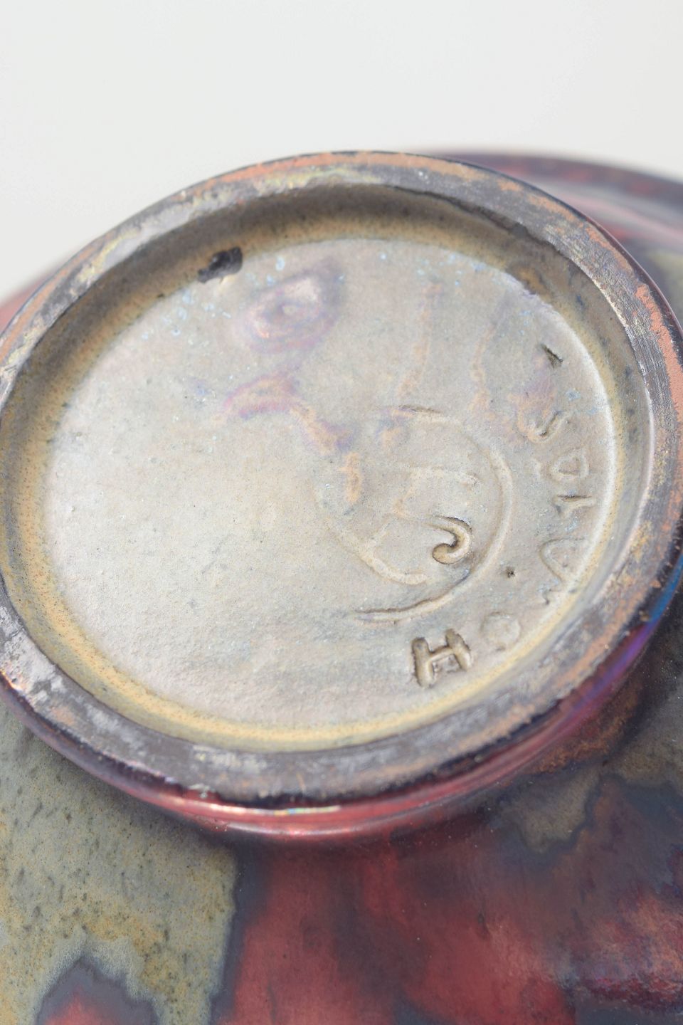 Hånddrejet stentøjsskål på lille fod med udsvajet kant og eksperimenterende flerfarvet glasur i nuancer af rosa, blå, lilla og grøn. Et karakteristisk eksempel på Anderssons arbejde for Höganäs under 1970’erne, hvor han kombinerede traditionelle former med kunstneriske glasureffekter.