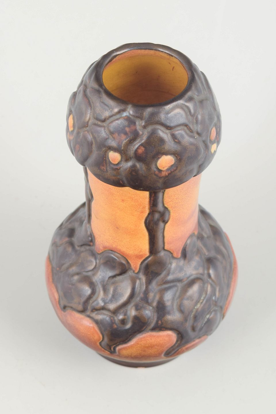 Ipsens Enke vase, model 509, ca. 1910/20’erne.Art Nouveau-vase i glaseret keramik med karakteristisk plastisk reliefdekoration i mørkebrun glasur over varm gylden-orange bundglasur. En elegant og klassisk formgivning fra perioden, med tydelig inspiration fra naturens organiske former.