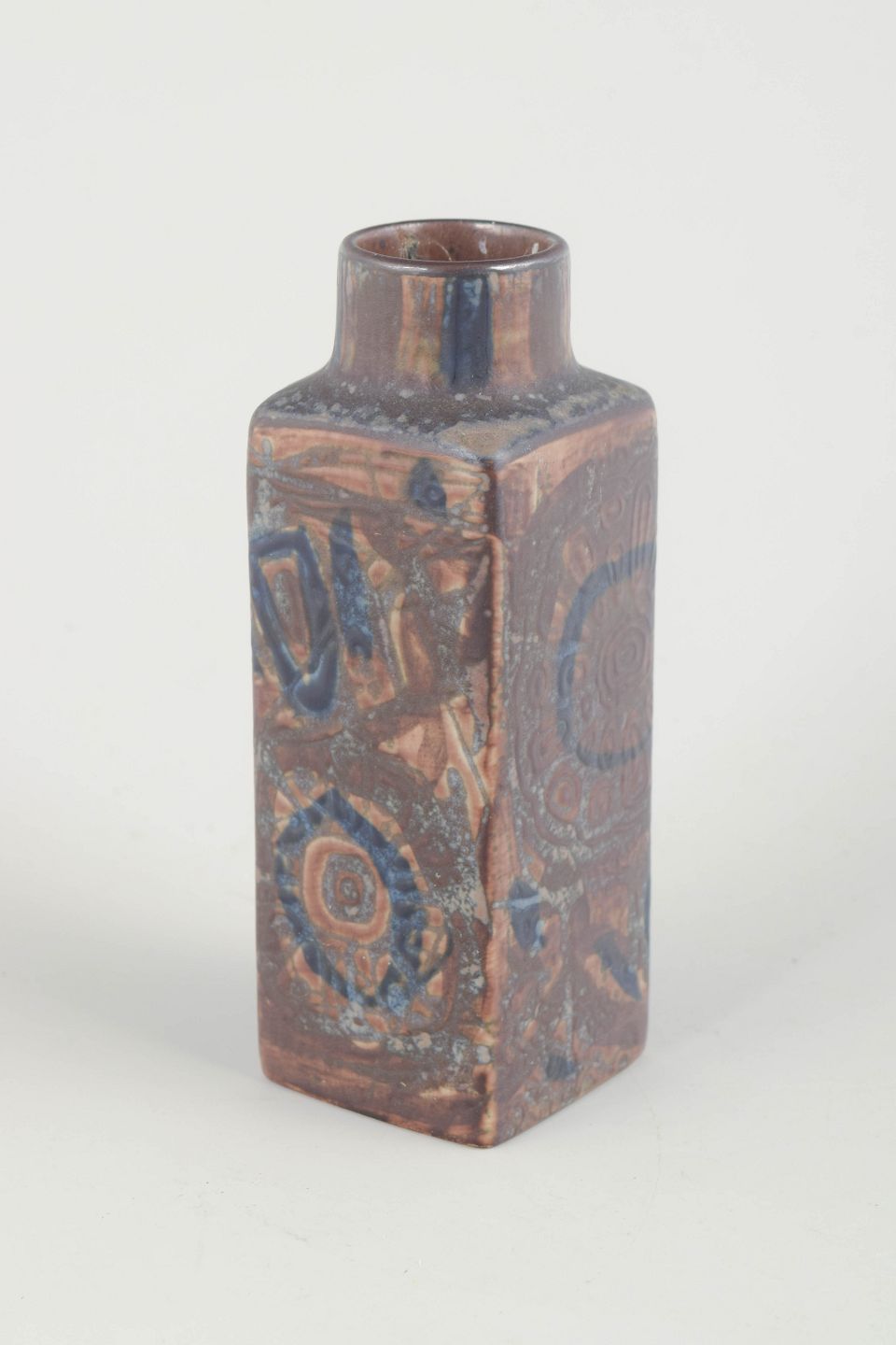 Rektangulær vase i stentøj med karakteristisk reliefdekoration i blå og brunlige nuancer fra Thorssons Baca-serie. Den geometriske form kombineret med det organiske mønster skaber et markant og tidstypisk udtryk for dansk design i perioden.