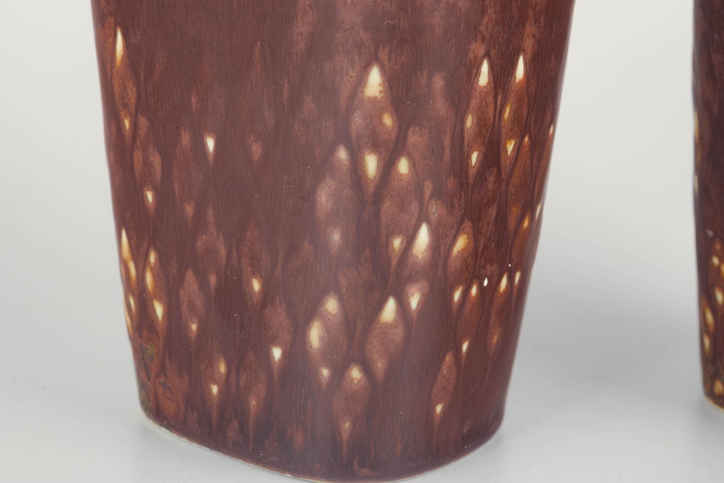 To rektangulære vaser i stentøj med afrundede hjørner og brunrød glasur med lysere løbende effekter. De harmoniske proportioner og glasurens subtile spil er typisk for Stålhane’s raffinerede formsprog i 1950’erne.