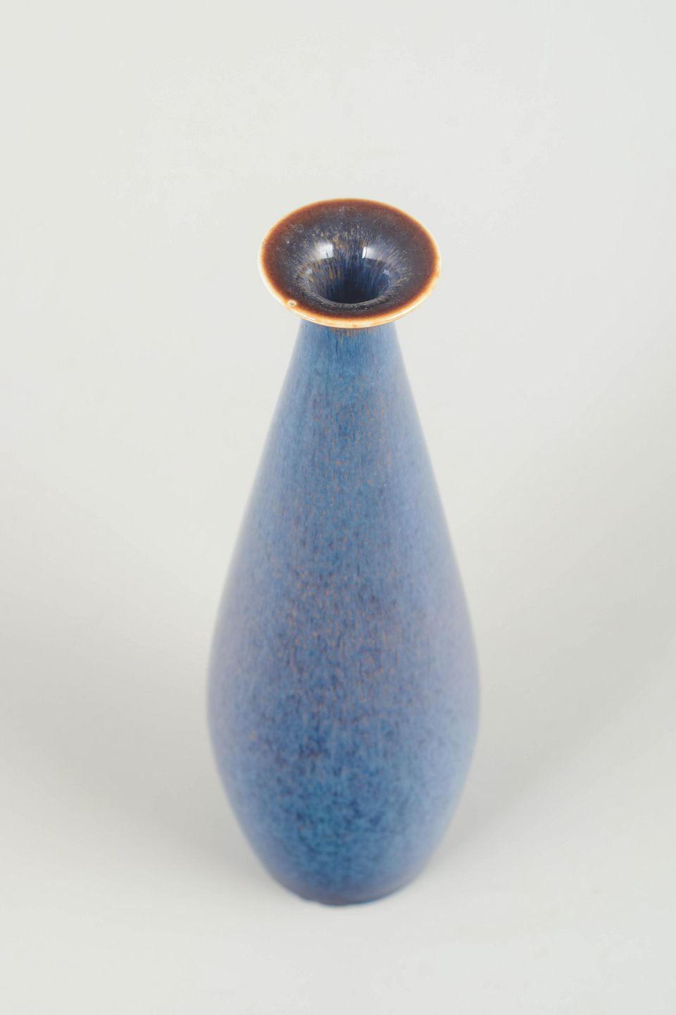 Slank, dråbeformet vase i stentøj med glansfuld blå glasur i levende nuancer fra dyb kobalt til lysere blå toner. Den elegante, organiske form og den fine glasurforløb er karakteristisk for Stålhane’s arbejde i 1950’erne og 60’erne.