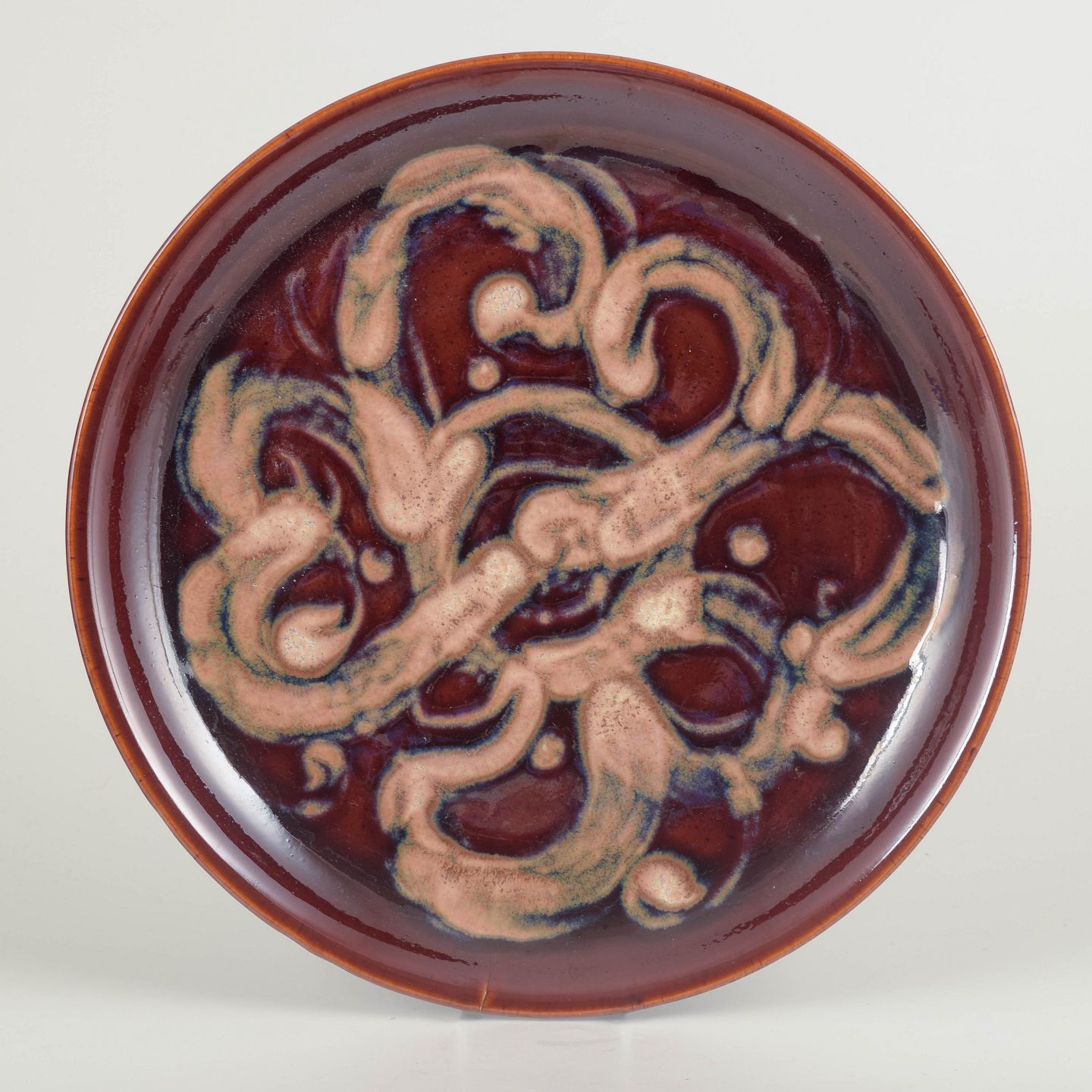 Hånddrejet stentøjsfad med eksperimentel flerfarvet glasur i vinrøde, rosa og blålige toner. Overfladen prydes af et frit ornamentalt mønster i typisk Stålhane-stil, hvor glasuren danner en levende, reliefagtig struktur med høj glans. Et markant eksempel på Stålhånes sene arbejde for Designhuset.