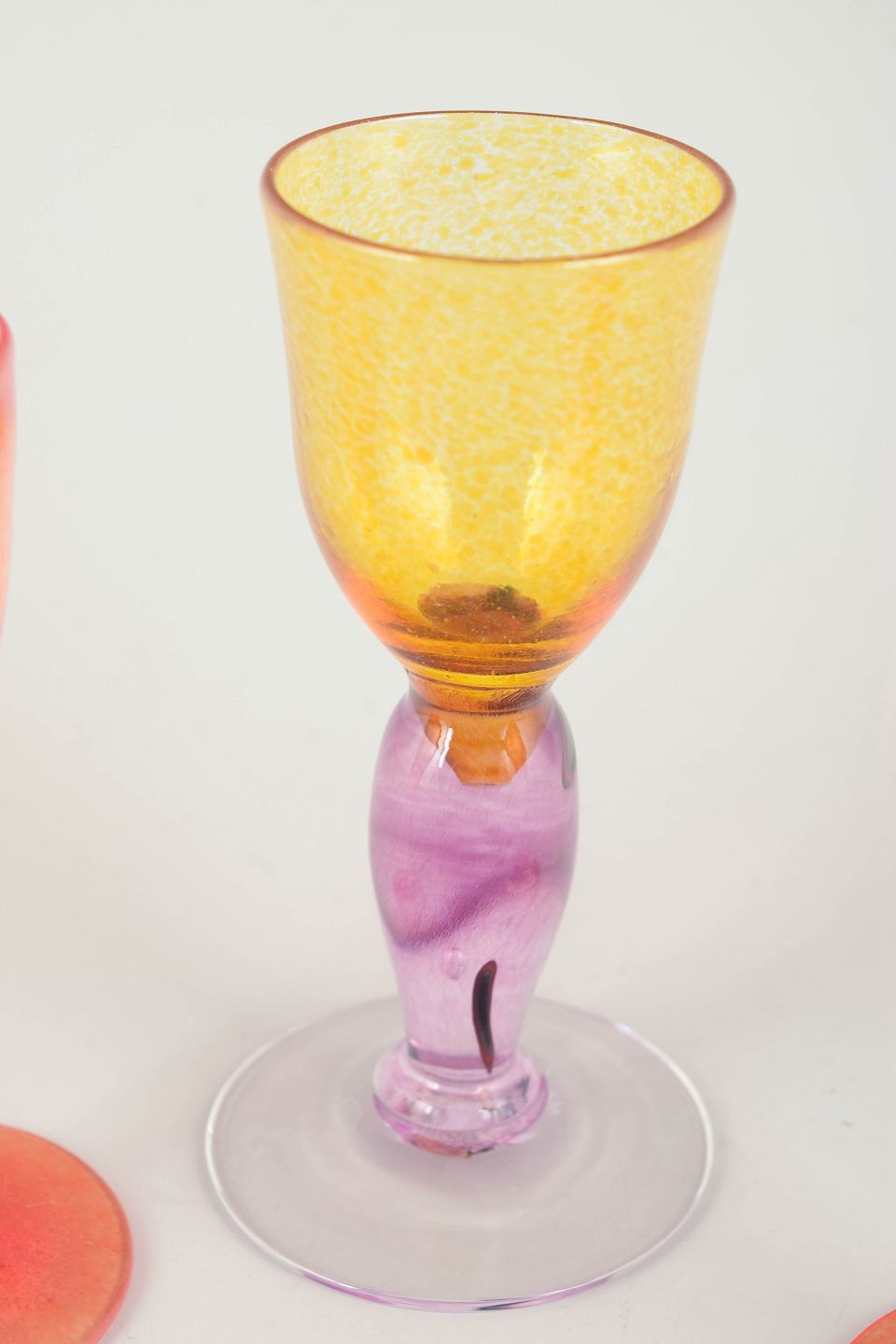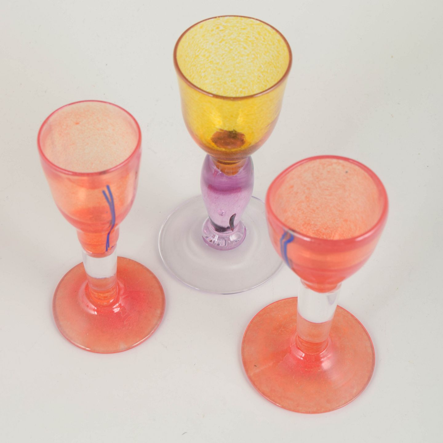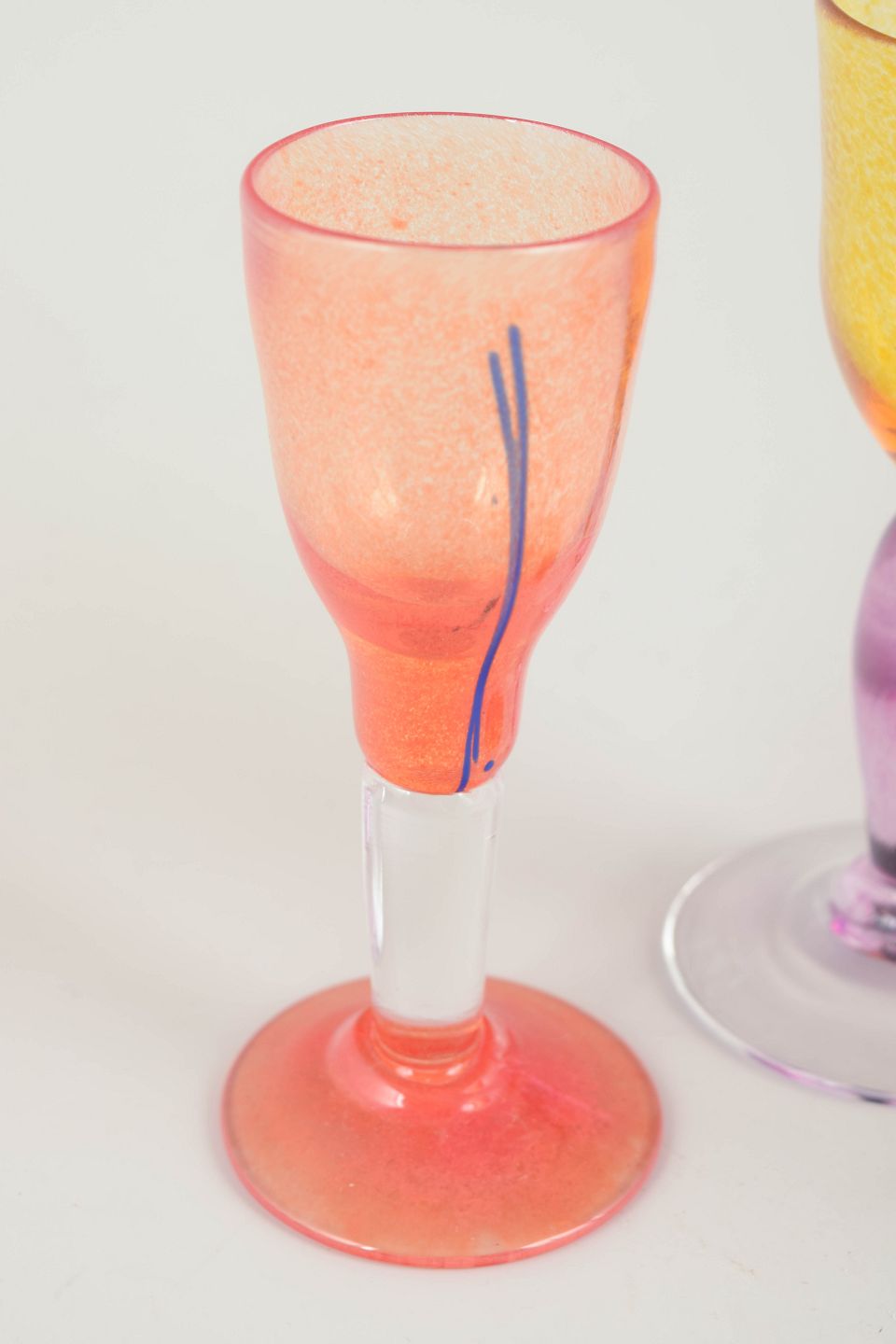 Håndlavede snapseglas i mundblæst glas med levende farvespil i orange, rosa, gule og blå nuancer. Hvert glas er unikt med lette variationer i form og dekoration, karakteristisk for eksperimenterende svensk kunstglas fra perioden.