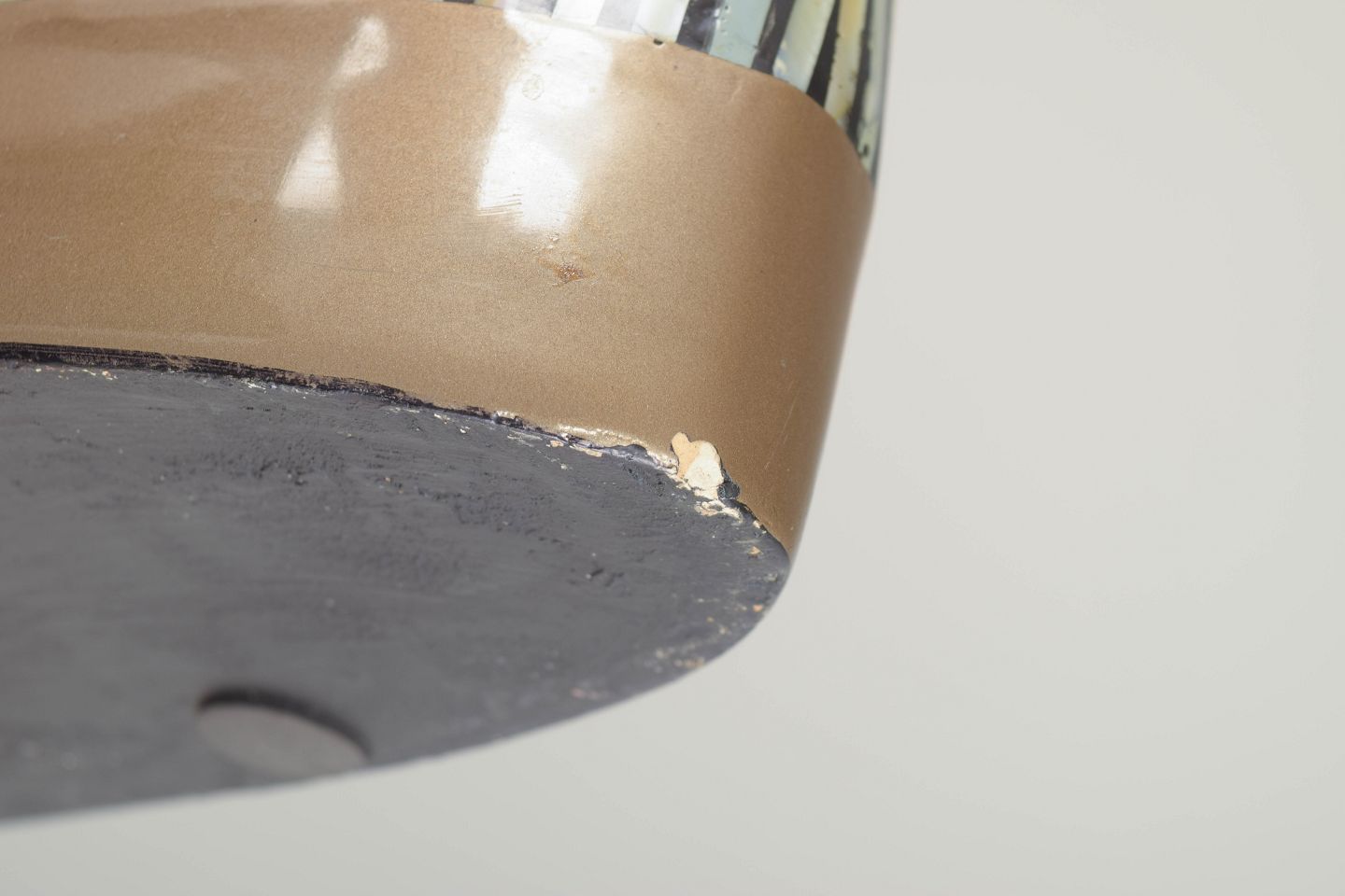Imponerende, skulpturel studiovase i glaseret keramik med geometrisk mosaikdekoration i metalliske og lyse toner. Den brede, asymmetriske form og den reflekterende glasur giver vasen et markant, dekorativt udtryk typisk for 1980’ernes europæiske studiokeramik.