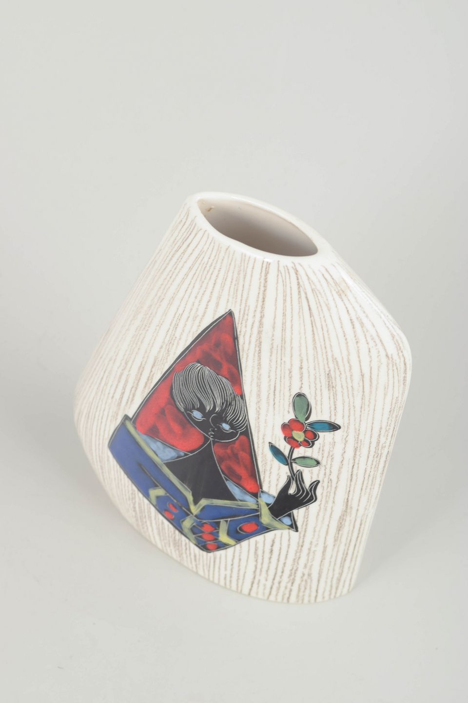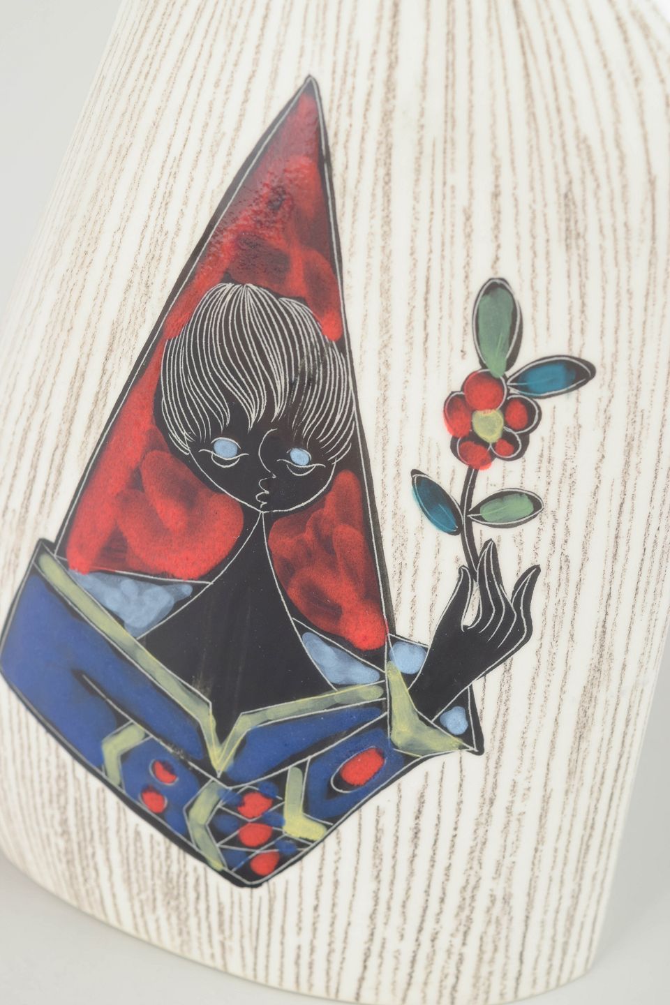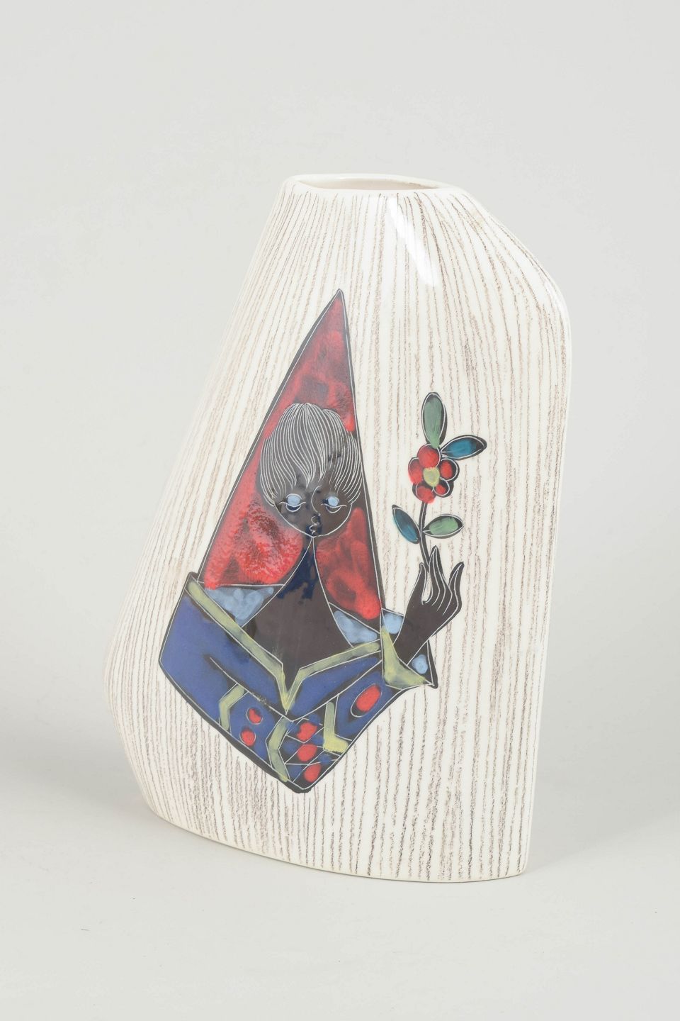 Italian ceramic vase, 1960’erne/70’erneHåndlavet italiensk keramikvase med asymmetrisk, skråtformet krop og reliefdekoreret overflade i hvidglaseret ler. Fronten er udsmykket med et farverigt motiv af en stiliseret figur med blomst, udført i emalje og malet i rød, blå, grøn og sort. Signeret på undersiden. Et karakteristisk eksempel på italiensk 1960’er-keramik med kunstnerisk og grafisk udtryk.