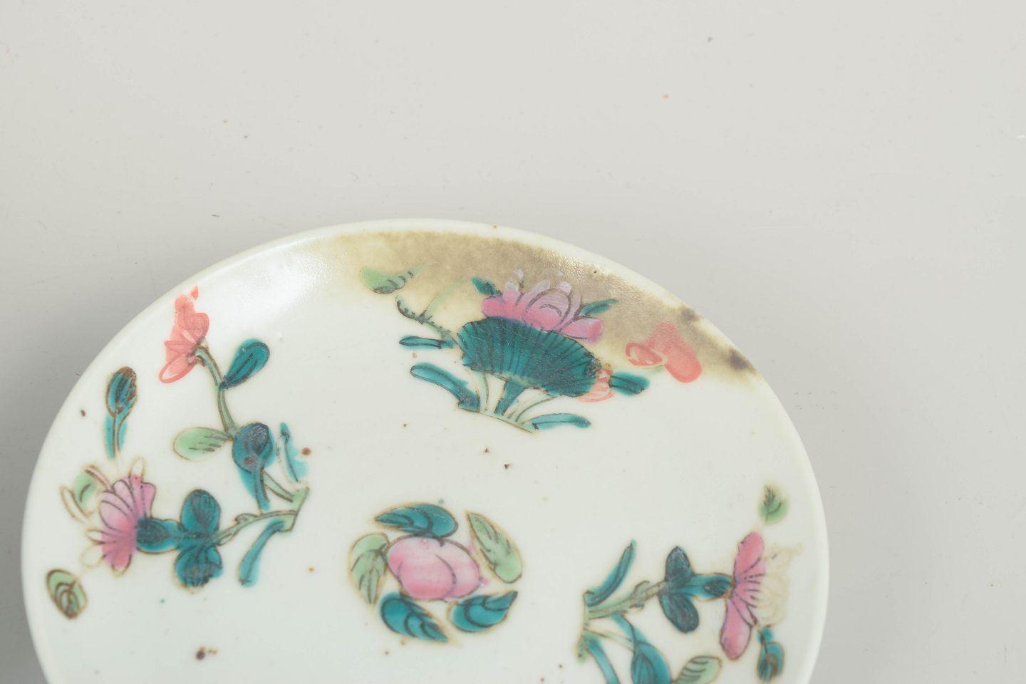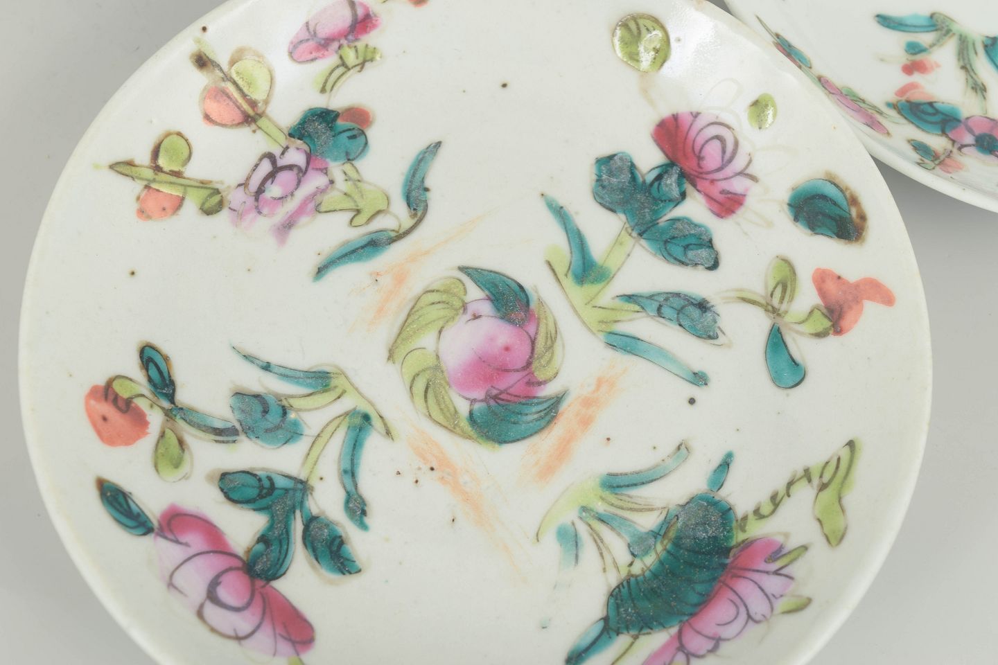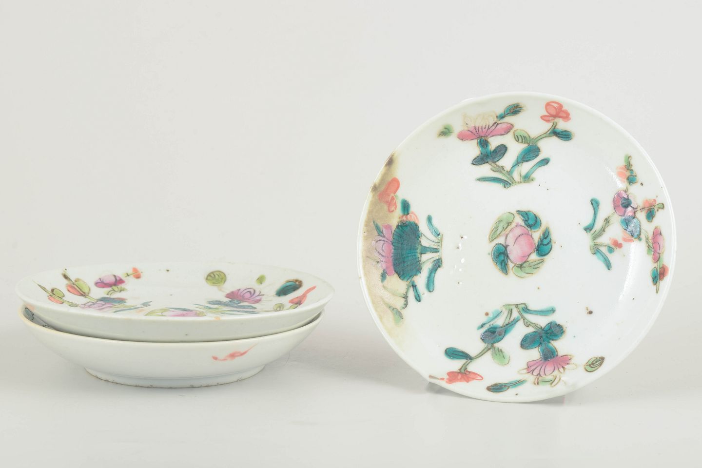 Kinesiske porcelænstallerkener, 1800-tallet.Tre små tallerkener i hvidt porcelæn dekoreret i famille rose-paletten med håndmalede blomster og bladmotiver i rosa, grønne og turkise nuancer. Typisk for Qing-dynastiets dekorative stil med levende farver og delikate penselstrøg.