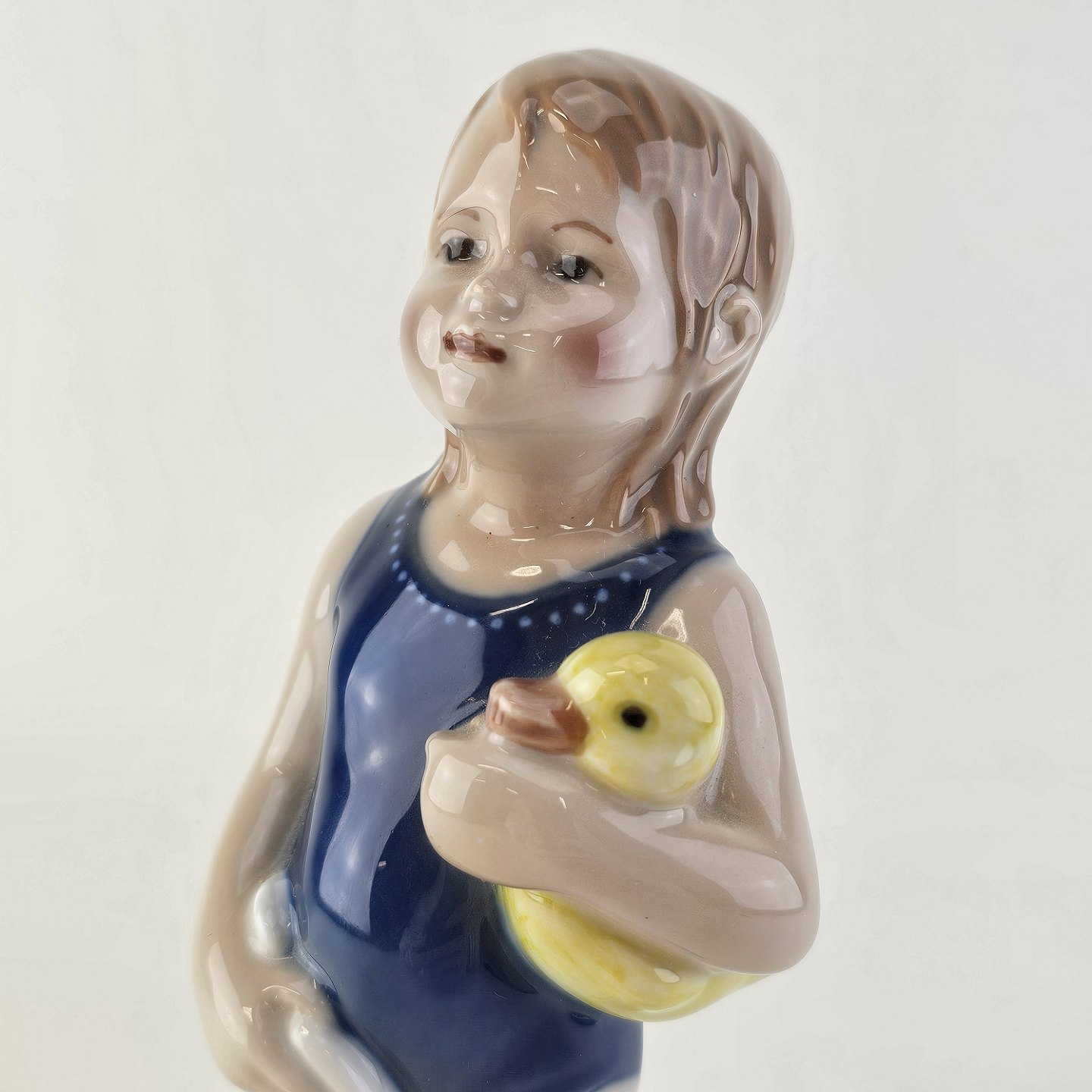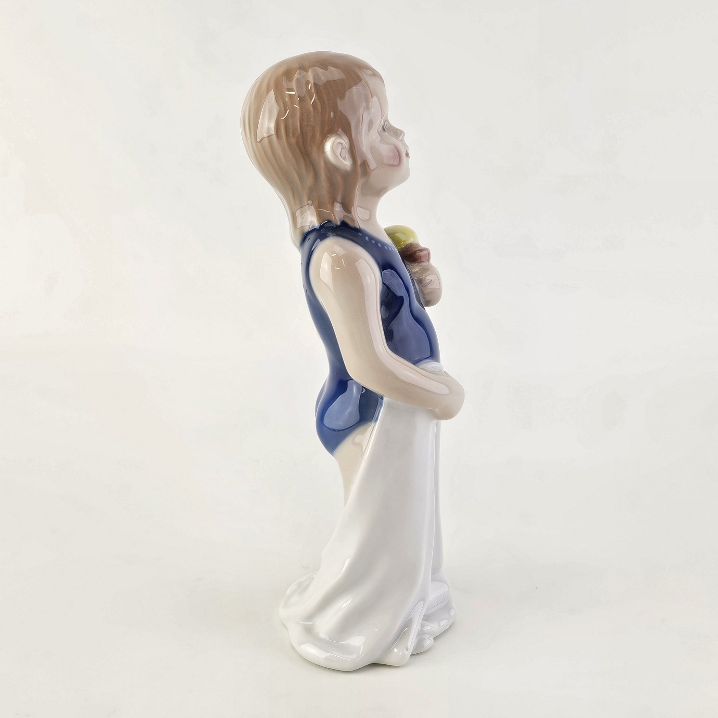 Figur i kongeligt porcelæn med form af en lille pige i en blå badedragt med et håndklæde og en badeandNr. 678