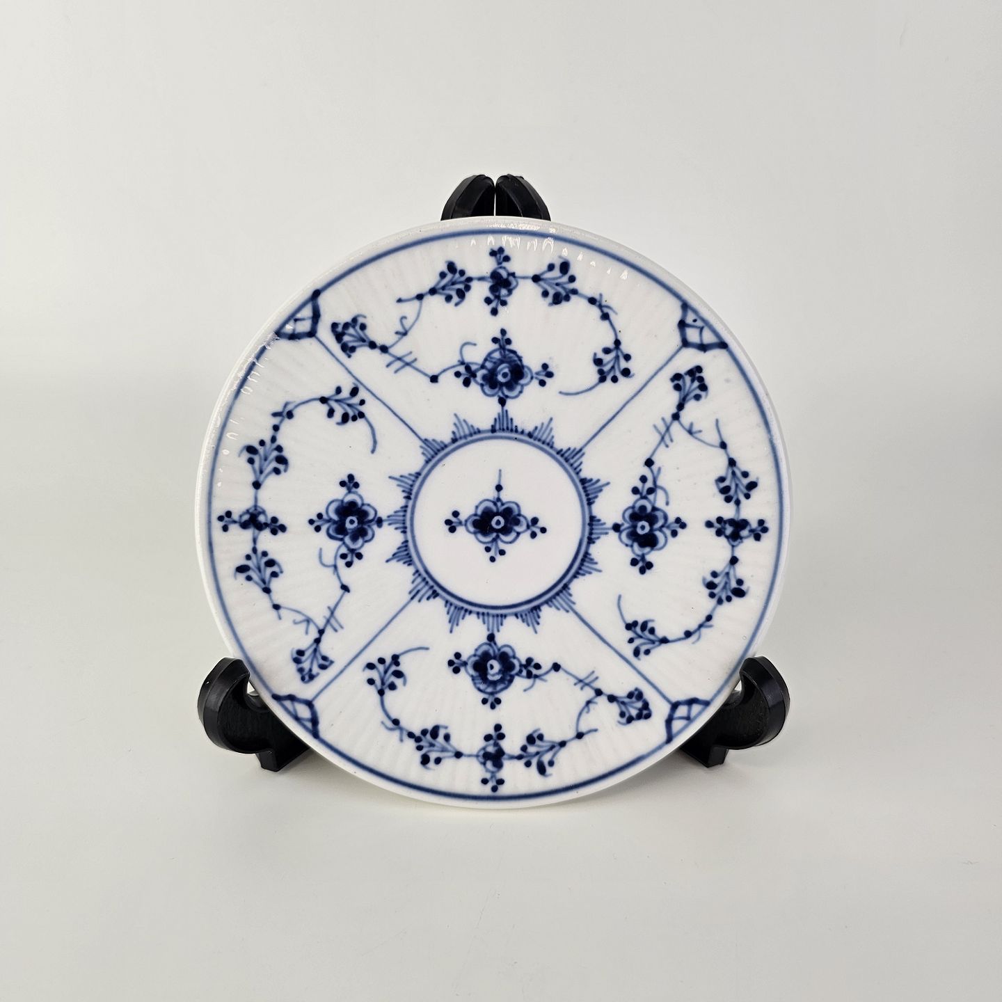 Musselmalet halvblonde er riflet hvidt porcelæn med dekoration af blå ranker og en kant med blonder.
