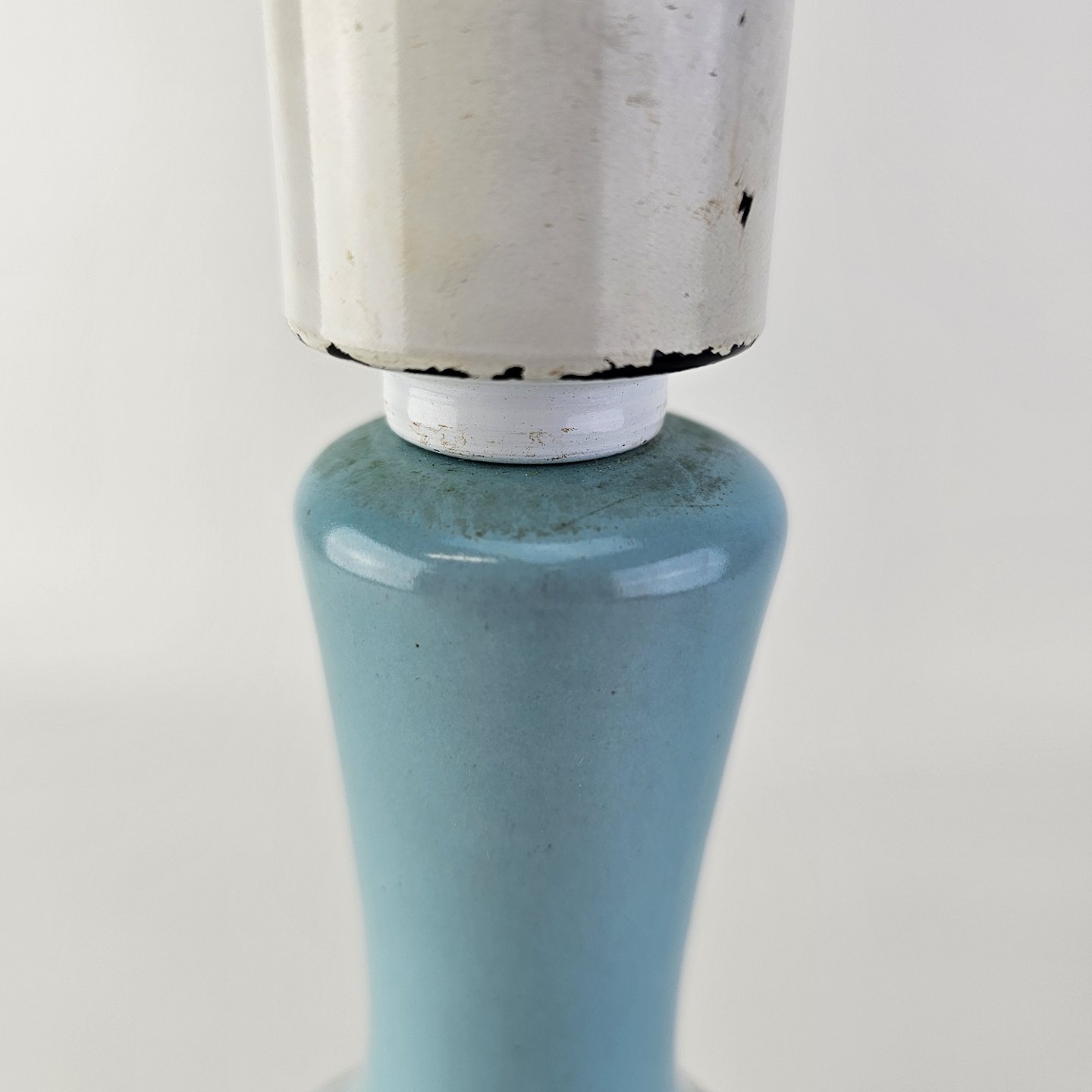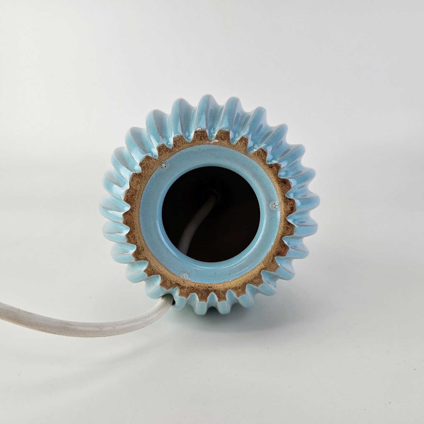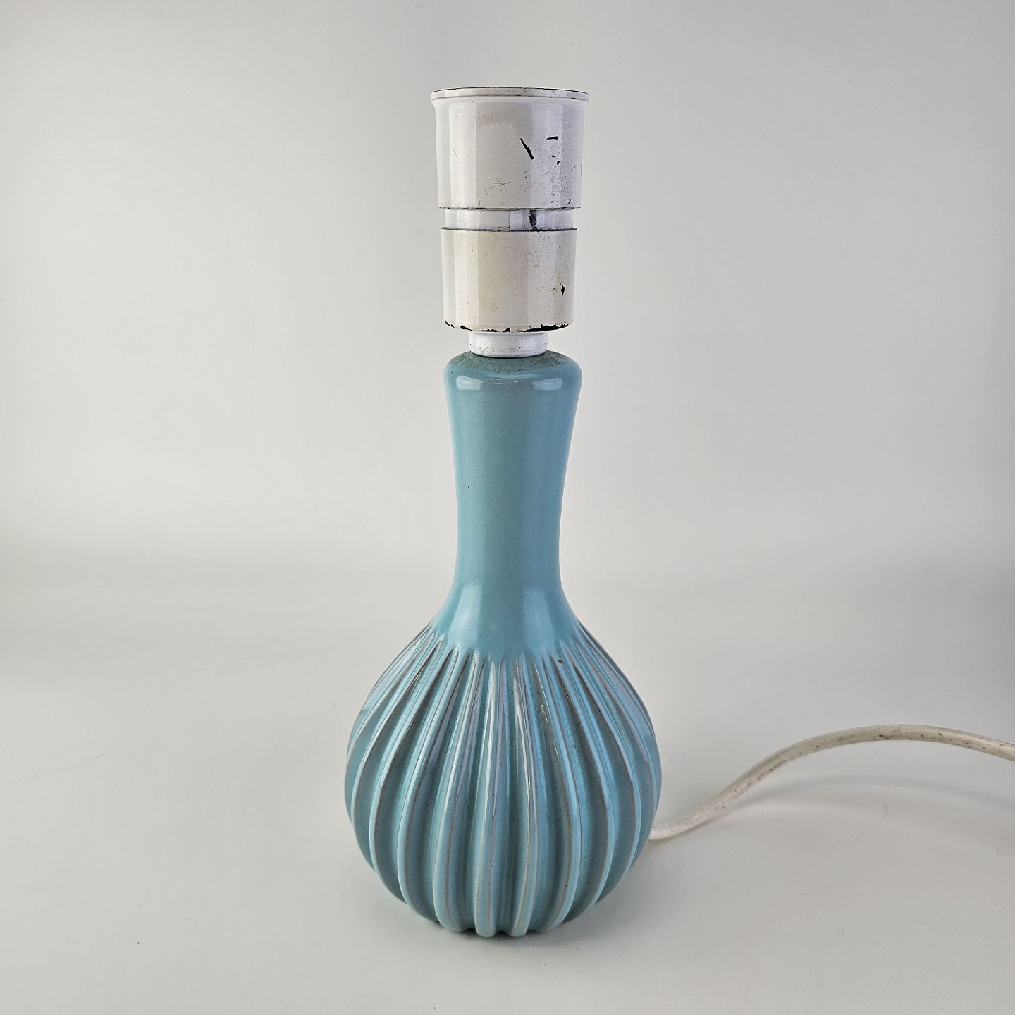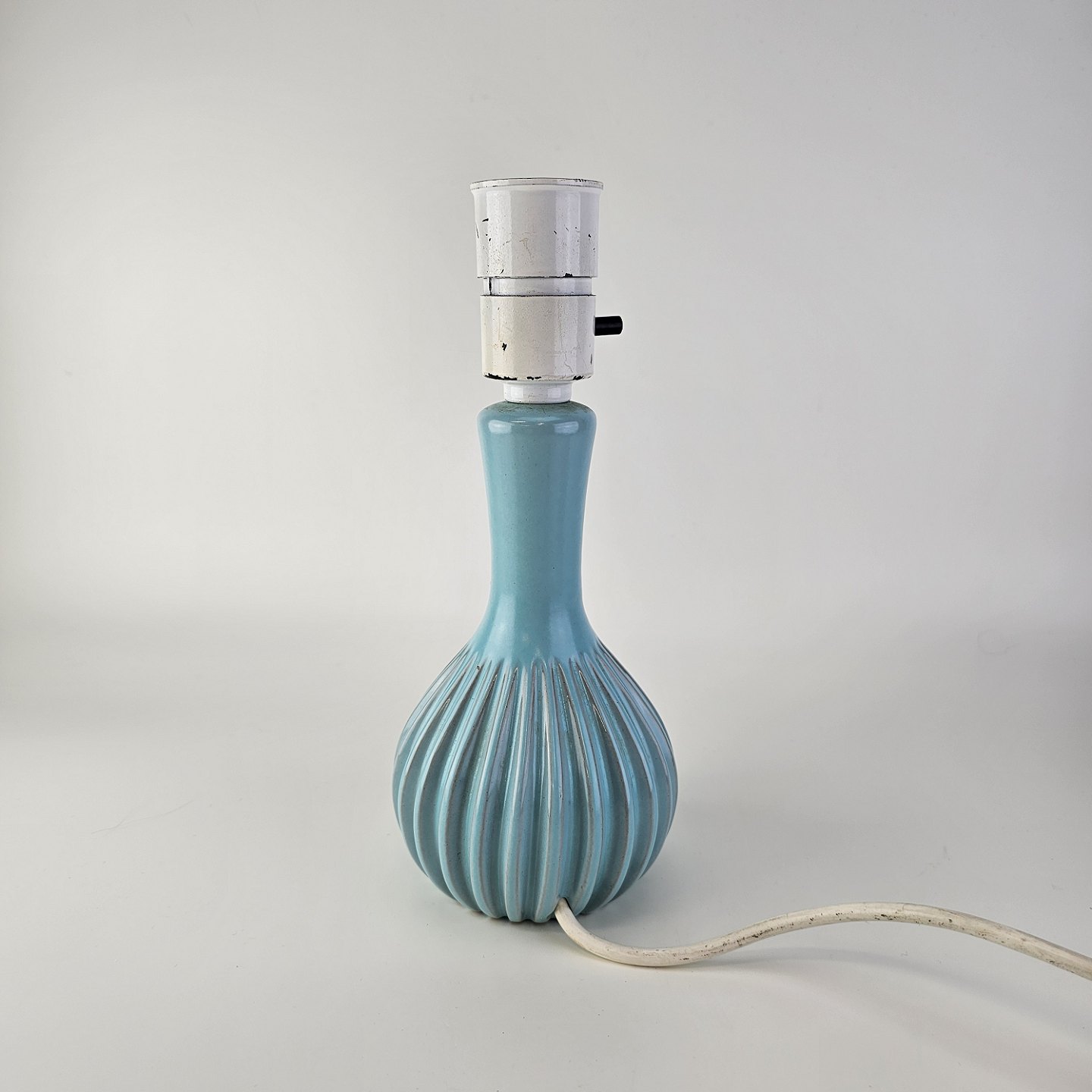 Rund bordlampe i rillet grønblå keramik med hvid fatningProducent Eslau