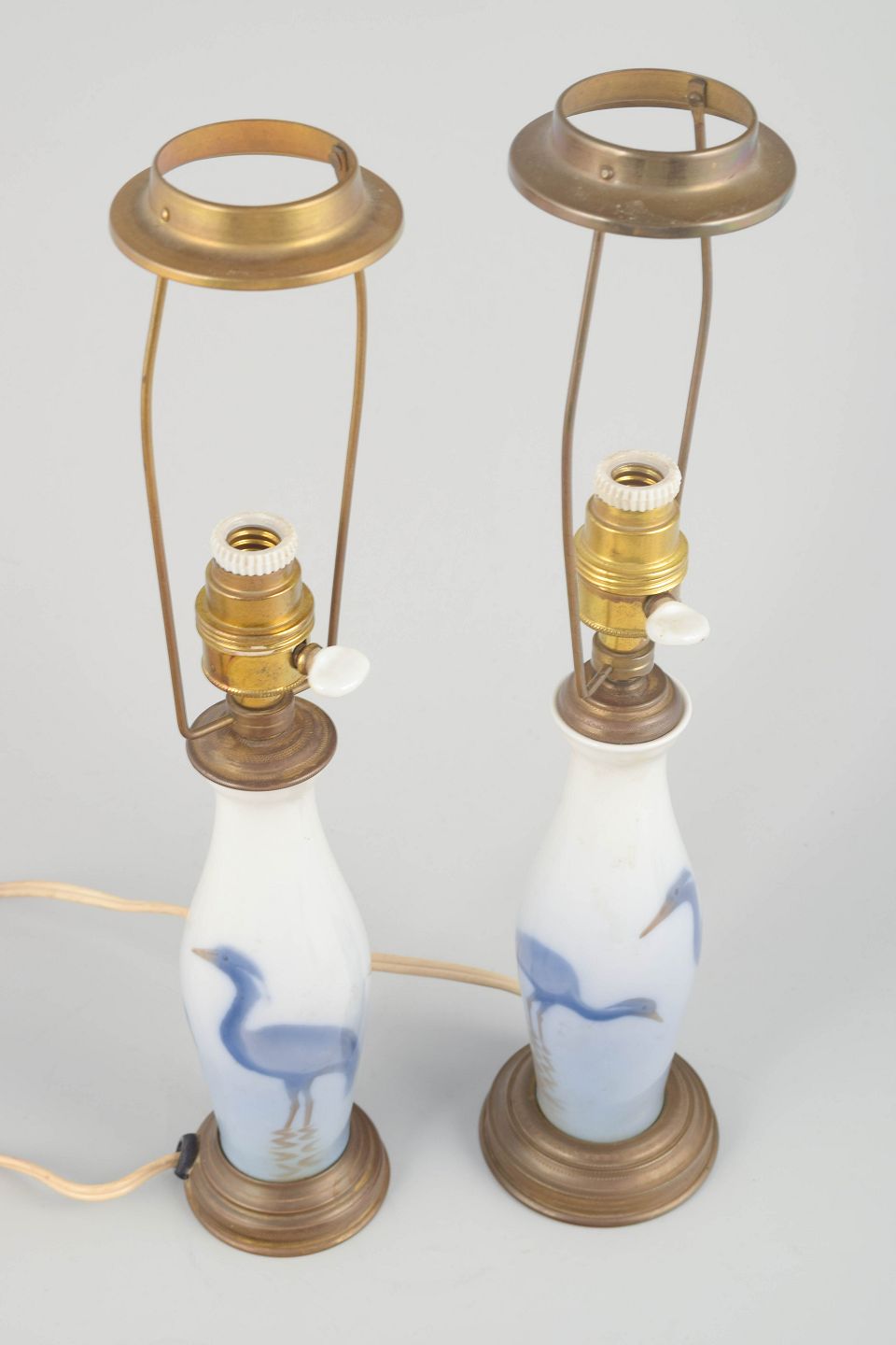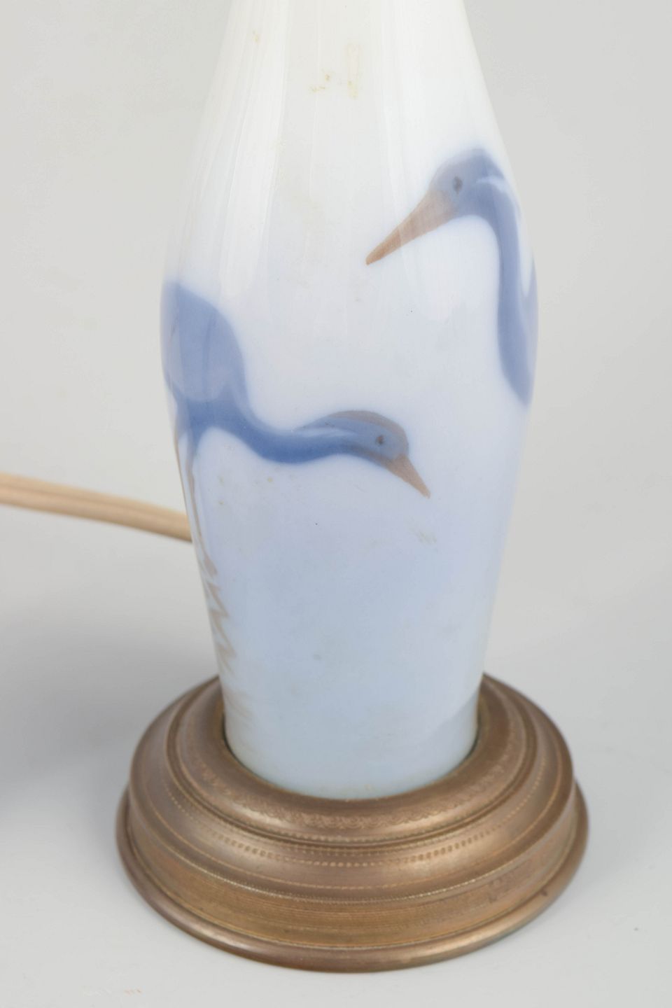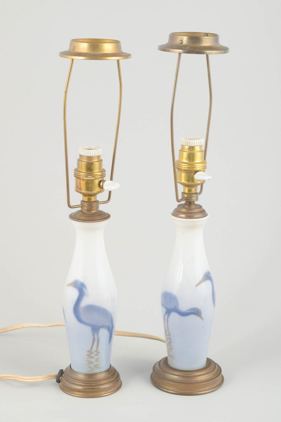 Par små bordlamper i porcelæn og messing, begyndelsen af 1900-tallet.Et par elegante bordlamper med håndmalede motiver af hejrer i blå toner på hvidt porcelæn, monteret med originale fatninger og detaljer i patineret messing. Klassisk design med tidlig 1900-tals æstetik.