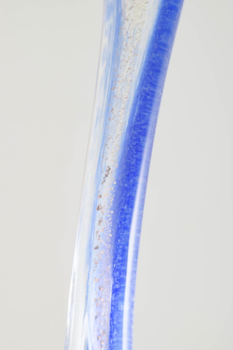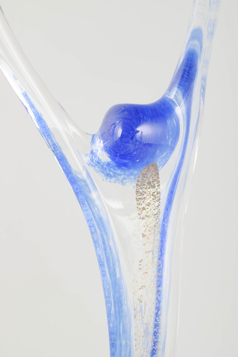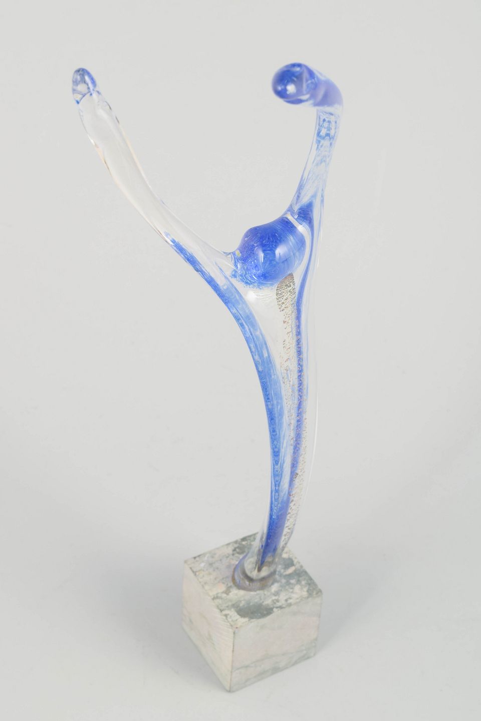 Elegant, håndformet kunstglasskulptur i klart og koboltblåt glas, monteret på sokkel i grå marmor. Den dynamiske form antyder en dansende figur i bevægelse.