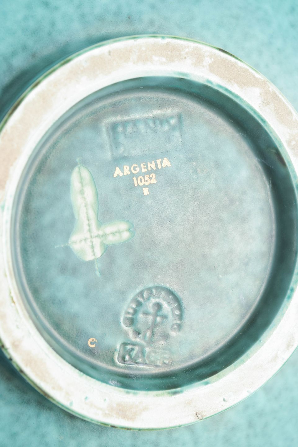 Wilhelm Kåge var en af Gustavsbergs mest betydningsfulde designere og stod bag en lang række ikoniske serier, herunder Argenta, lanceret i 1930’erne. Serien kombinerer mat turkis glasur med indlagte sølvmotiver og blev et symbol på svensk art deco og funktionalistisk elegance.
