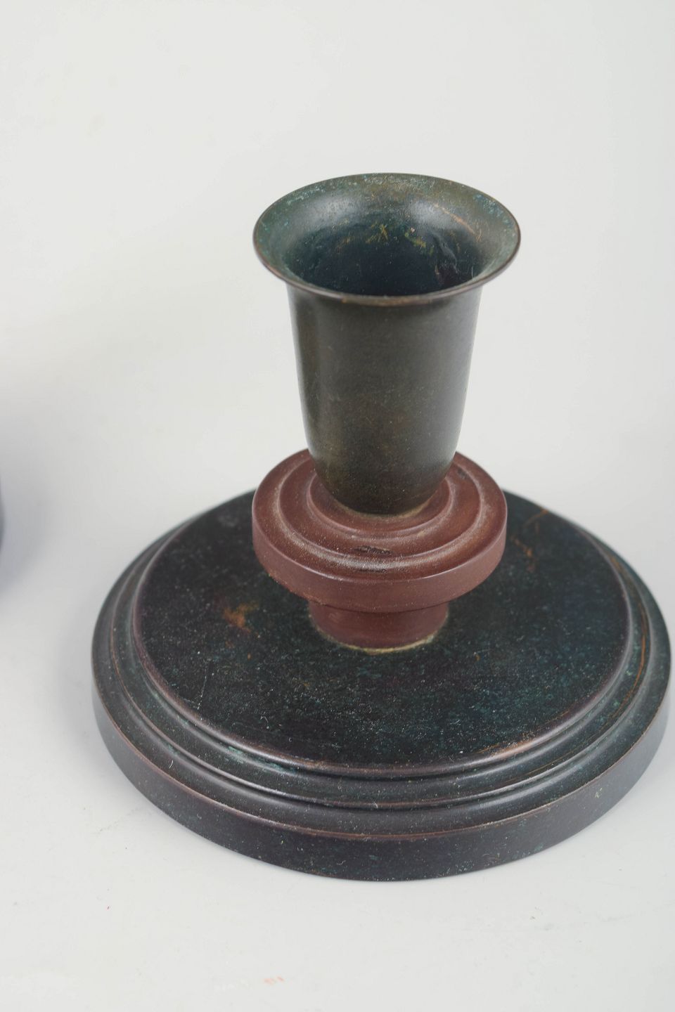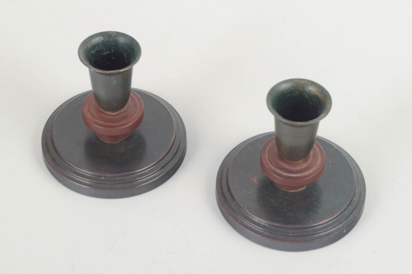 Elegant par runde art deco stager i patineret bronze med geometrisk fod og cylindrisk lyseskål. Diskret funktionalistisk formsprog med varme brungrønne toner og fine proportioner.