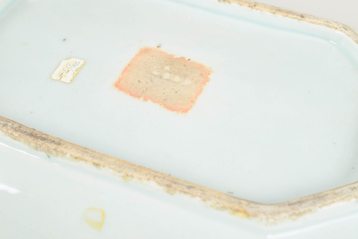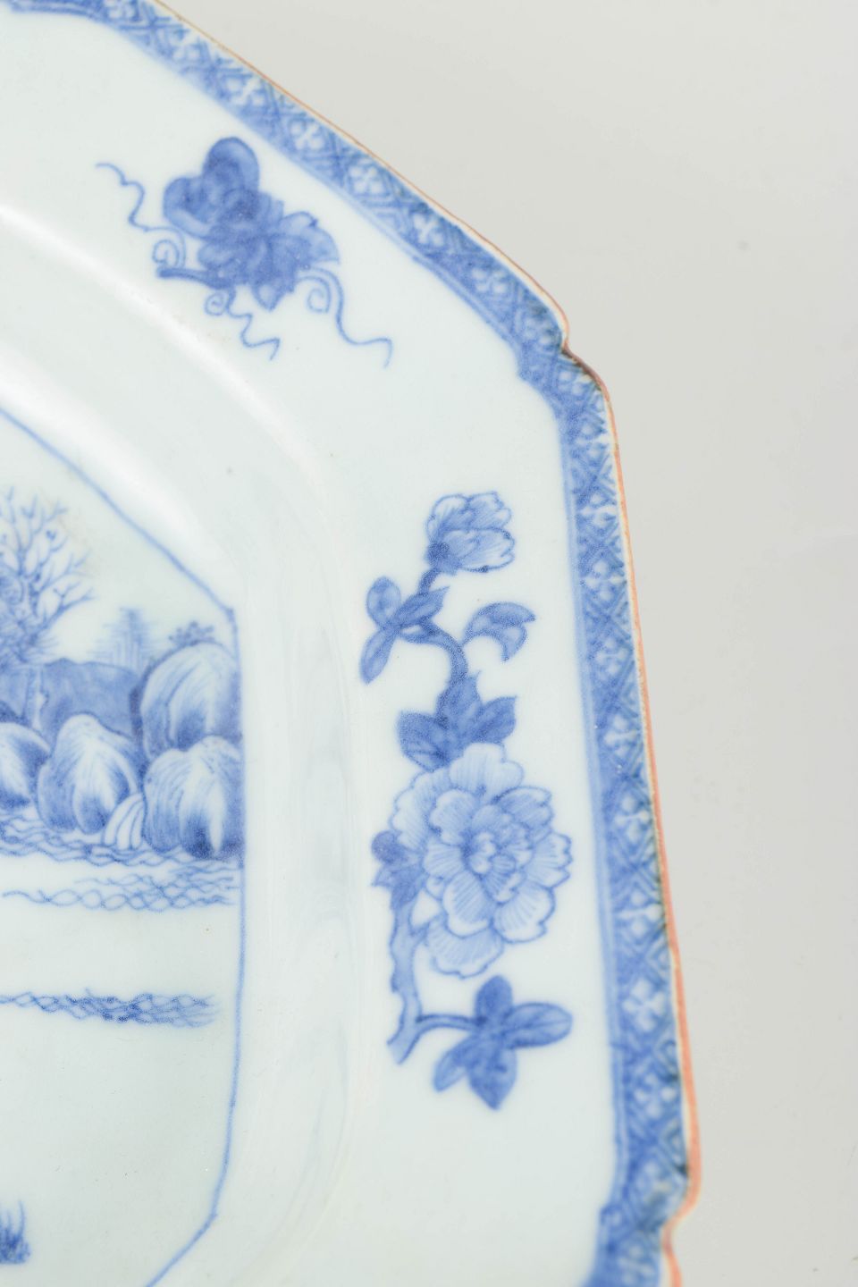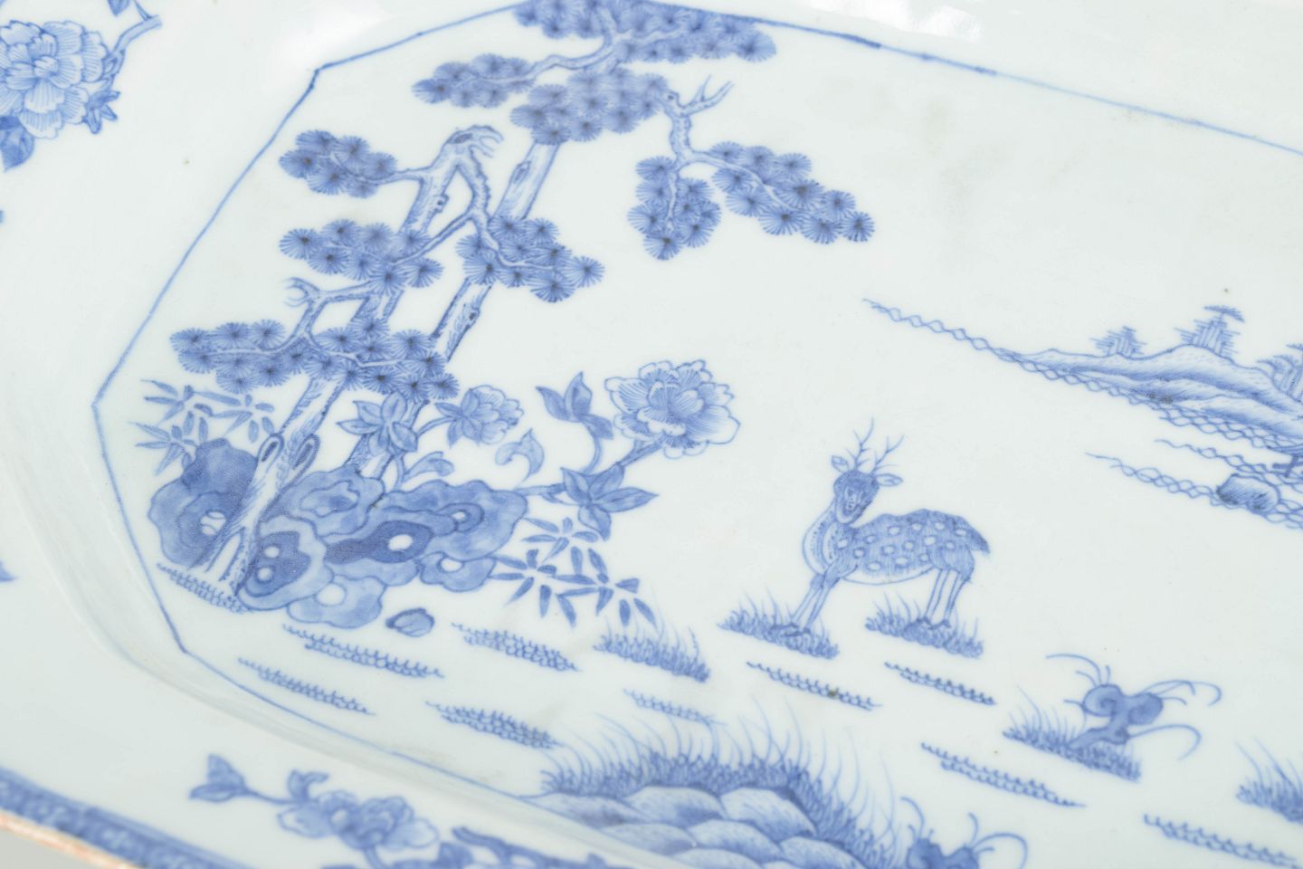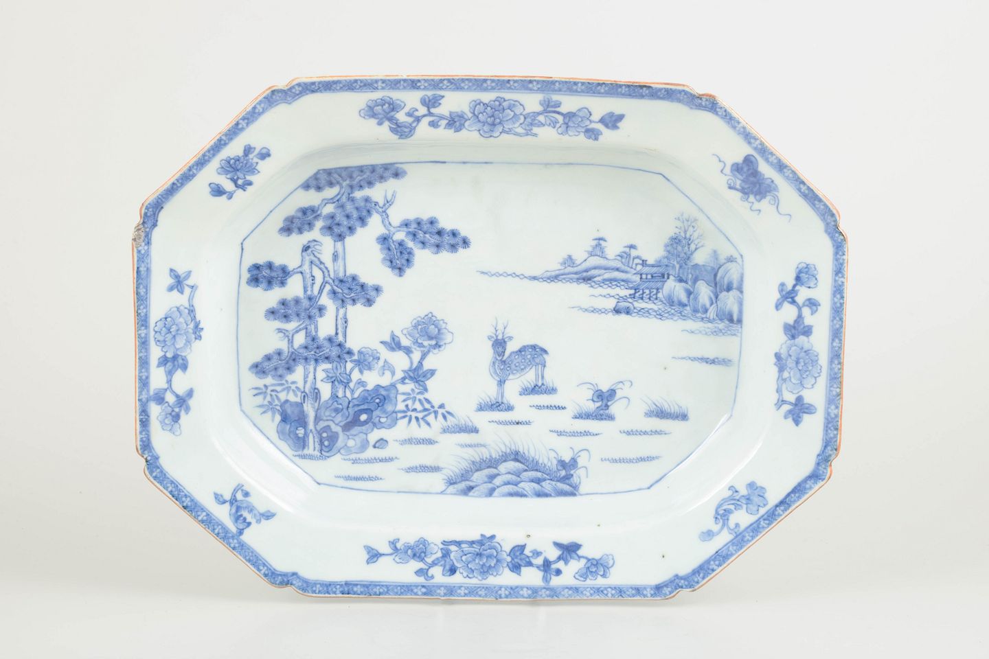 Håndmalet porcelænsfad i ottekantet form med klassisk blå-hvid dekoration. Motivet viser landskab med hjort, træer og pavillon, omgivet af blomsterbort langs kanten.