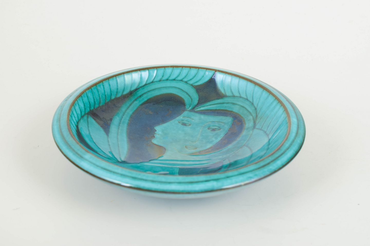 Lav skål i glaseret stentøj med karakteristisk struktureret overflade og bløde, organiske linjer i typisk 1960’er-stil.