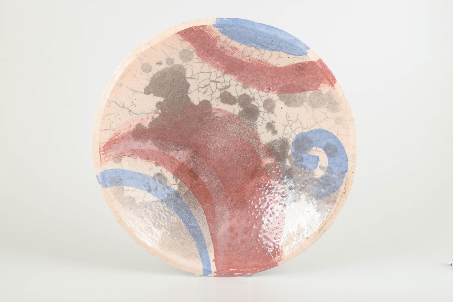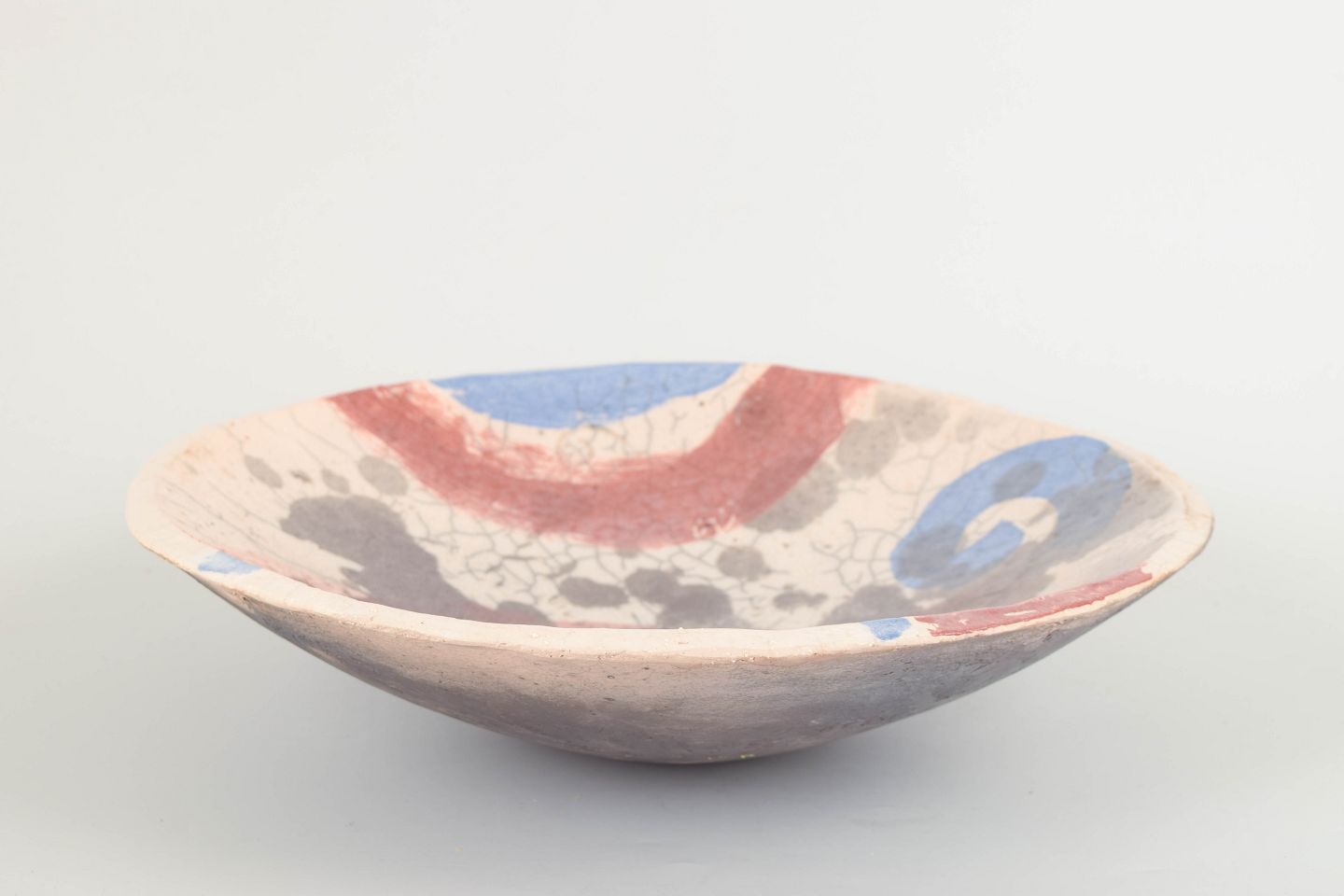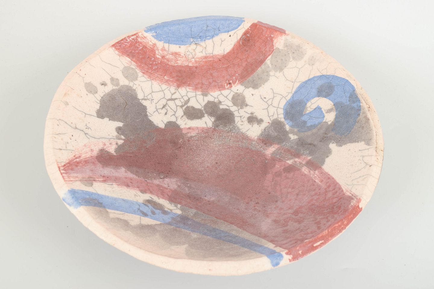 Hånddrejet skål med abstrakt dekoration i røde, blå og grå nuancer over en glasur med krakeleringseffekt. Undersiden signeret af kunstneren.