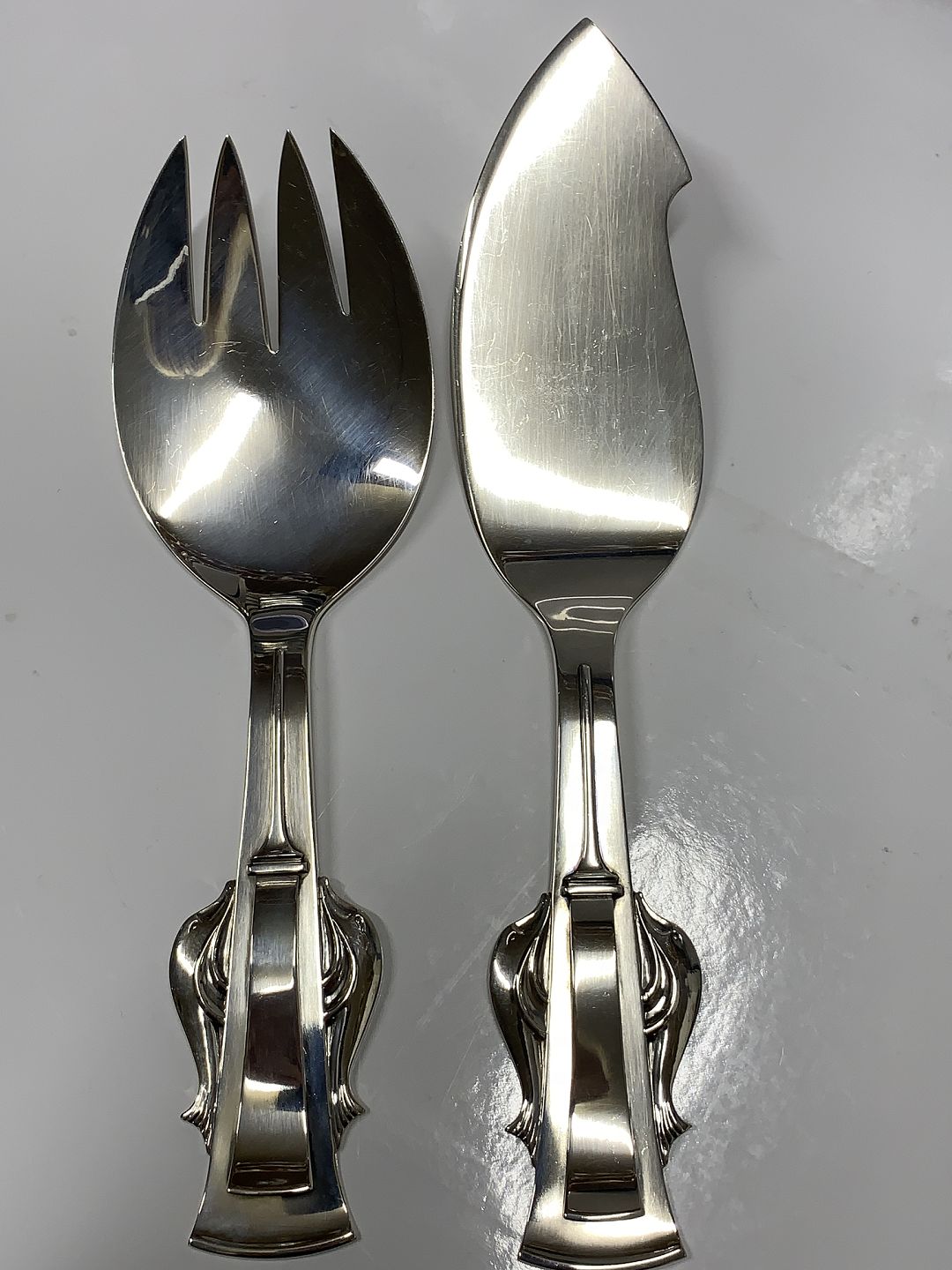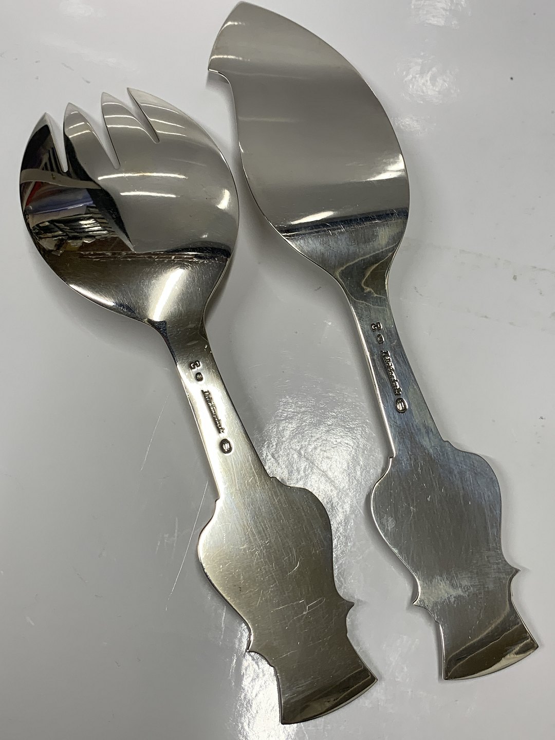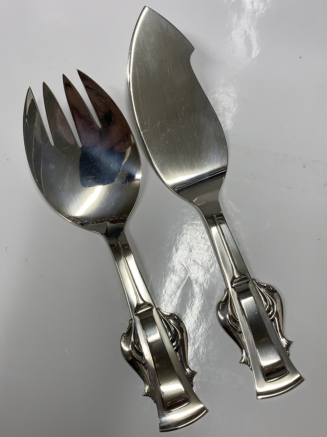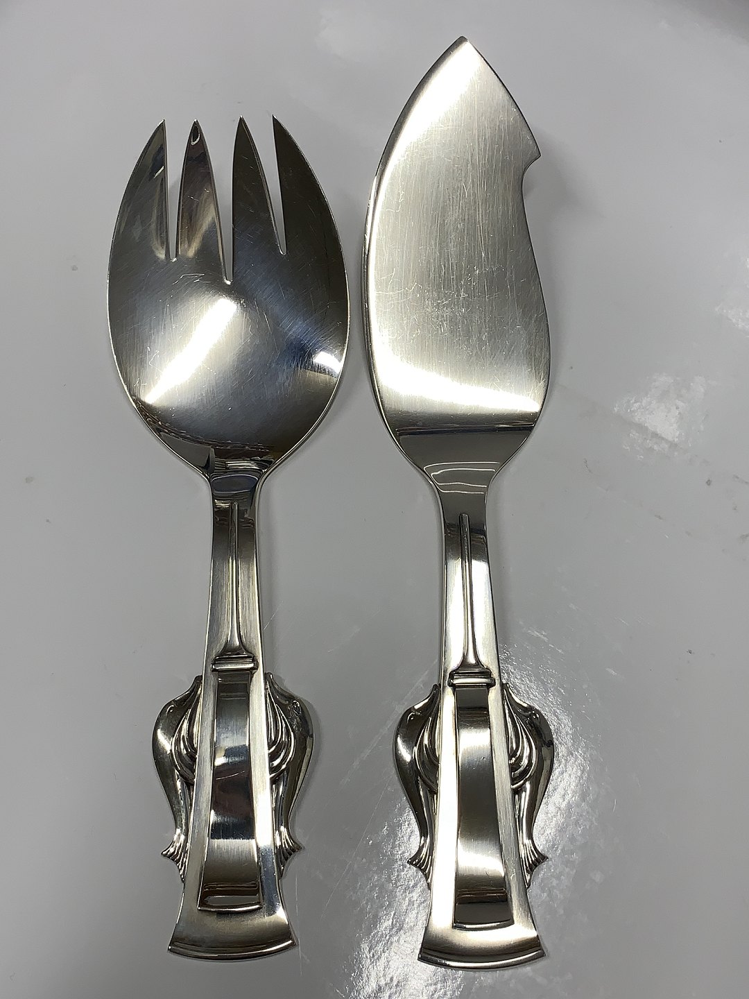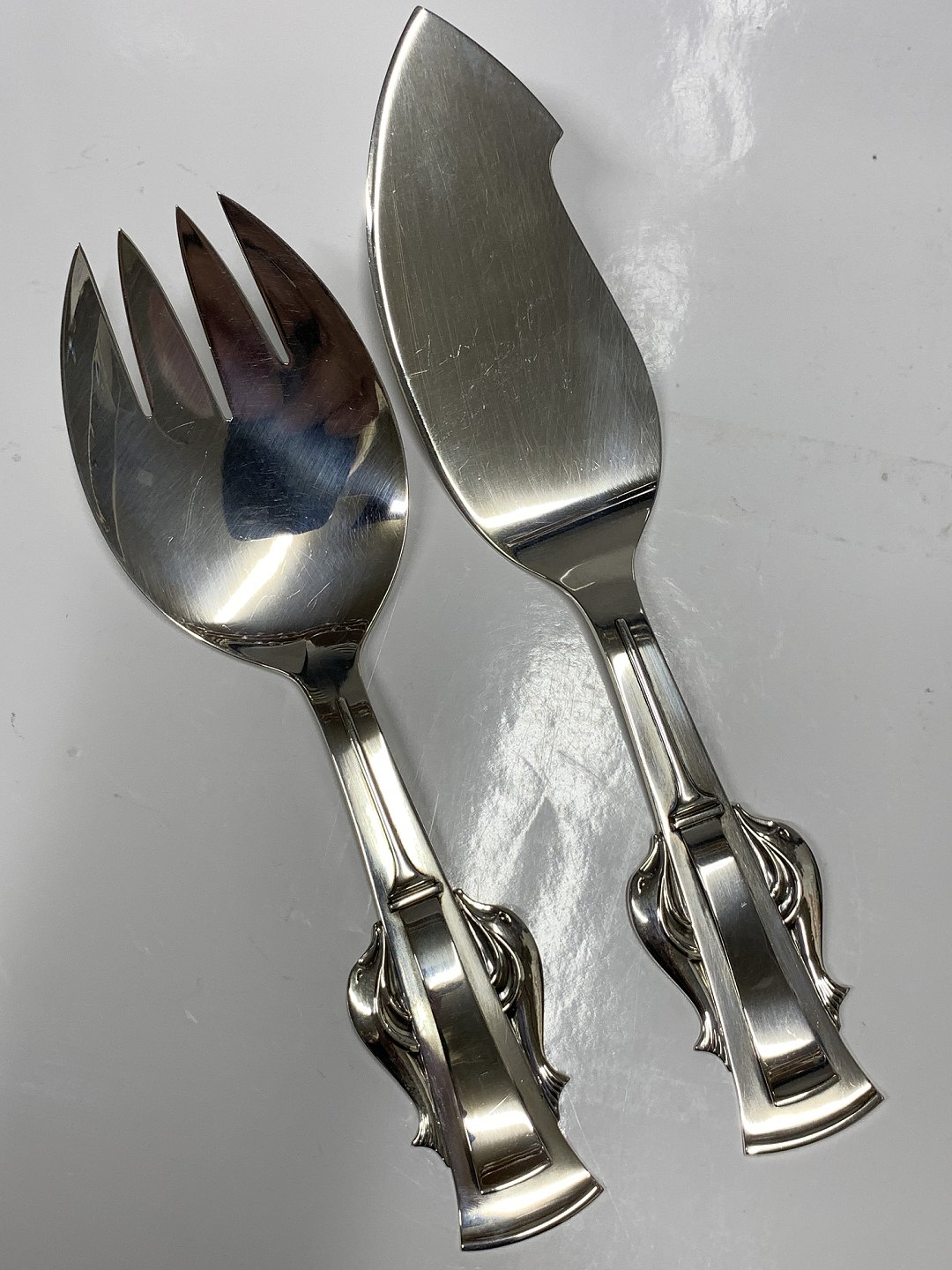 Fiskeserveringssæt med Delfiner i sølv Carl M. Cohr Længde 22,5 og 25,5 cm