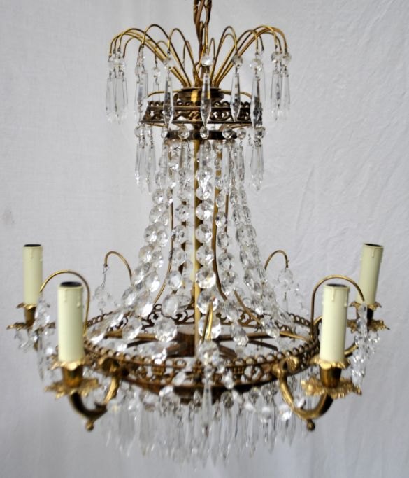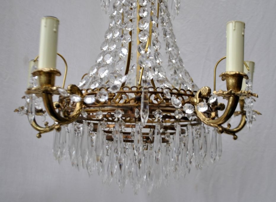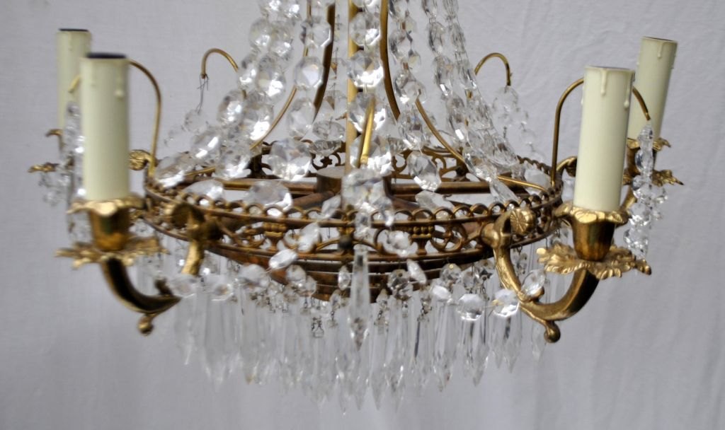 Prismenleuchter, 20. Jahrhundert. Aus Messing, verziert mit Blättern und Girlanden. Für 5 elektrische Kerzen. Anzahl der Prismen: 508 Stück. Höhe: 75 cm. Durchmesser: 53 cm.Bestellnummer: 28542