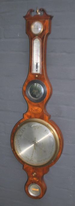 Englisches Radbarometer. 19. Jahrhundert. J. Verga Chester. Stil Georg III. Mahagonigehäuse mit Intarsien. Signiert. Länge: 110 cm. Durchmesser: 31 cm.Bestellnummer: 28544