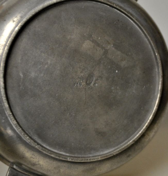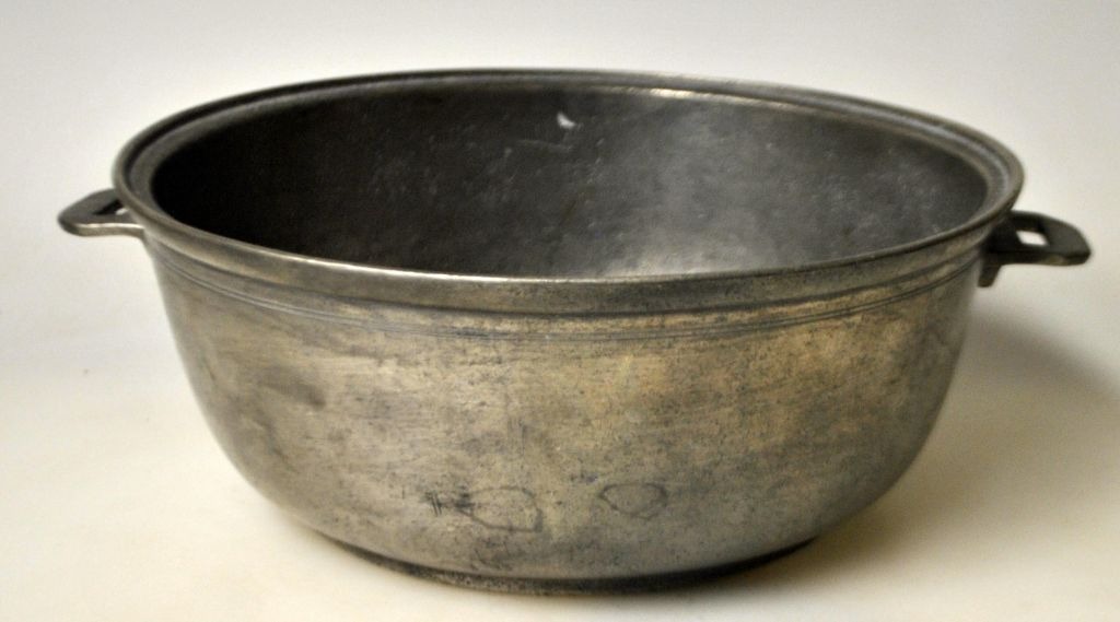 Antiker Topf mit zwei Henkeln aus Zinn, 19. Jahrhundert. Gestempelt. Meistermarke und 44. H.: 8 cm. Durchmesser: 21 cm.Bestellnummer: 28452