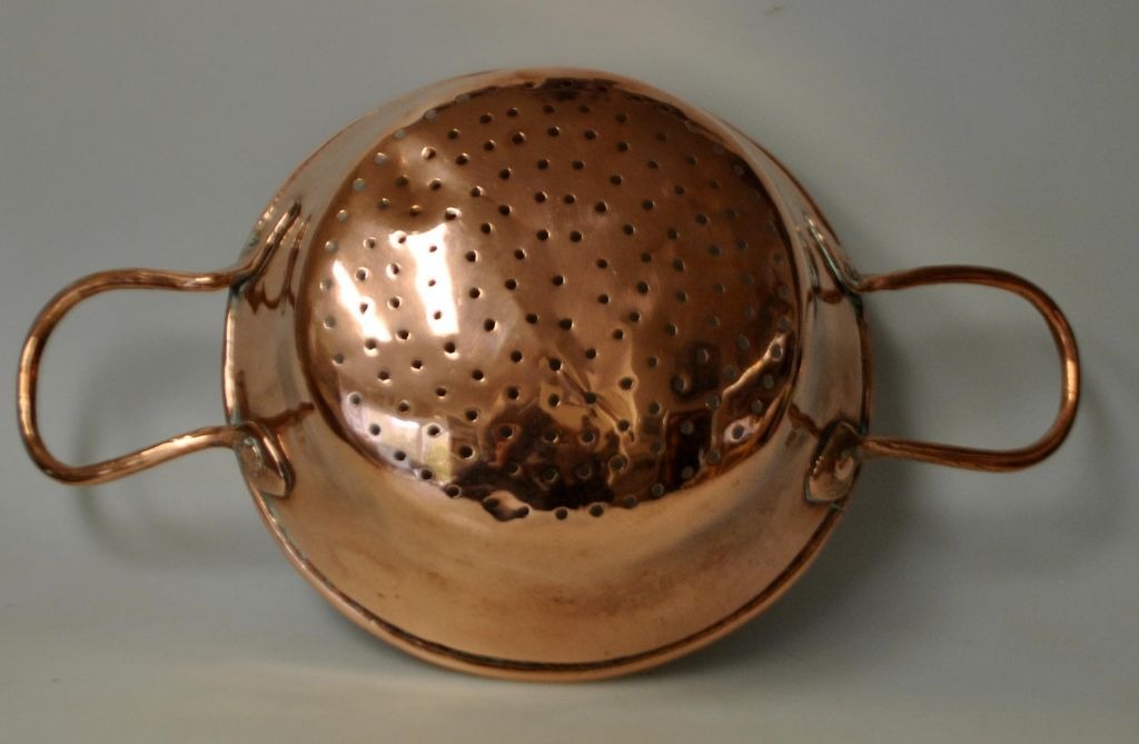 Kupfersieb, 19. Jahrhundert. Dänemark. Ohne Stempel. L: 35 cm. H: 9 cm. Durchmesser: 21 cm.Herkunft: Die inzwischen geschlossene Schwanenapotheke in Randers.