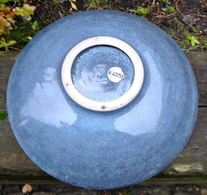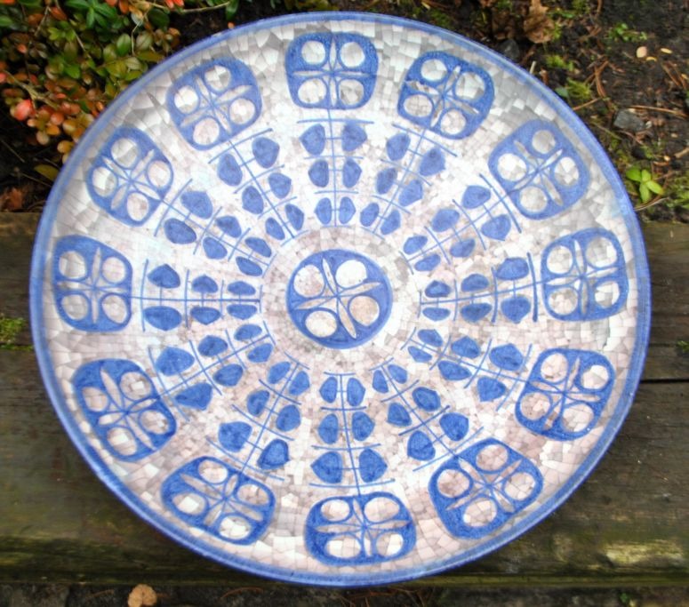 Keramikschale Nr. 4106-3 von Michael Andersen & Søn, Bornholm, Dänemark, nach 1930. Dekoriert in Blau- und Grautönen auf Mosaikgrund. Signiert MS und mit drei Fischen gestempelt. Durchmesser: 40 cm.Bestellnummer: 28554