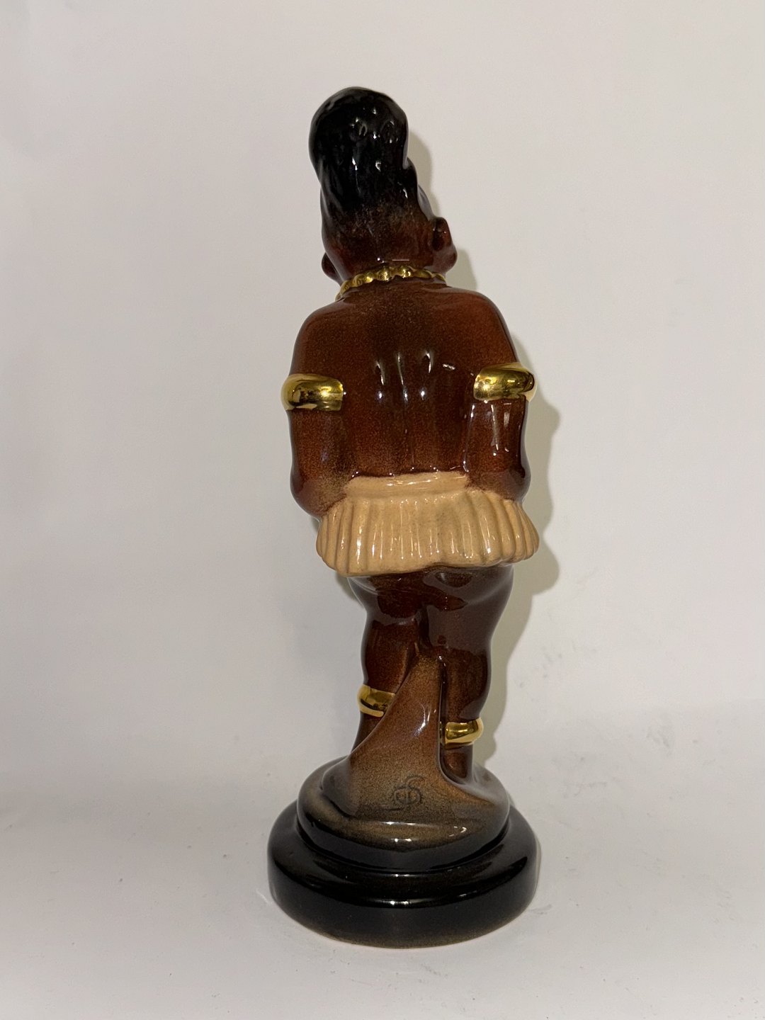 Figur i keramik af afrikansk kvinde i skørt. Fremstillet på det bornholmske keramik værksted Johgus. Fremstår i god stand. Signeret af kunstneren på bagsiden. Fabriksmærket på bunden. H. 21,5 cm
