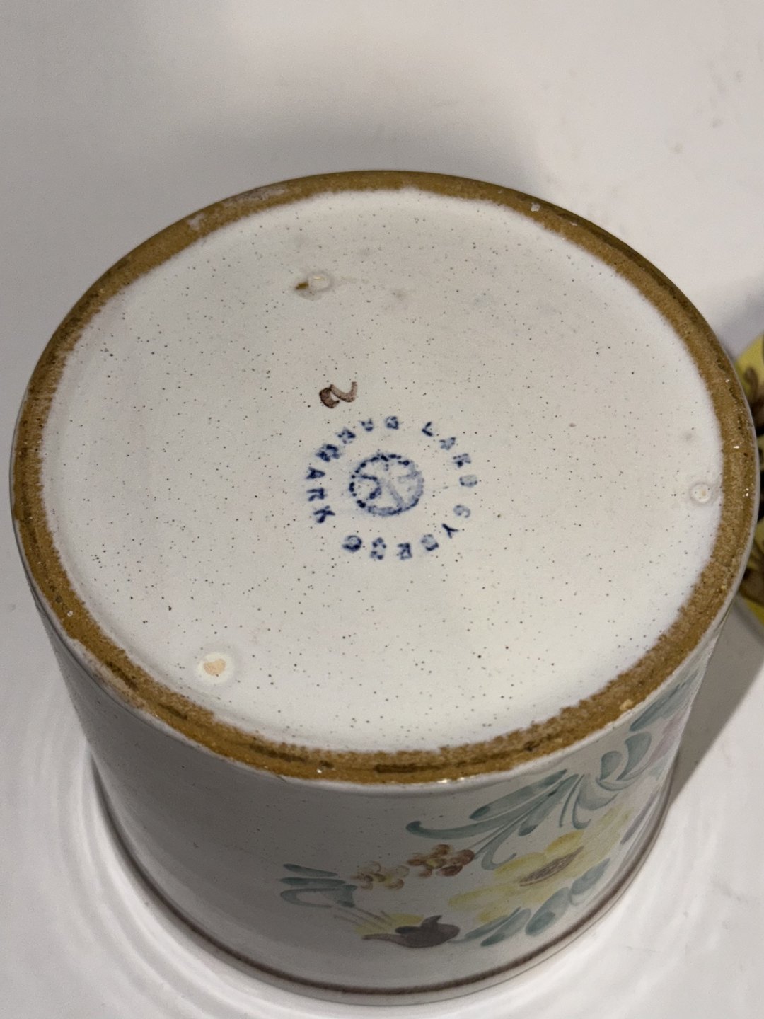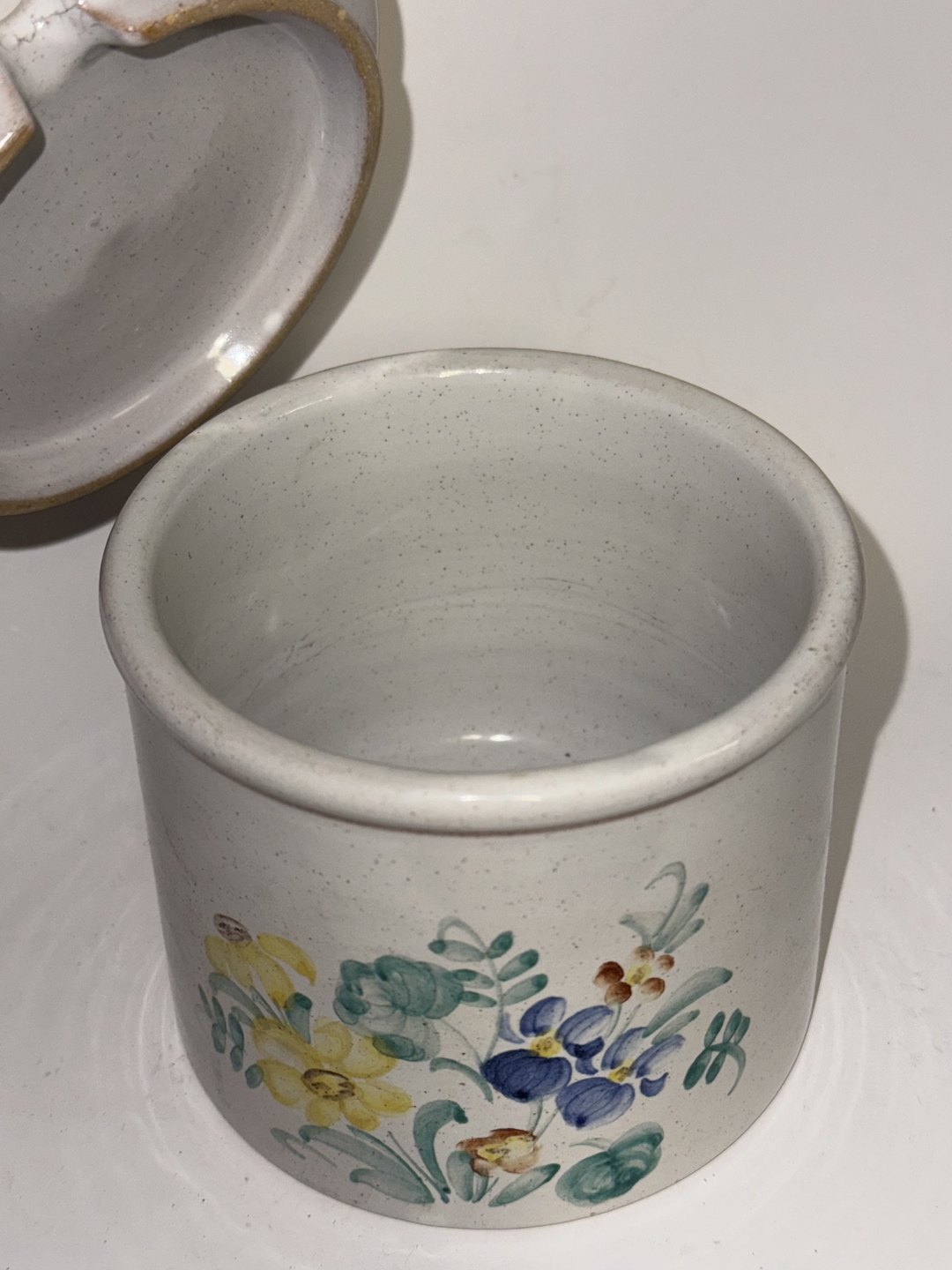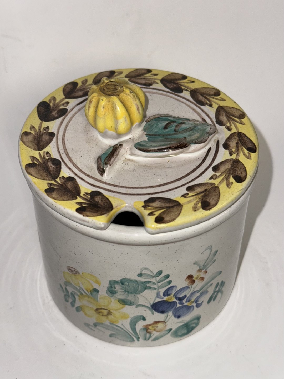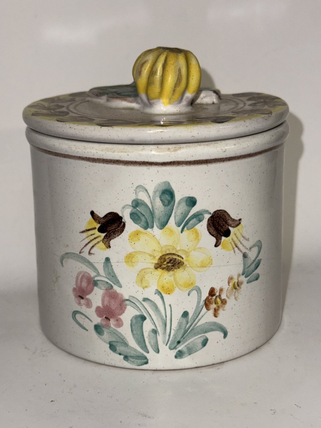 Marmeladekrukke med låg i keramik. Fremstår i god stand.fabriksmærket på bunden. H. 11,5 cm. Bundens diameter er 10 cm.