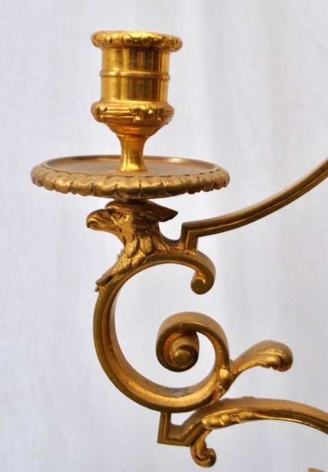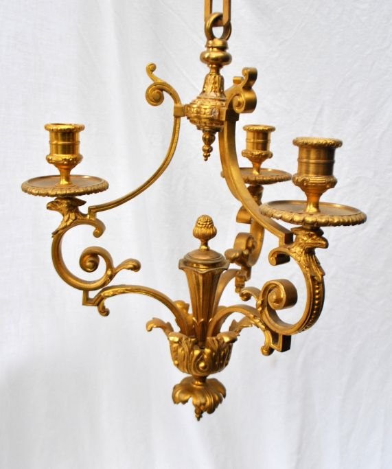 Französischer, vergoldeter Bronze-Kronleuchter mit drei Leuchten, 19. Jahrhundert. Aufhängung an einer Kette. Leuchtenarme in Form von Adlerköpfen. Höhe mit Kette: 71 cm.Ein wahrhaft wunderschönes Exemplar!